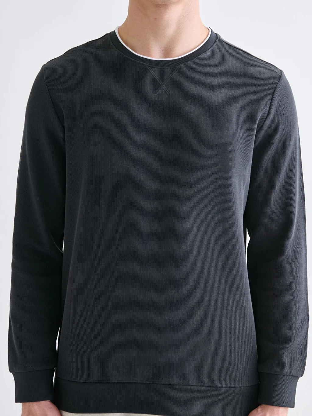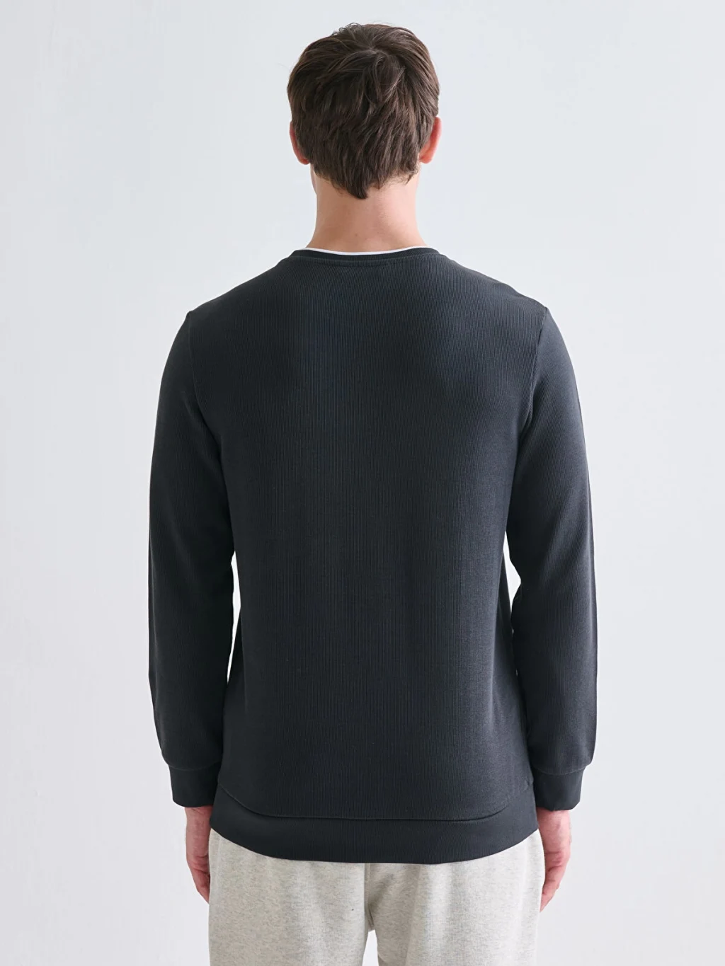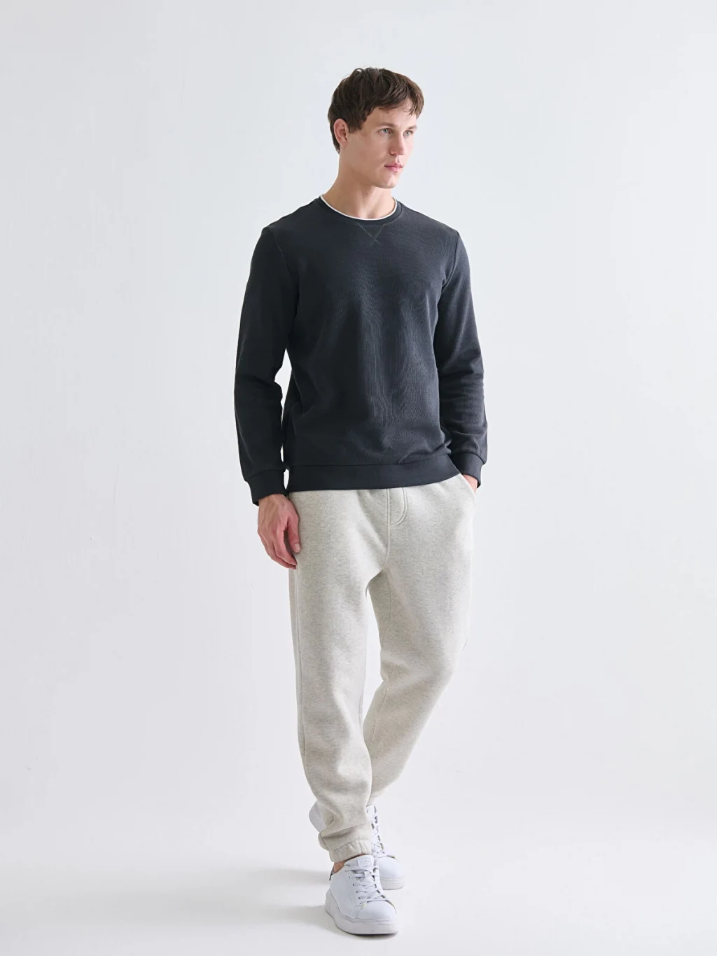 Selanik kumaştan üretilen erkek sweatshirt, bisiklet yakalı ve uzun kolludur. Kol uçları ve etek ucu ribanalıdır. Bisiklet yaka, uzun kollu erkek sweatshirt, selanik kumaştan üretilmiştir. Manşetleri ve etek ucu ribanalıdır.