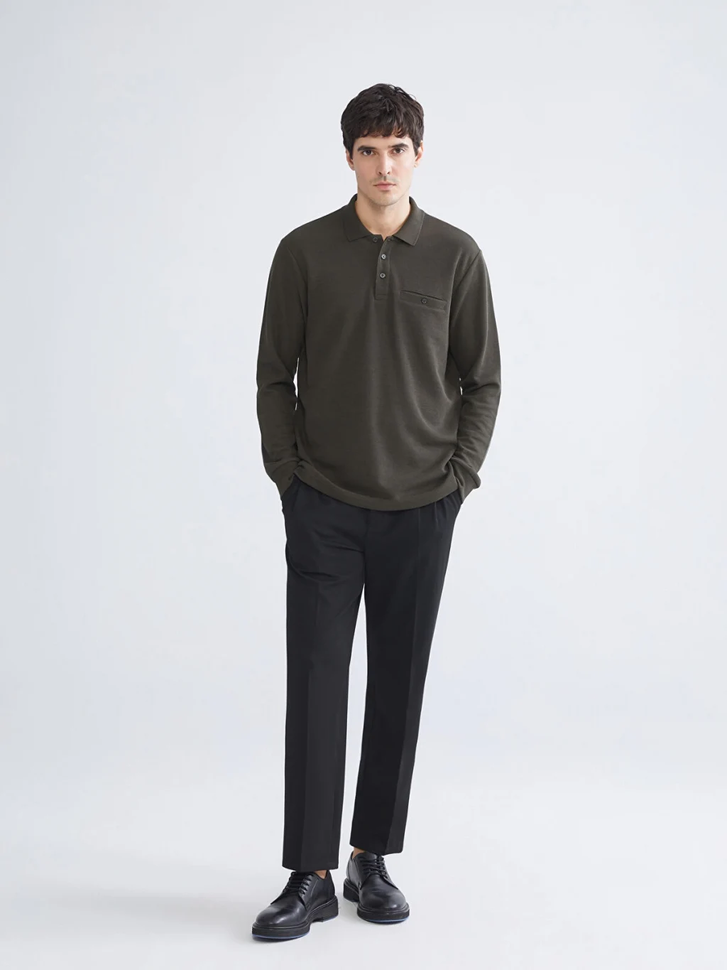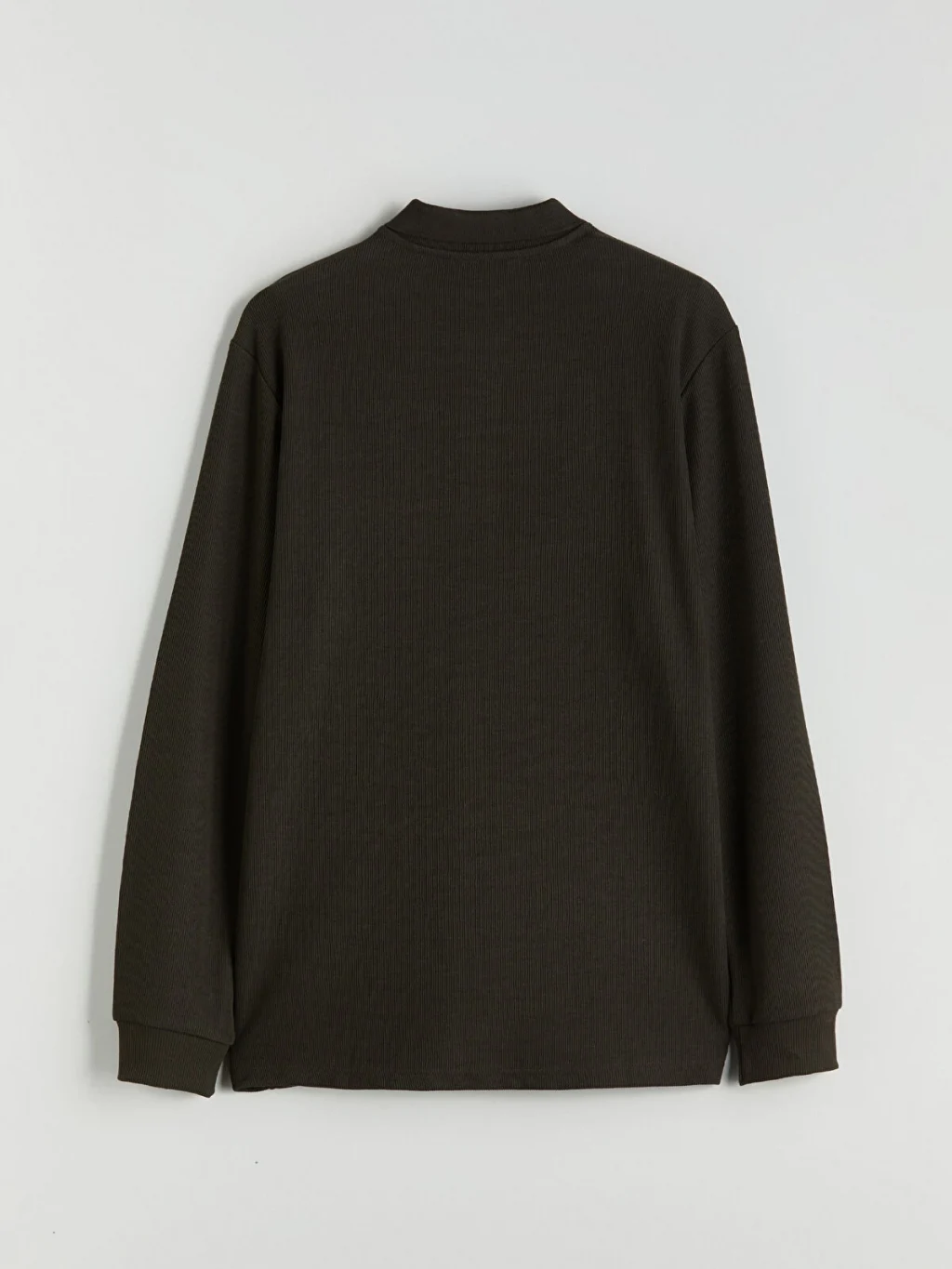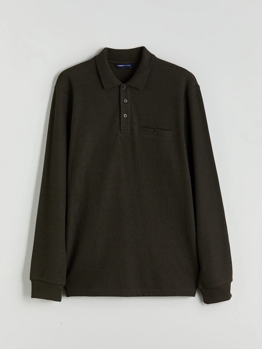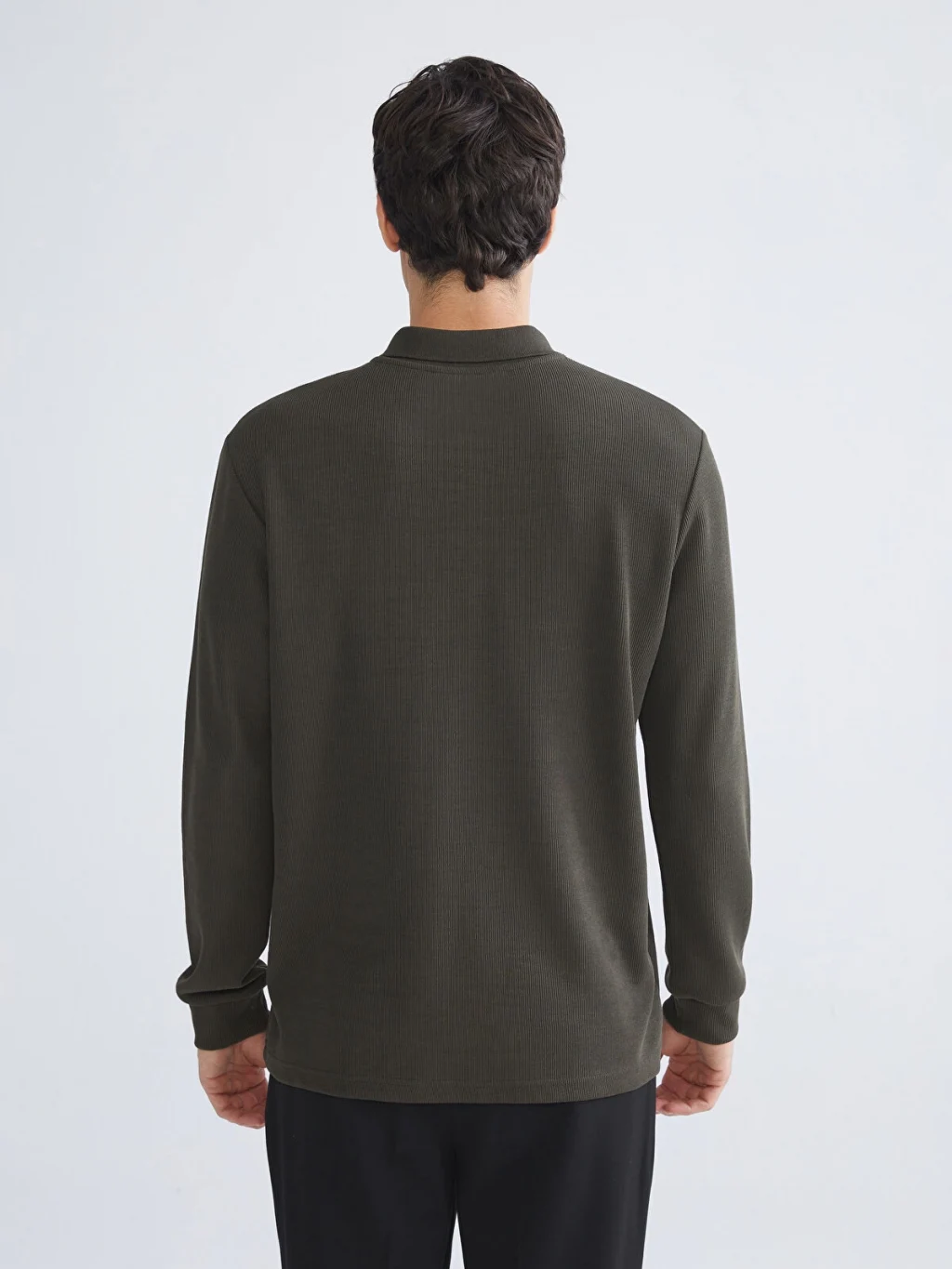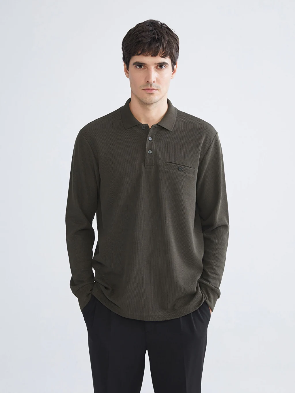Polo yakalı ve uzun kollu erkek sweatshirt, orta kalınlıkta selanik kumaştan üretilmiştir. Düğme kapamalıdır ve tek göğüs cebi bulunur.
