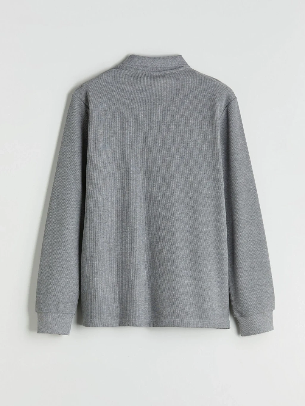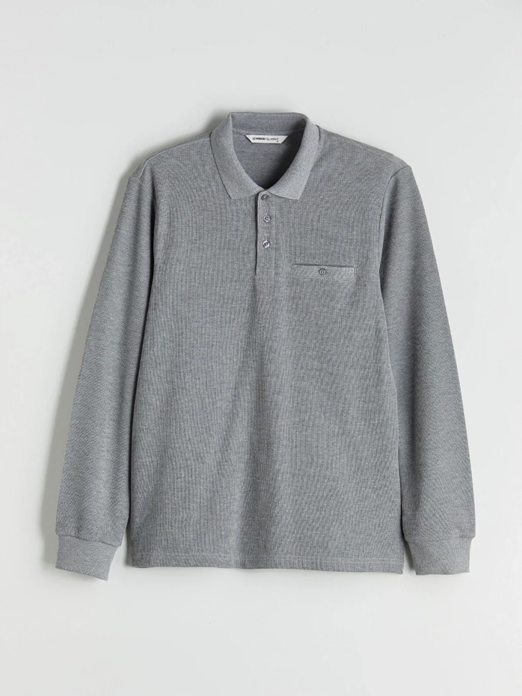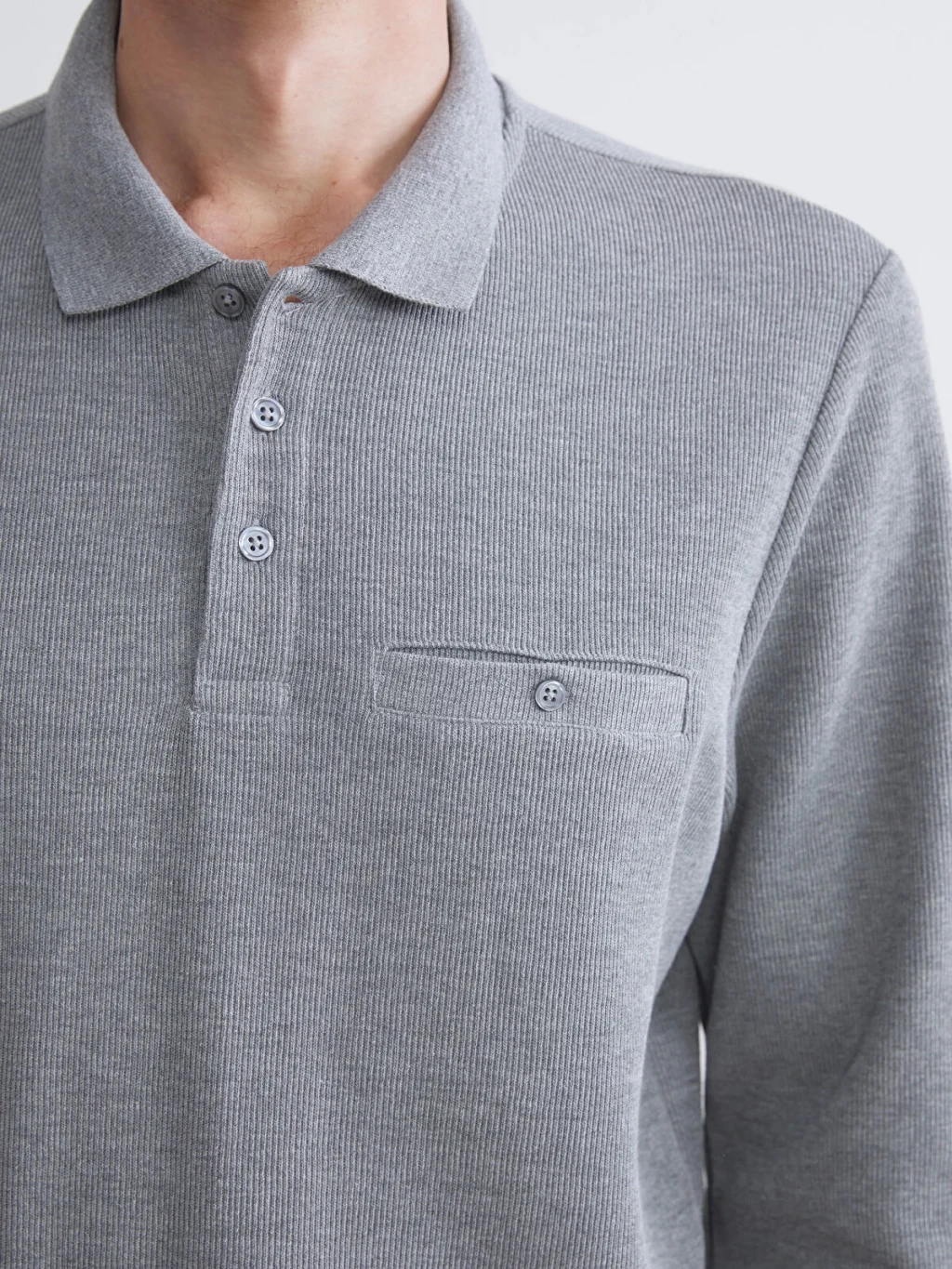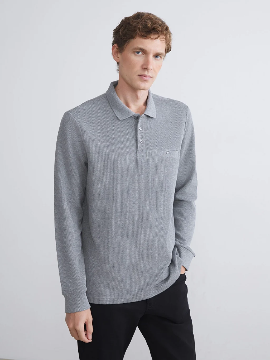 Polo yakalı, uzun kollu ve göğüs cepli erkek sweatshirt, selanik kumaştan üretilmiştir. Düğme kapamalıdır ve kol uçları ribanalıdır.