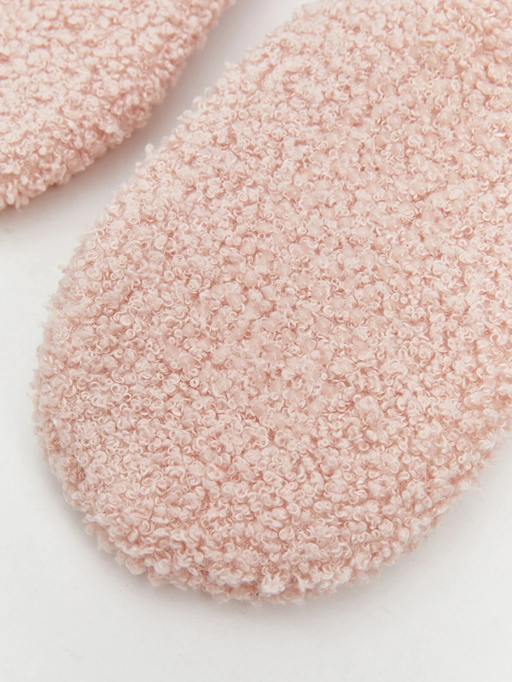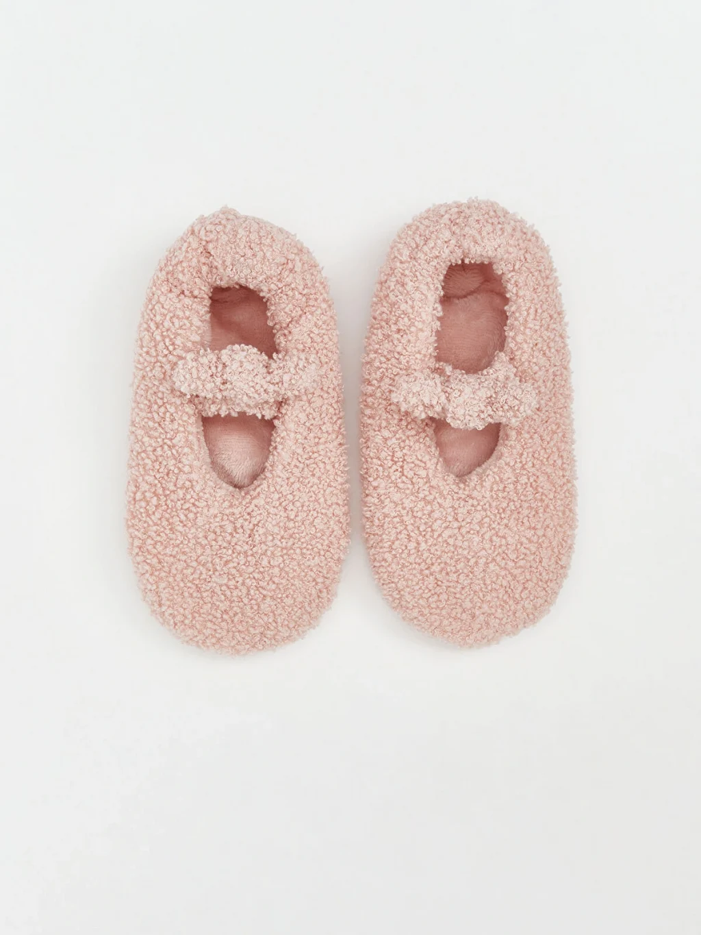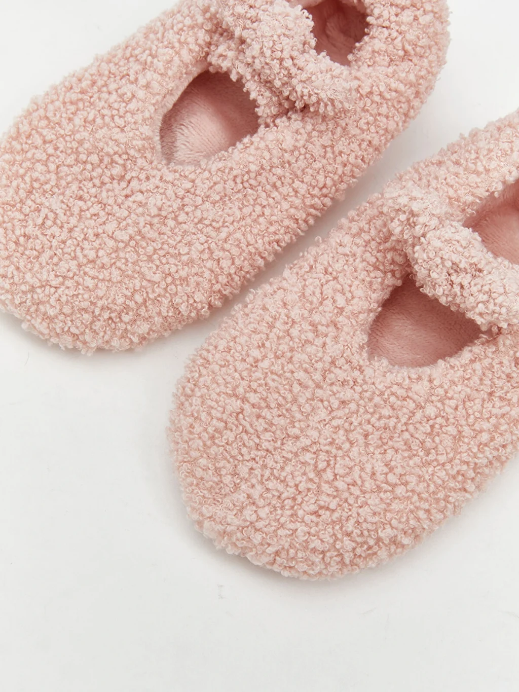 Kız çocuk ev çorabı, pelüş dokulu kumaştan üretilmiştir ve ön kısmında kumaşından fiyonk detayı bulunur.