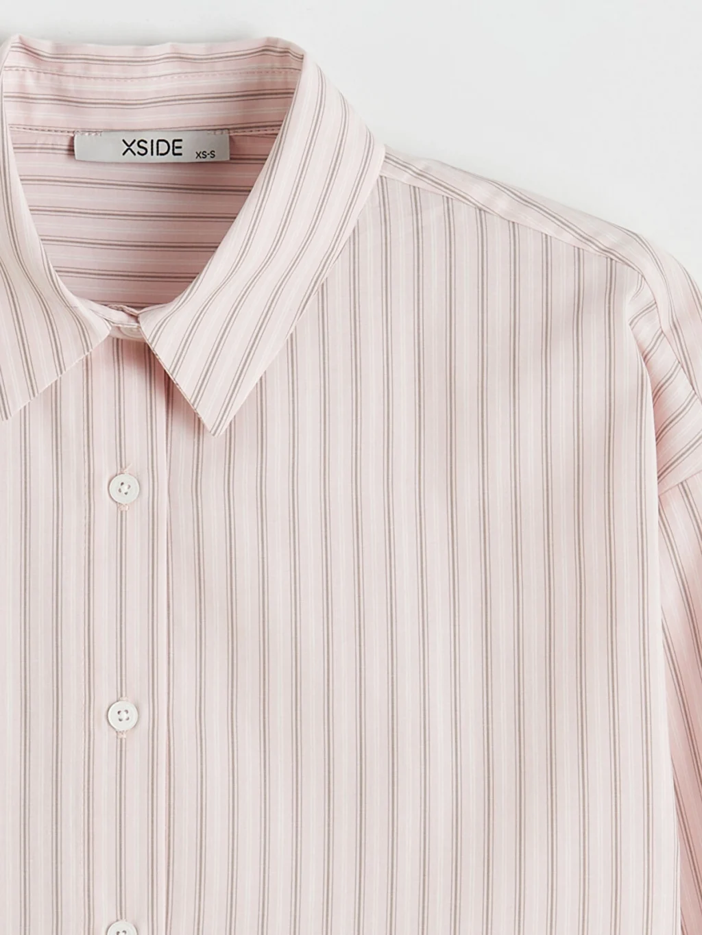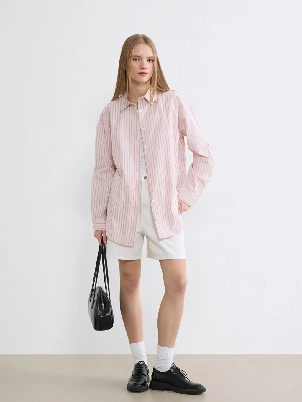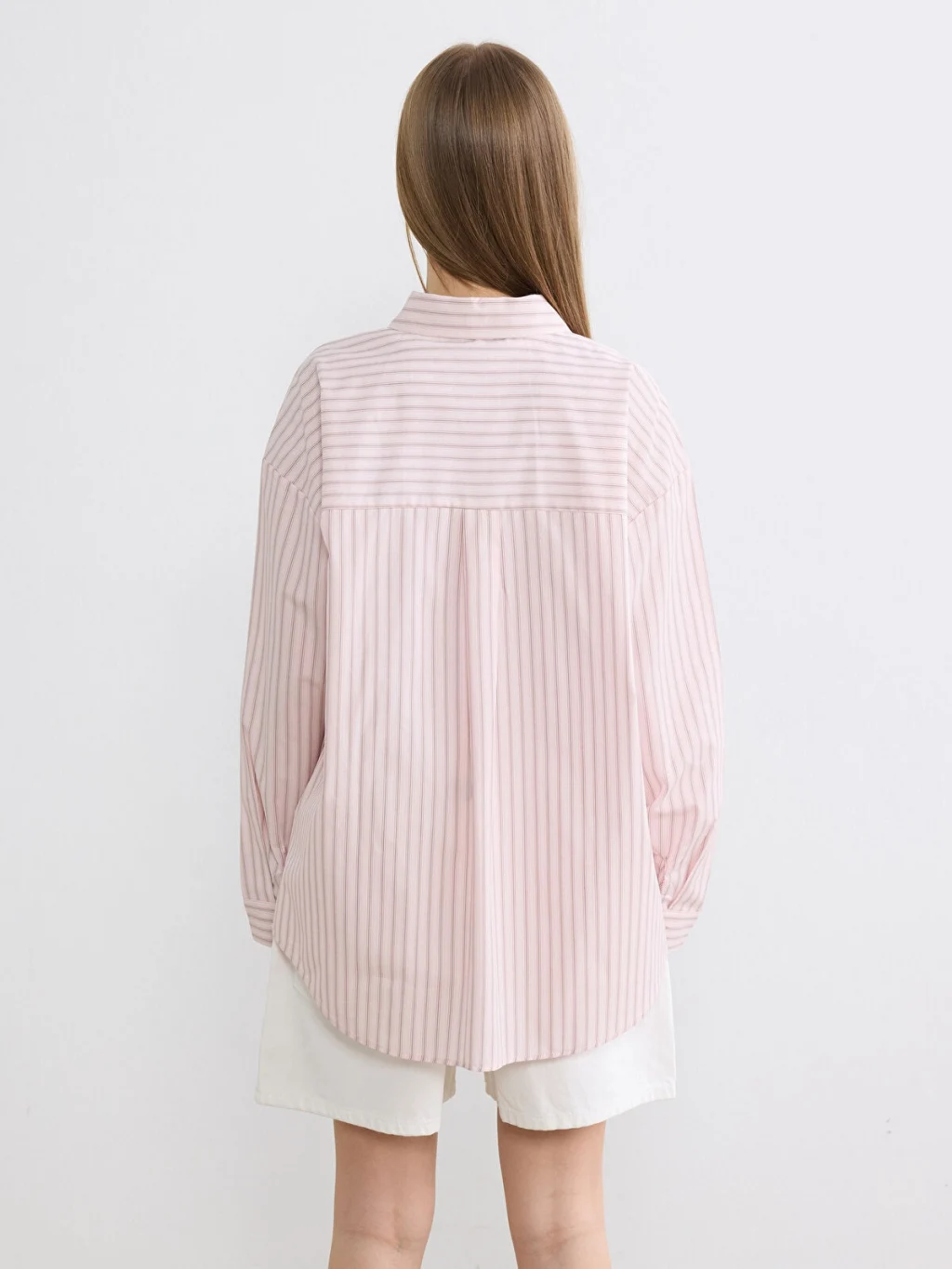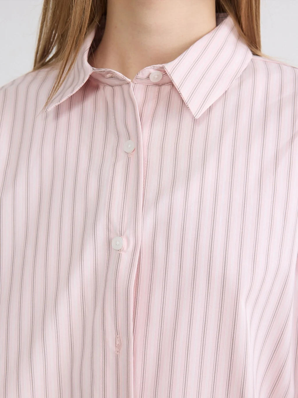 Uzun kollu, çizgili desenli kadın gömlek, %100 pamuk içerikli oxford kumaştan üretilmiştir ve önden düğme kapamalıdır.