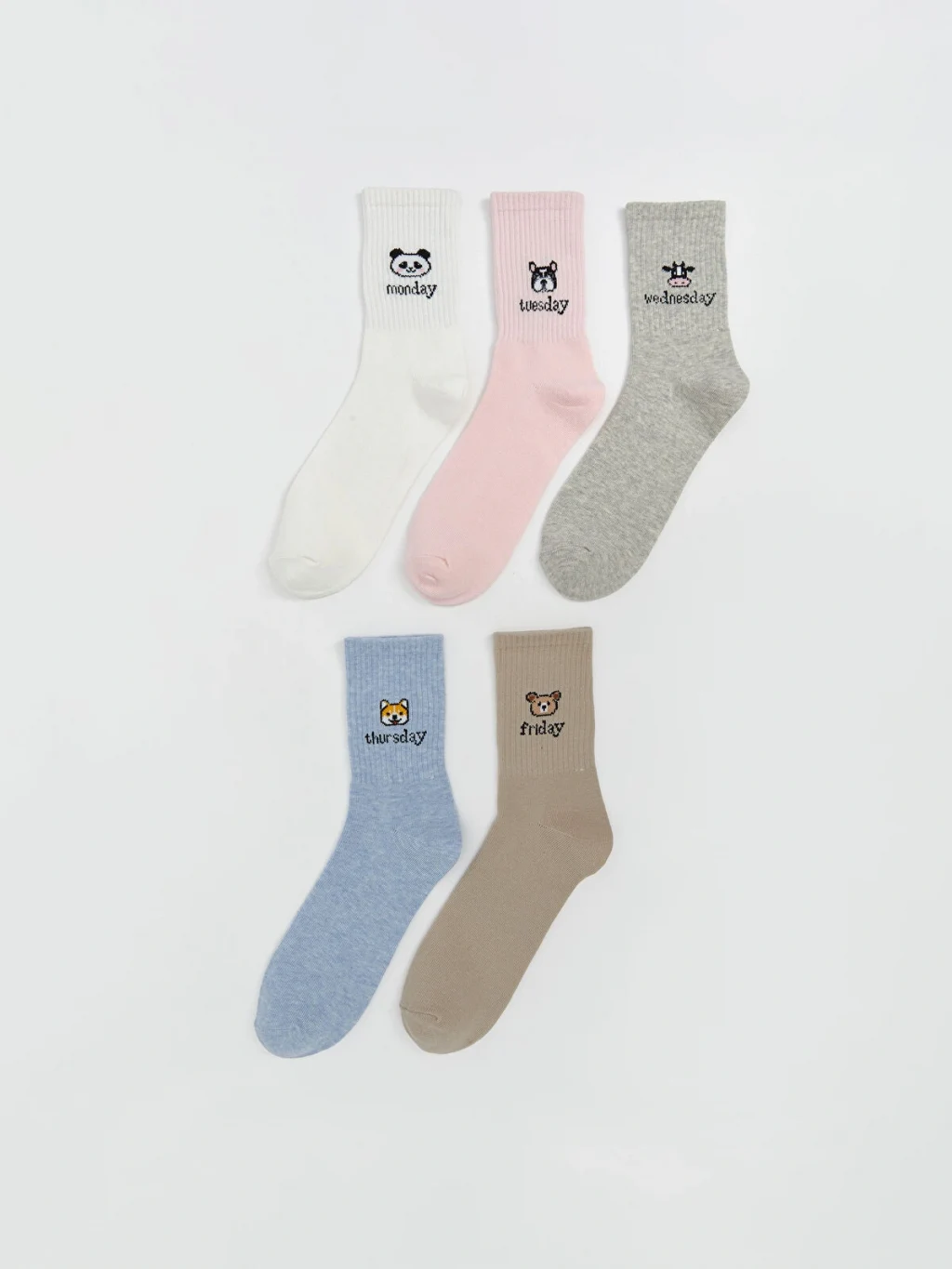 Beş çiftten oluşan kadın soket çorap seti, baskılı farklı tasarımlara sahiptir. Pamuk karışımlı kumaştan üretilmiştir.