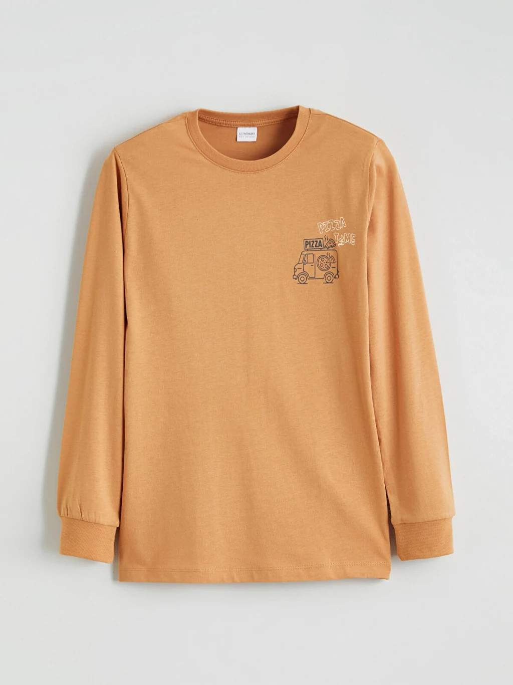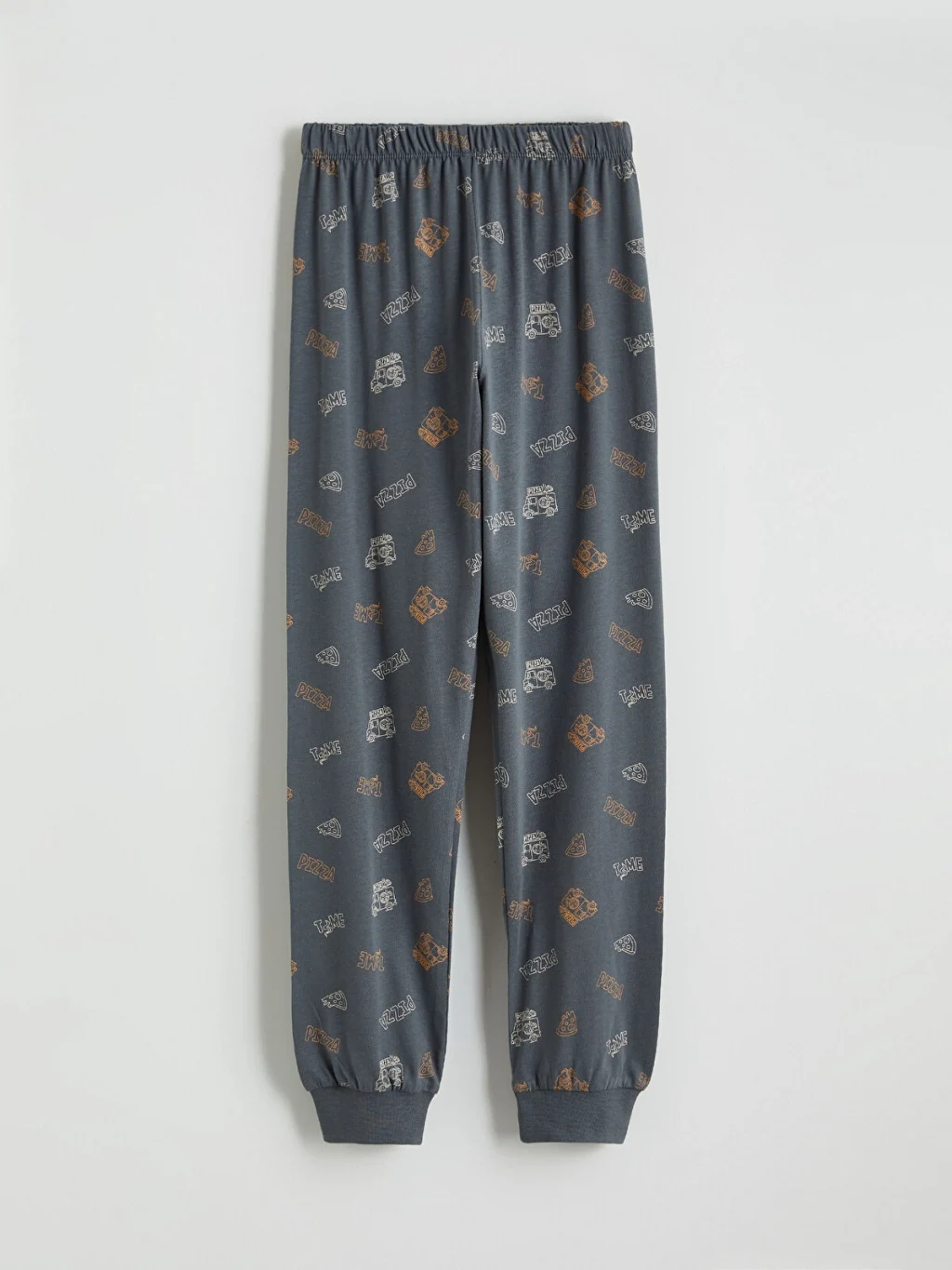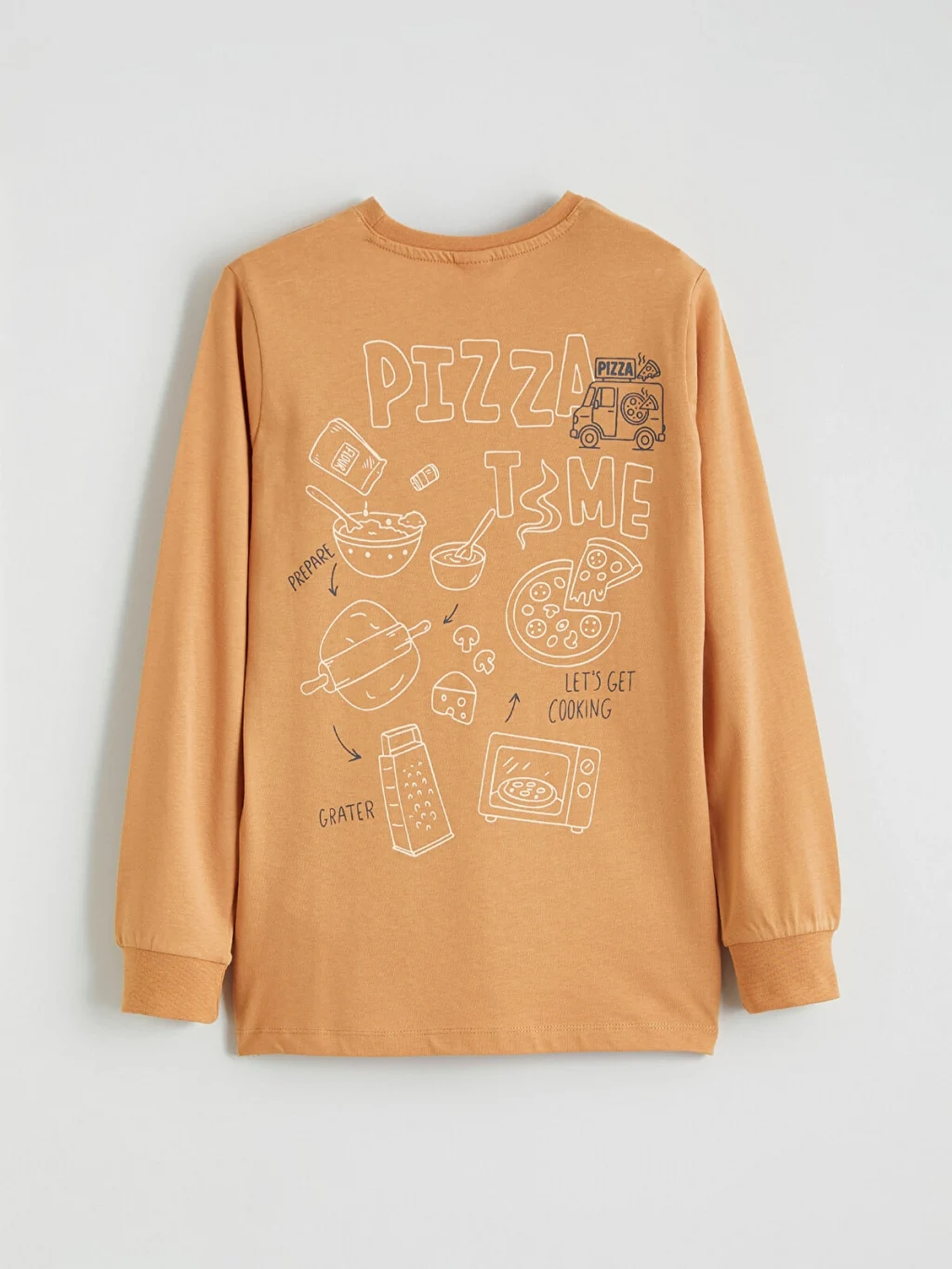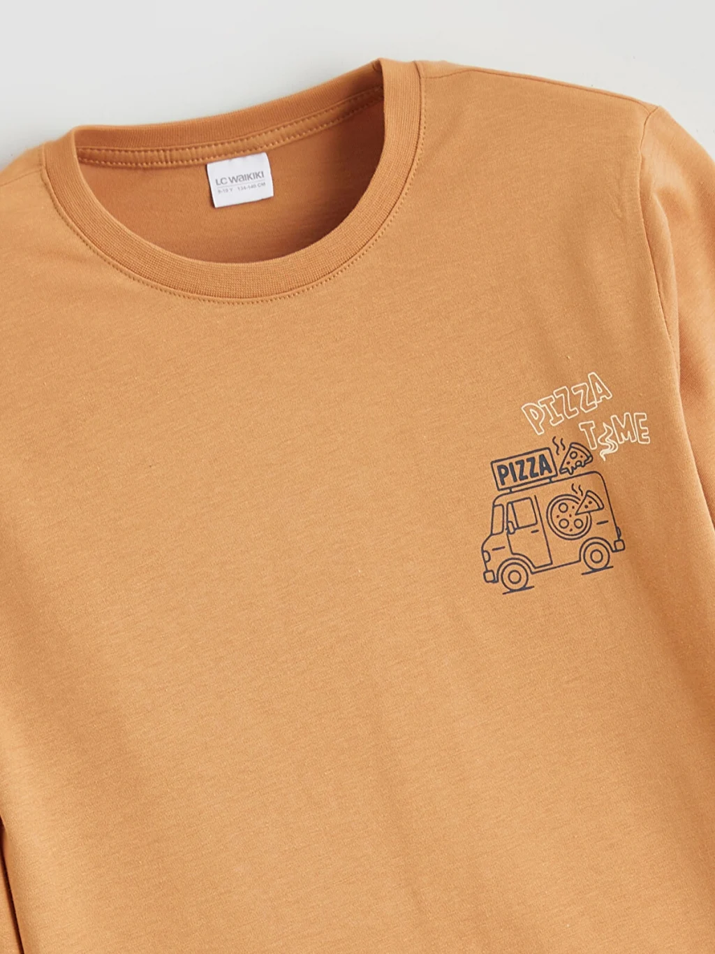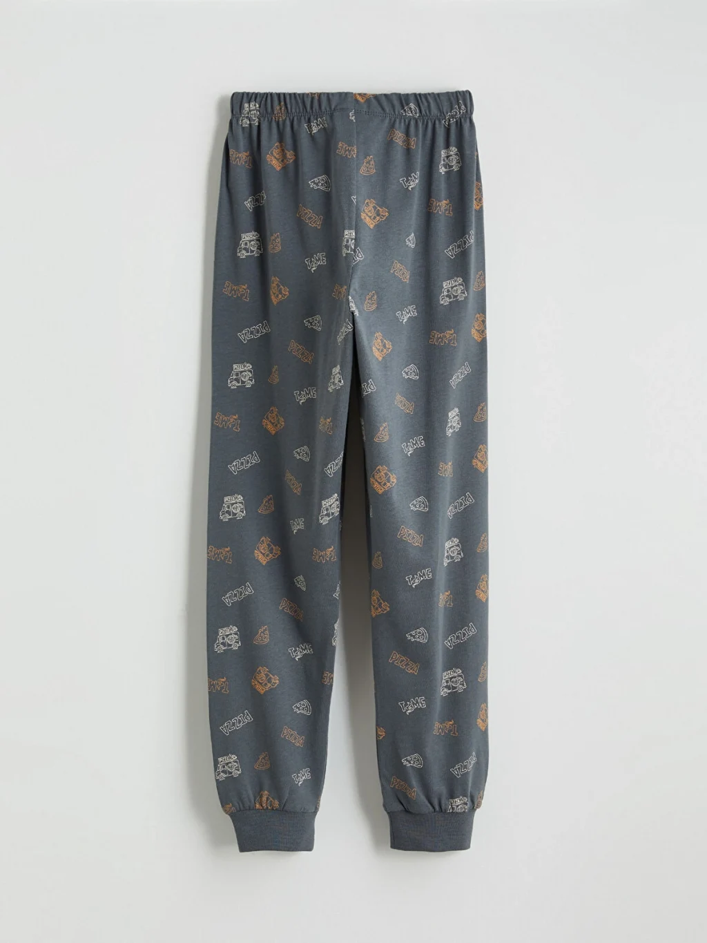 Bisiklet yaka, uzun kollu üst ve desenli, paçaları ribanalı alttan oluşan erkek çocuk pijama takımı, %100 pamuklu penye kumaştan üretilmiştir.