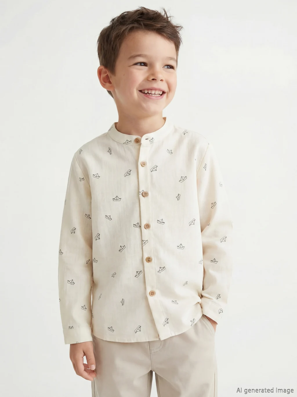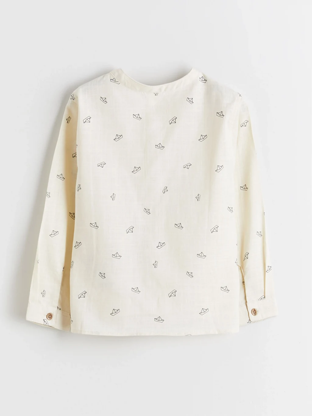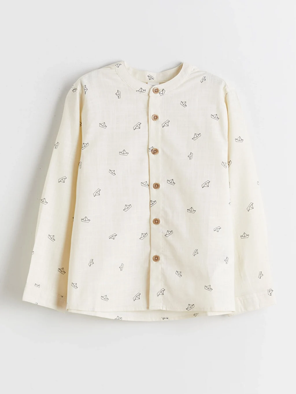Desenli, hakim yakalı ve uzun kollu erkek çocuk gömlek, %100 pamuk poplin kumaştan üretilmiştir. Önden düğme kapamalıdır.
