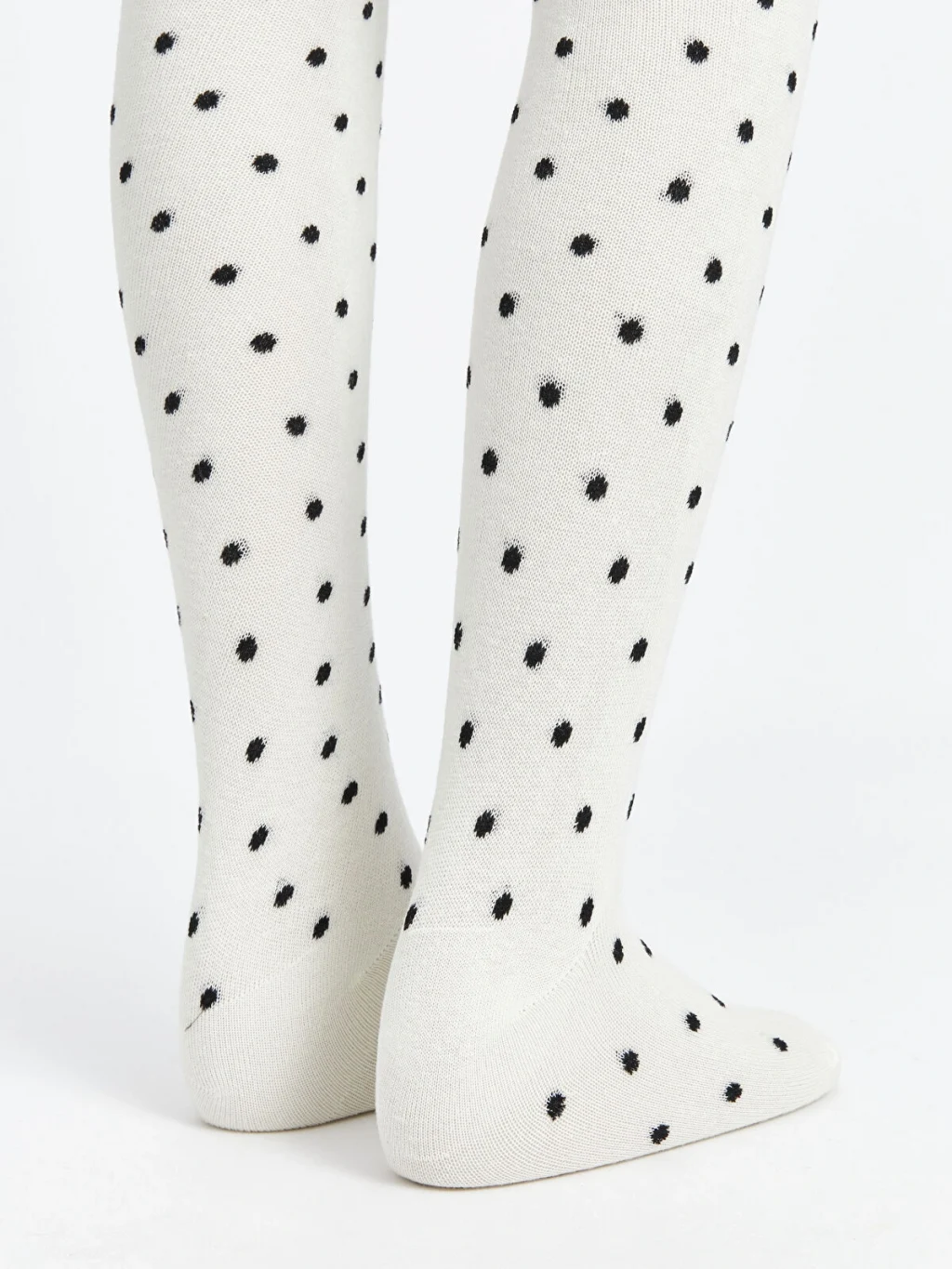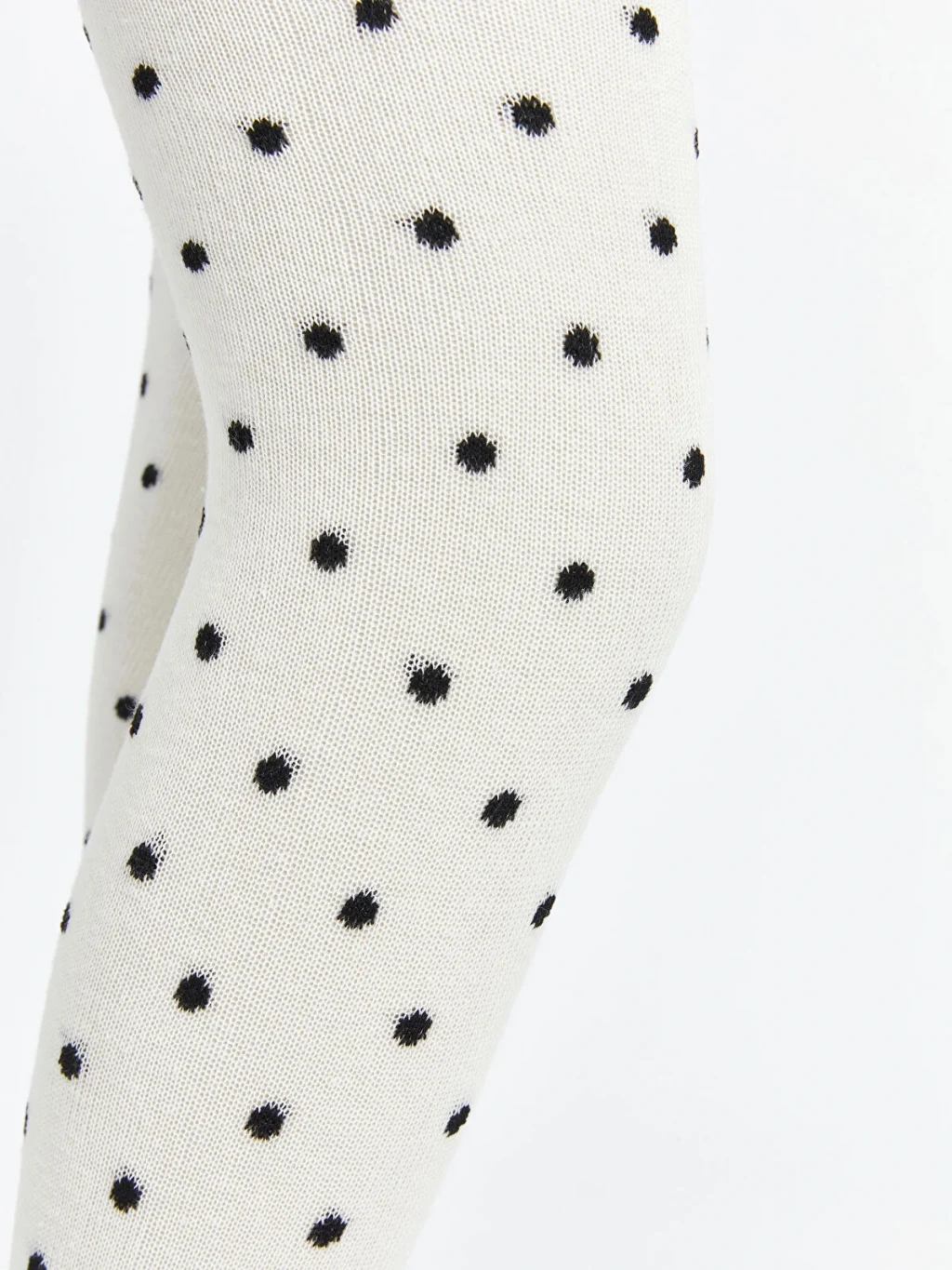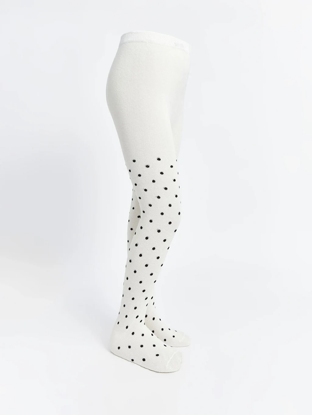 Beli lastikli, üst kısmı düz ve paçadan itibaren puantiye desenli olan kız çocuk külotlu çorap.