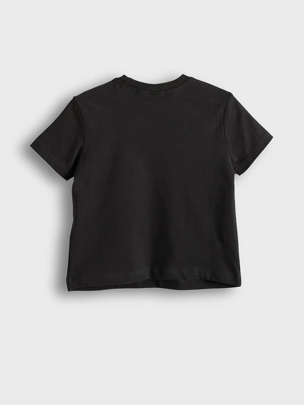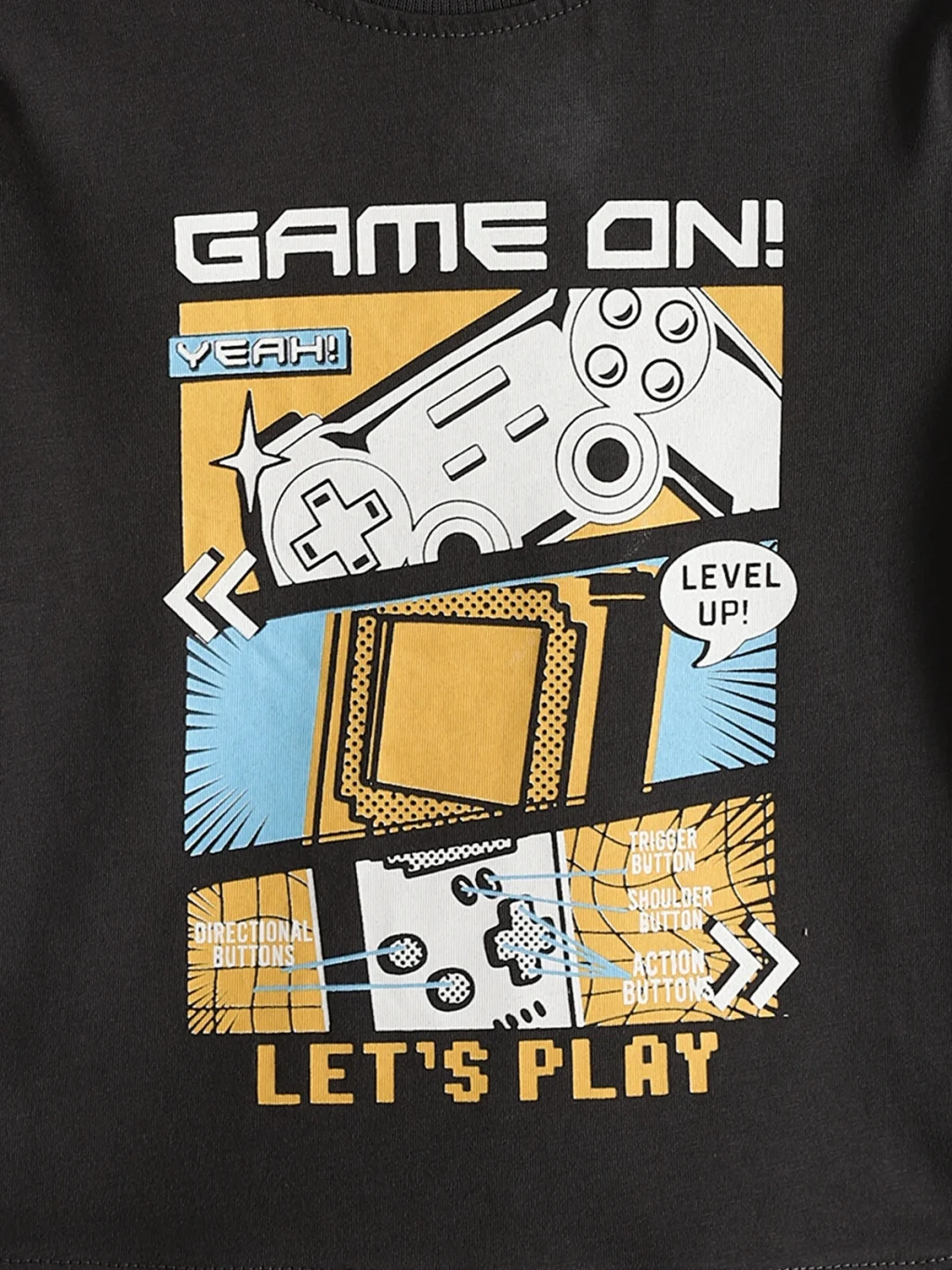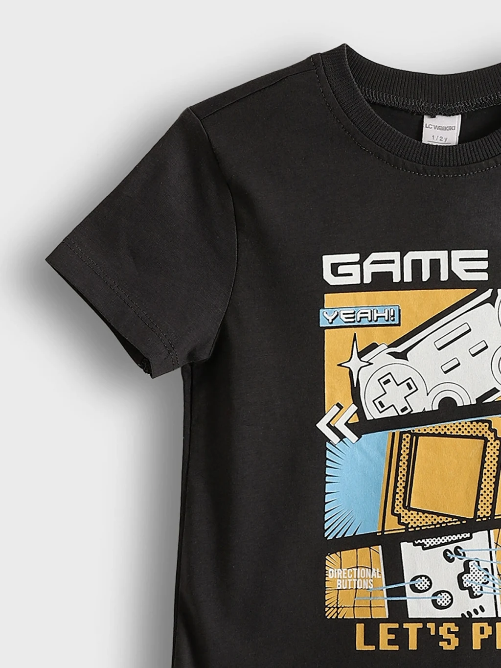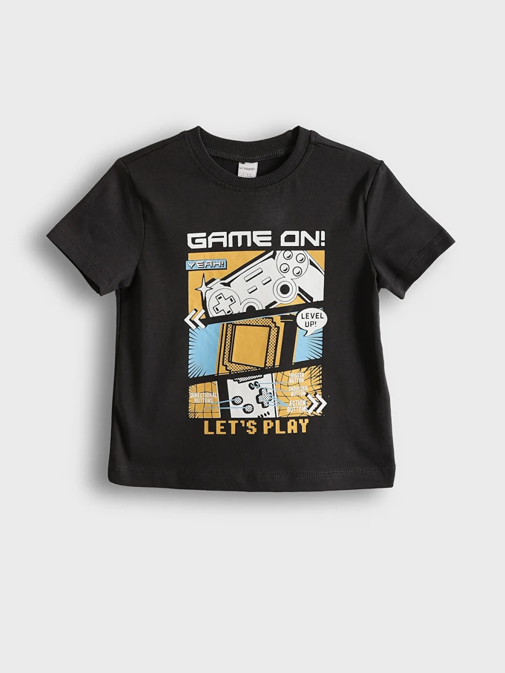Bisiklet yakalı ve kısa kollu erkek çocuk tişört, %100 pamuklu penye kumaştan üretilmiştir. Standart kalıplı ürünün ön yüzü baskılıdır.