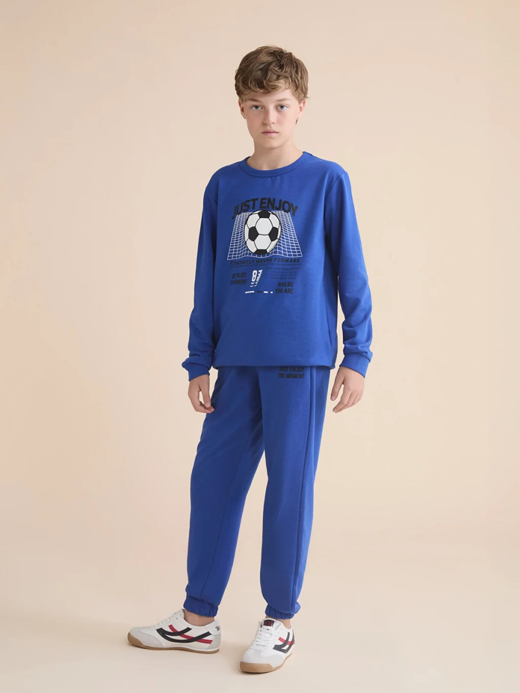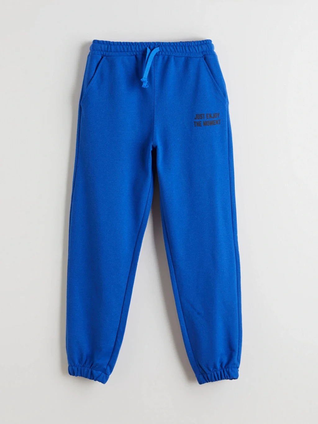 3 iplik kumaştan üretilen erkek çocuk eşofman altı, beli ve paçaları lastiklidir. Beli bağcıklı, iki cepli ve önü yazı baskılıdır.