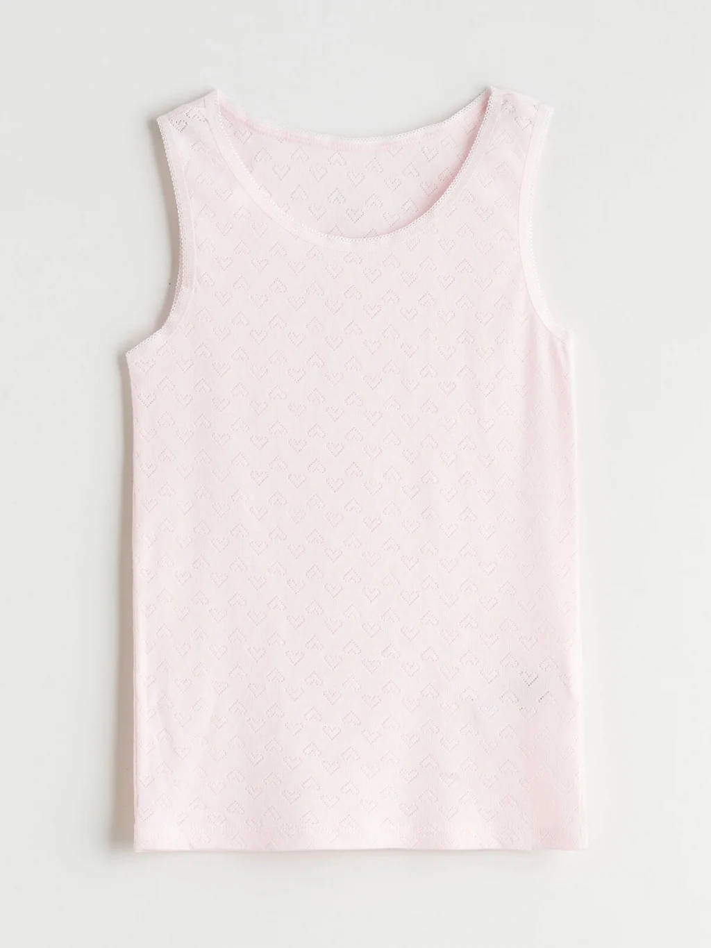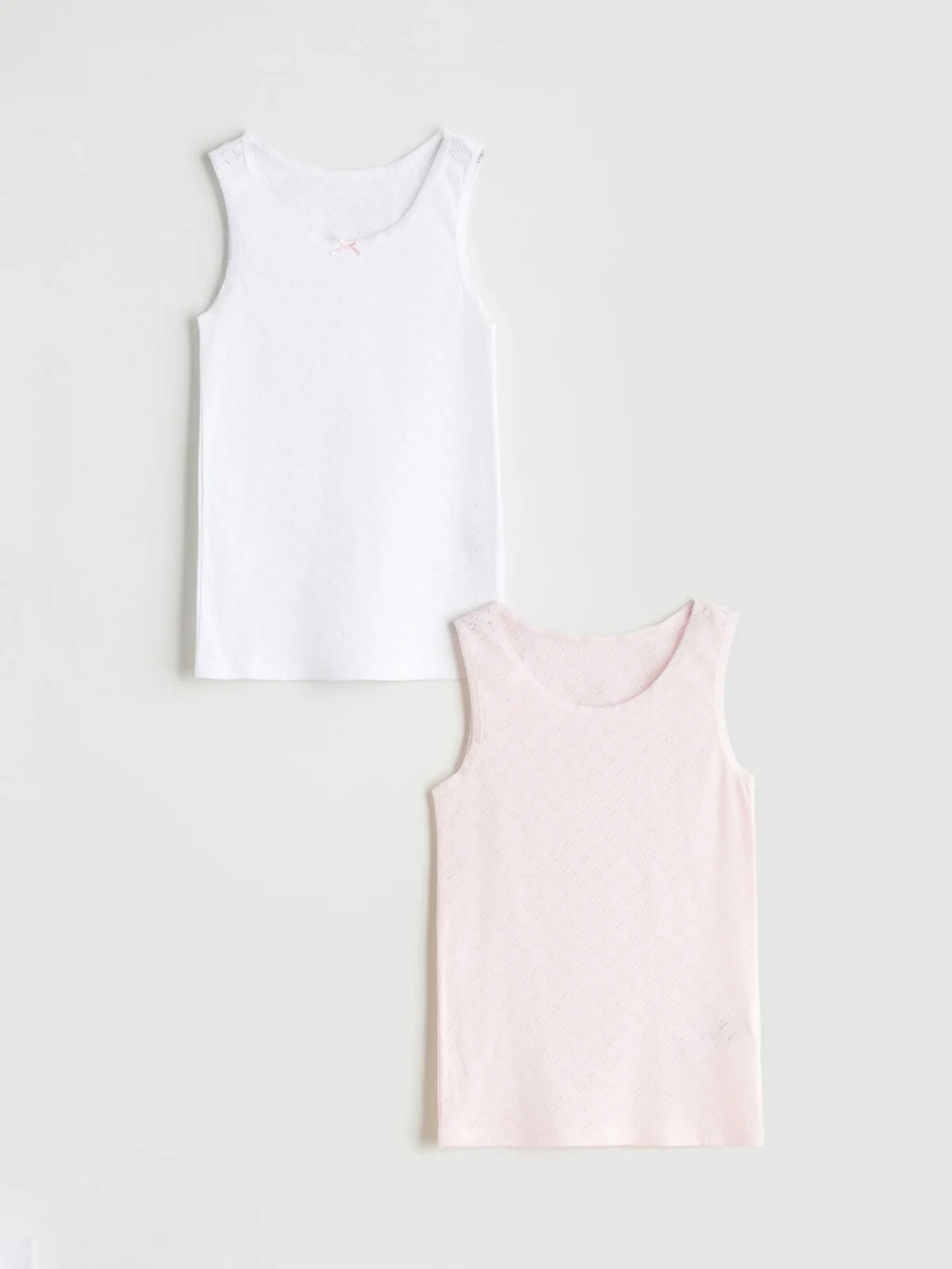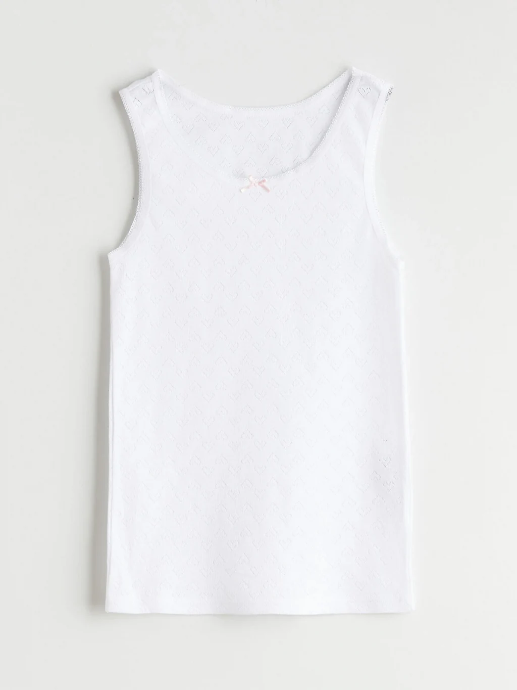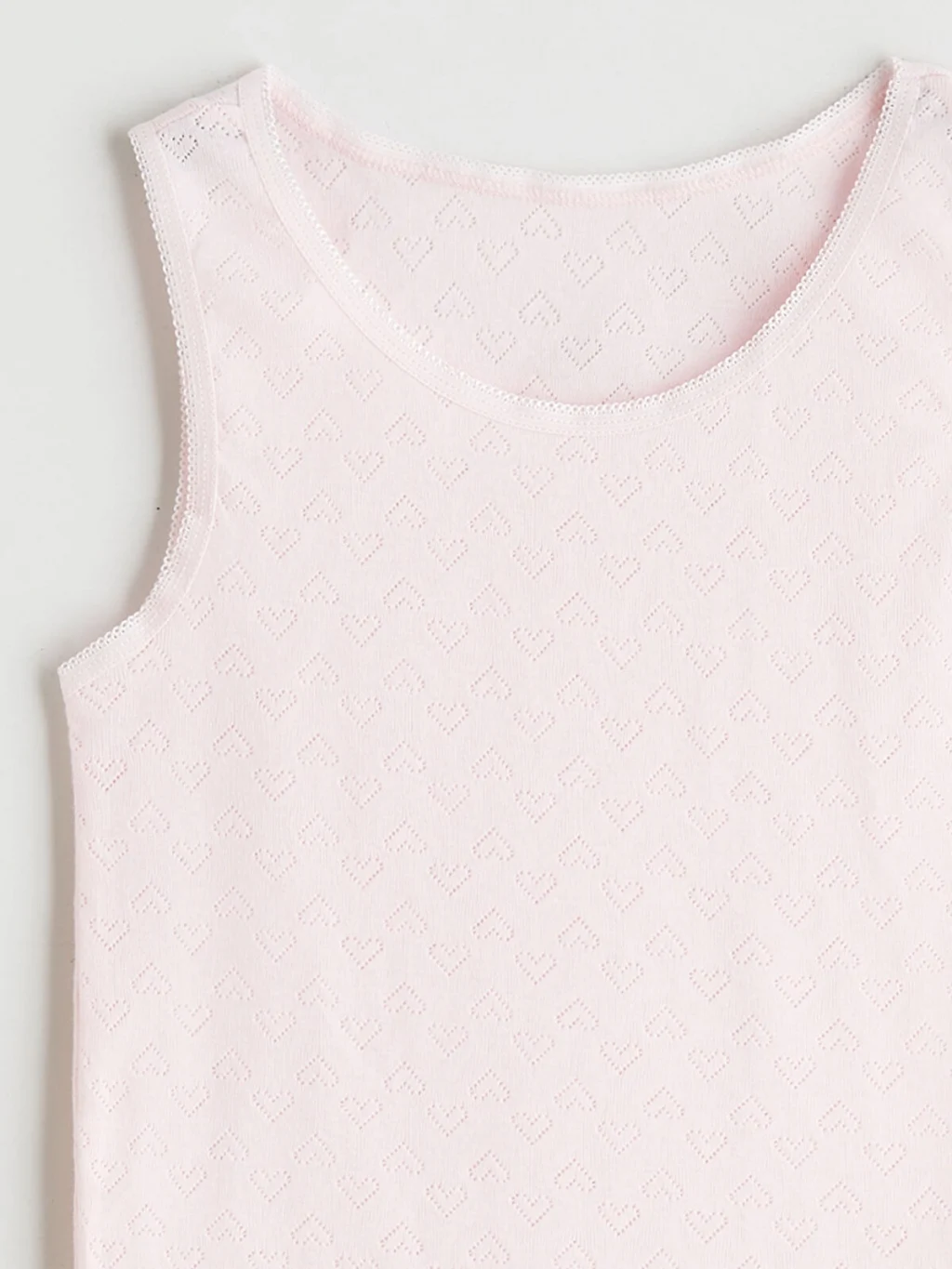 Kız çocuk iç giyim atlet, %100 pamuklu kendinden desenli kumaştan üretilmiştir. Bisiklet yaka ve kolsuzdur, yaka ortasında fiyonk detayı bulunur.