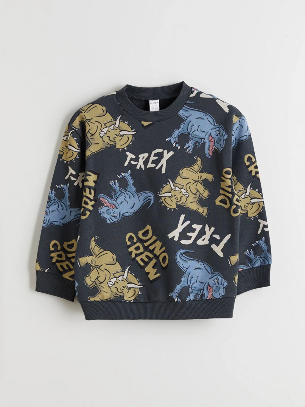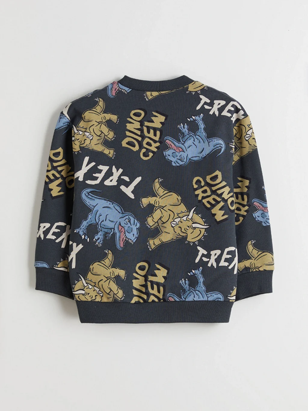 Erkek çocuk takım, bisiklet yaka, uzun kollu, dinozor desenli sweatshirt ve paçaları ribanalı eşofman alttan oluşur. %100 pamuk 3 iplik kumaştır.