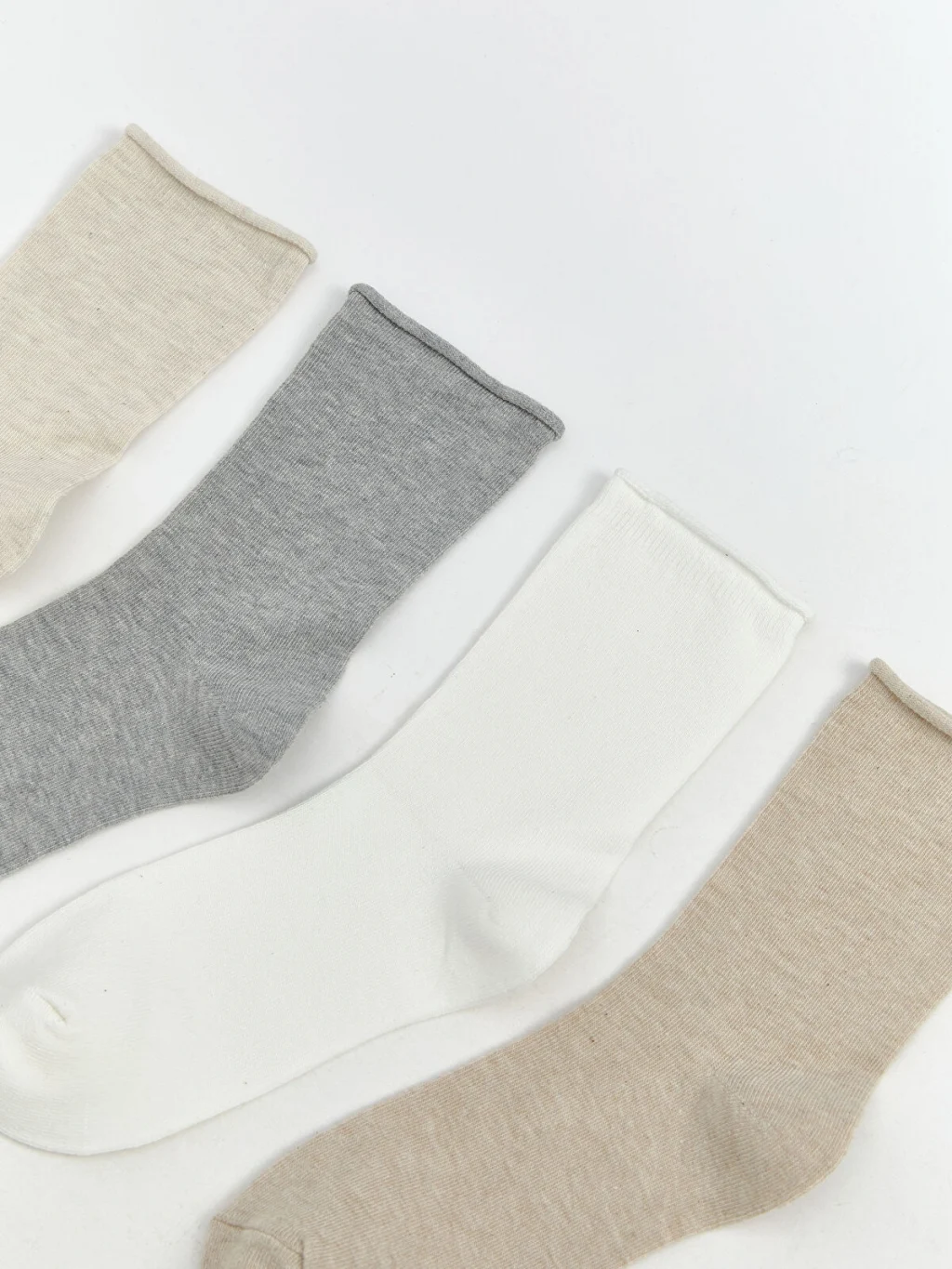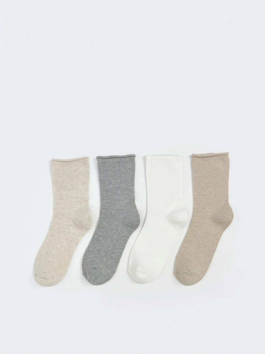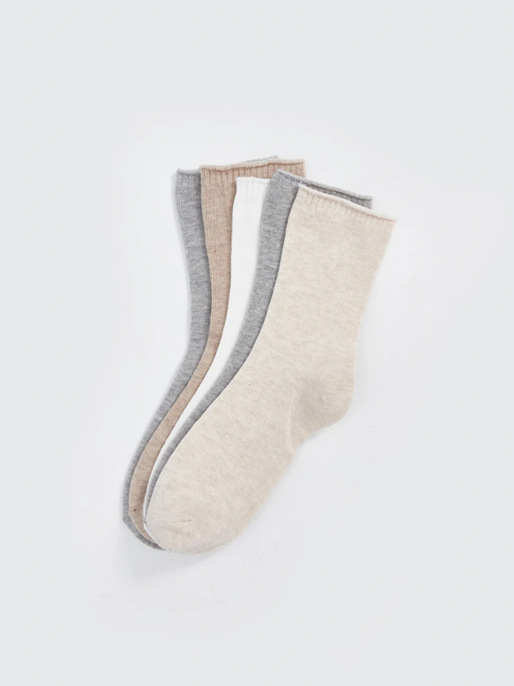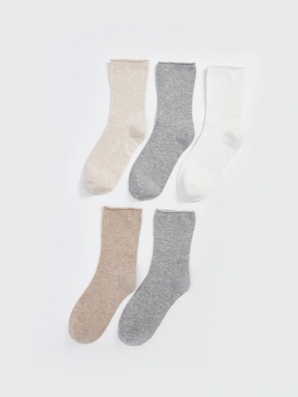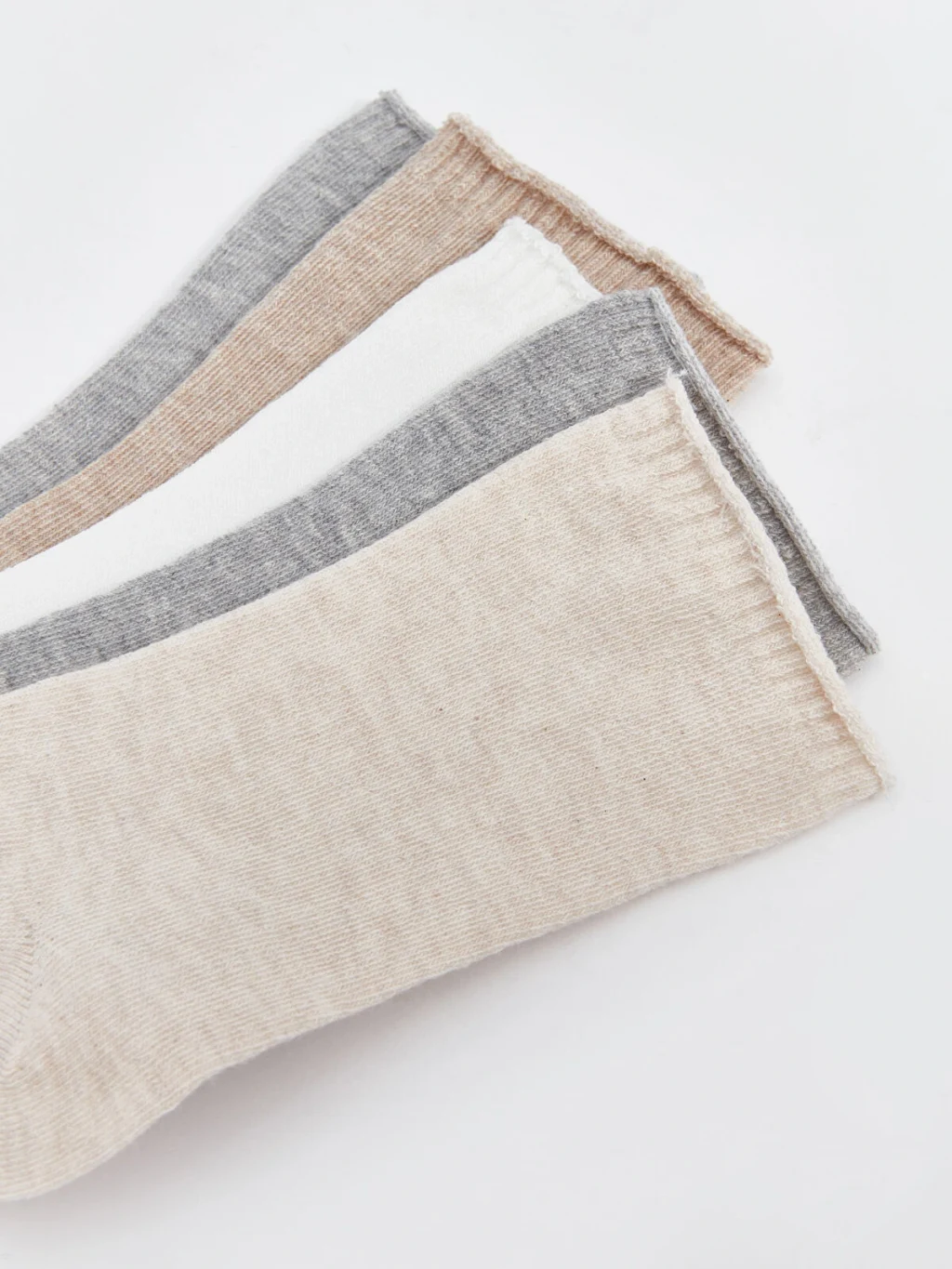 Pamuk karışımlı kumaştan üretilen soket çorap, yumuşak ve rahat bir dokuya sahiptir.Düz, sade tasarımıyla doğal bir görünüm sunar ve 5 çift soket çoraptan oluşmaktadır.