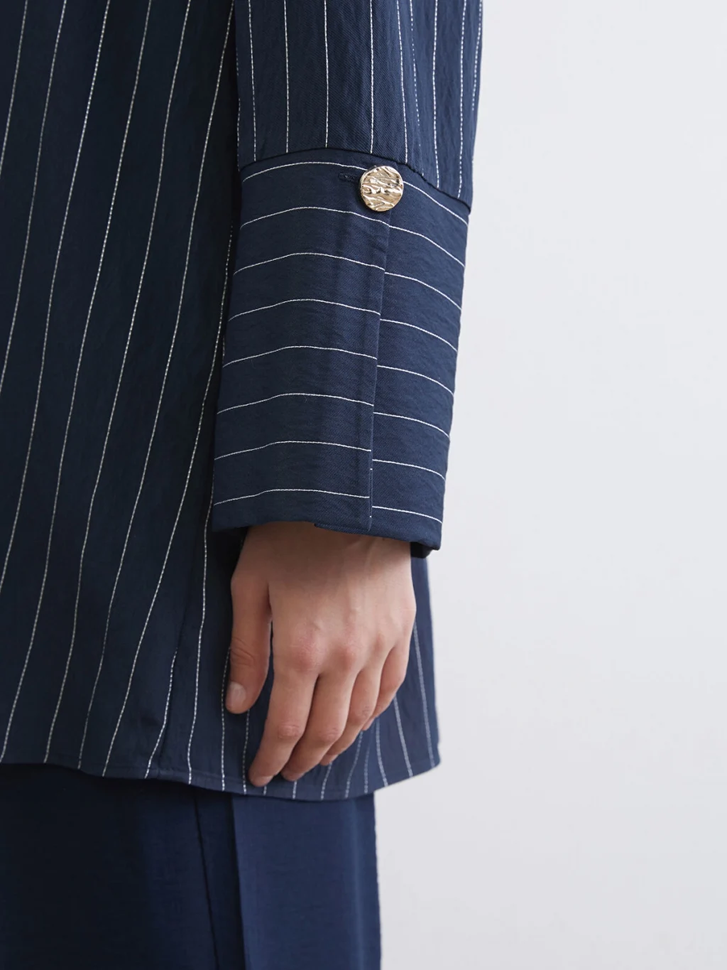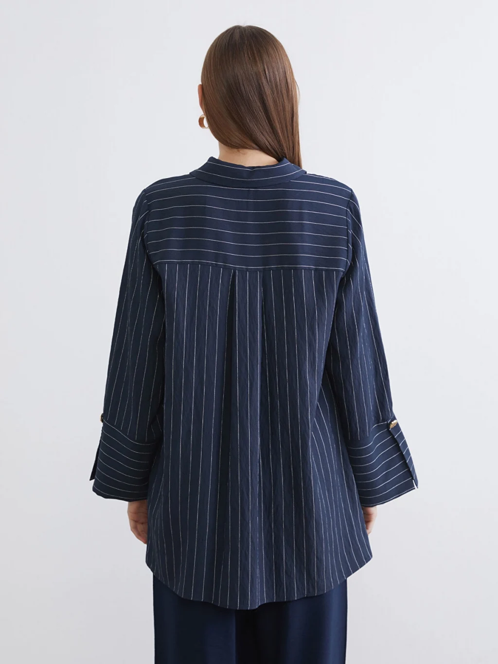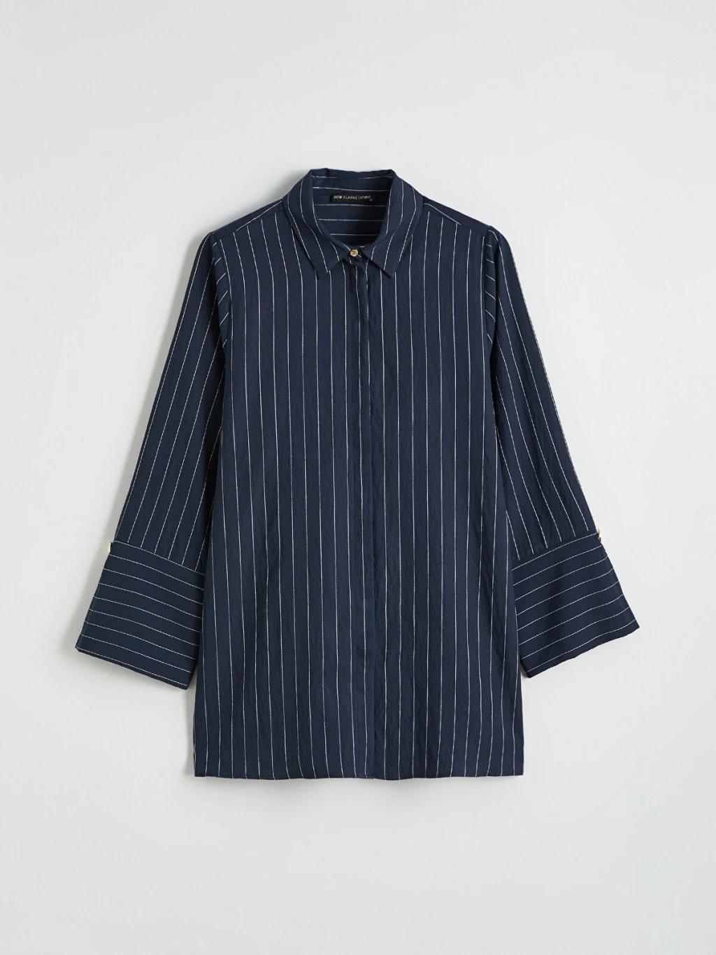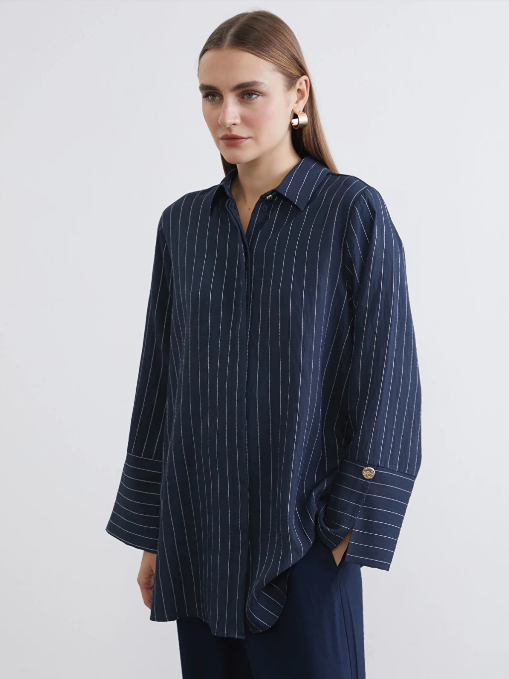 Çizgili desene sahip, uzun kollu kadın gömlek tunik, önden düğme kapamalıdır ve geniş manşetlidir.