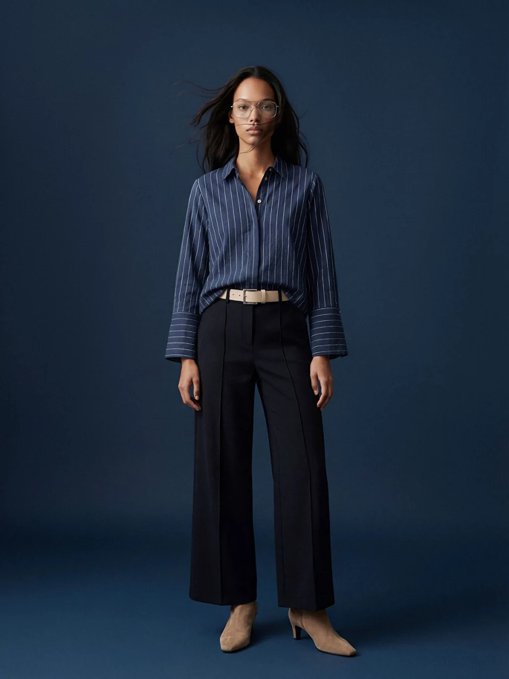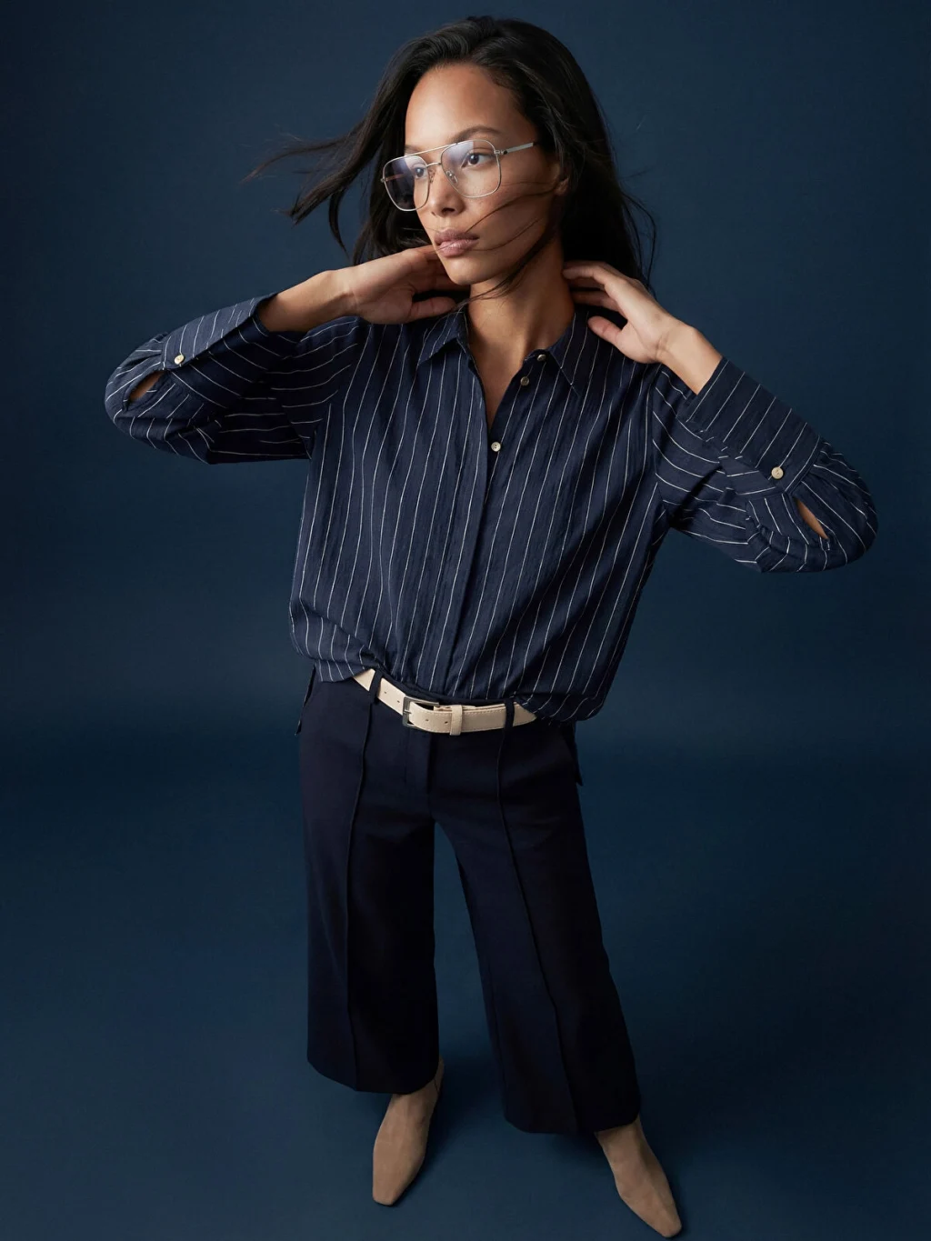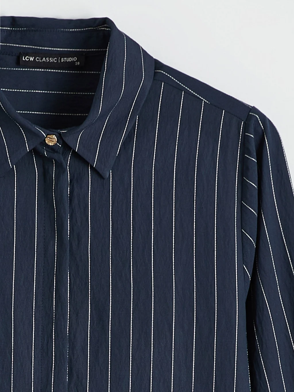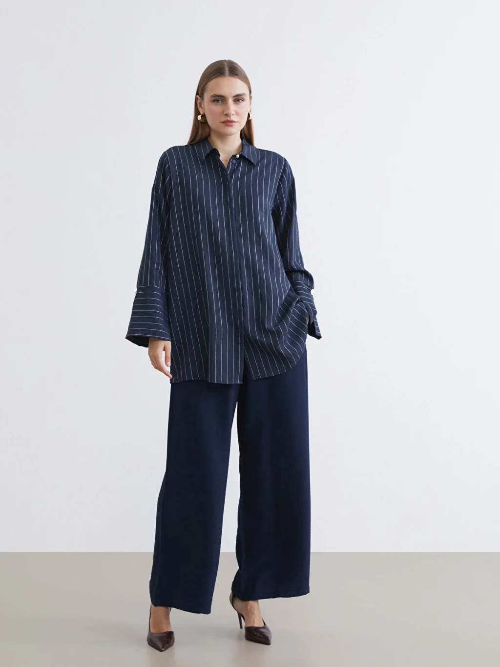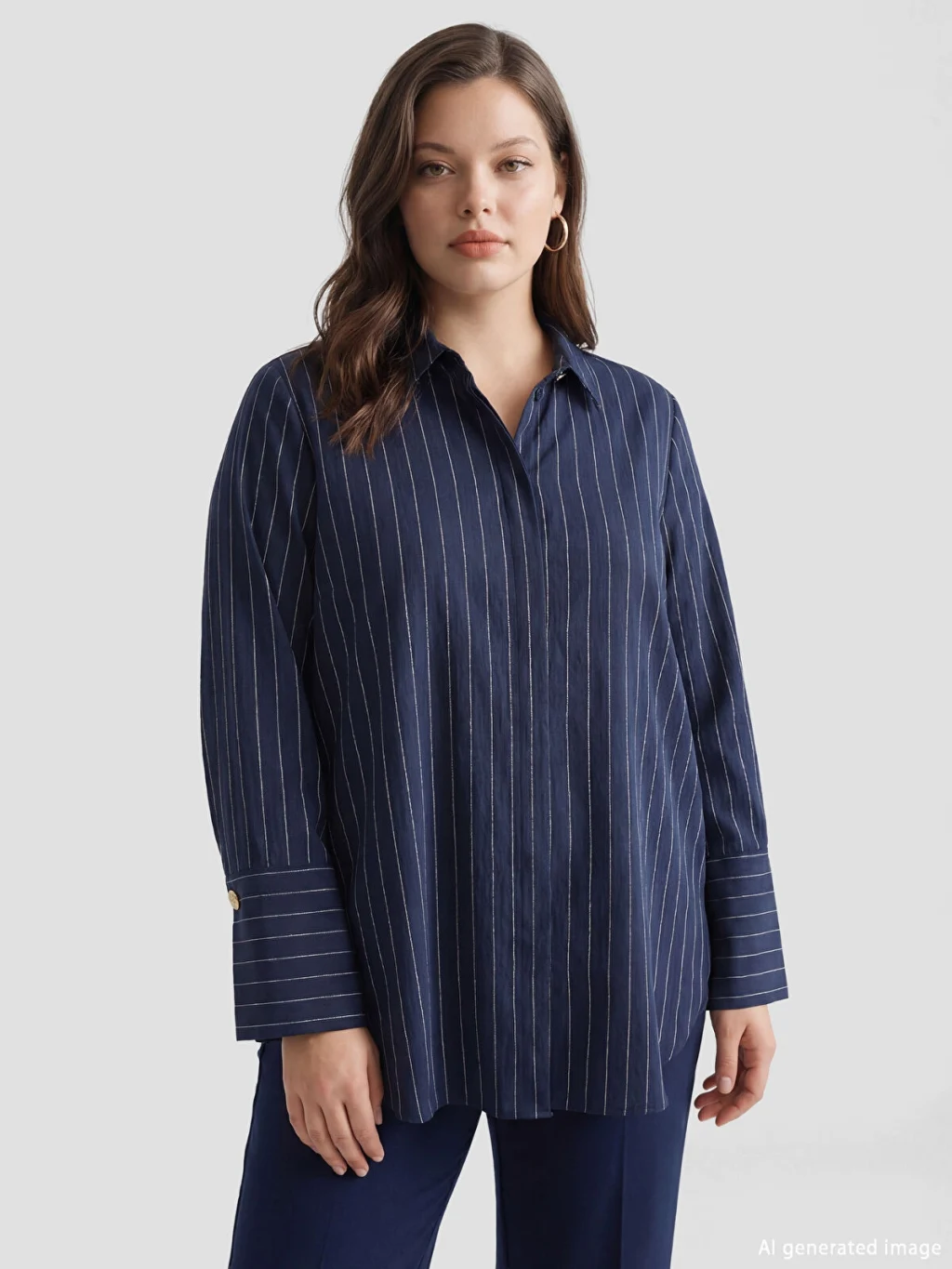 Çizgili desene sahip, uzun kollu kadın gömlek tunik, önden düğme kapamalıdır ve geniş manşetlidir.