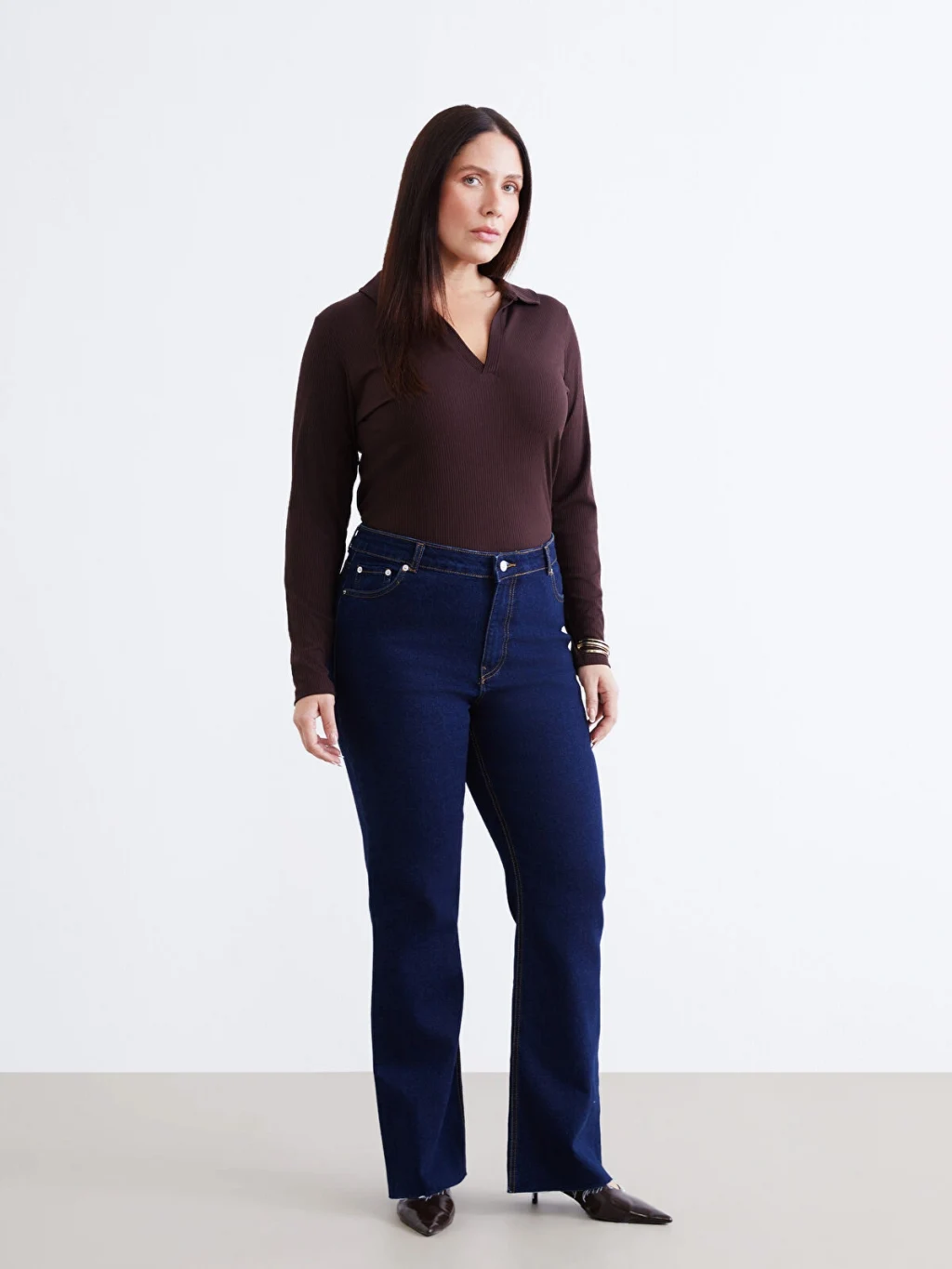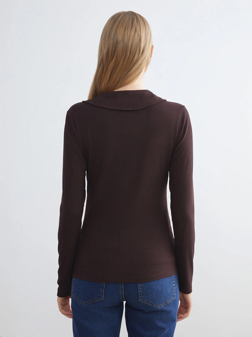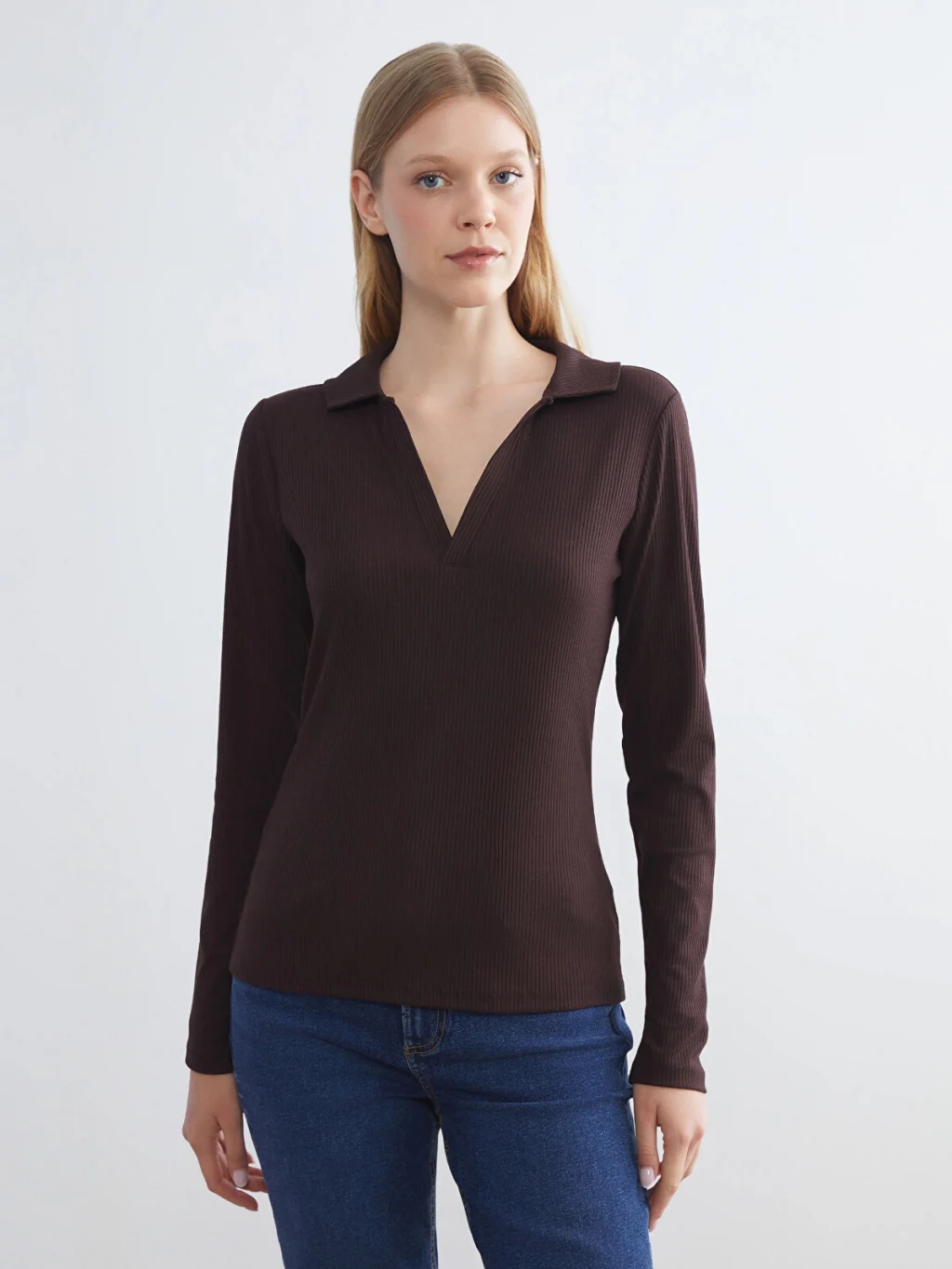Polo yakalı ve uzun kollu kadın tişört, kaşkorse kumaştan üretilmiştir ve dar kalıplıdır.