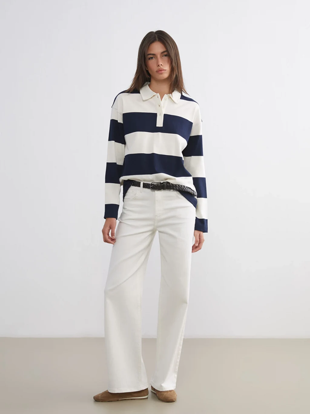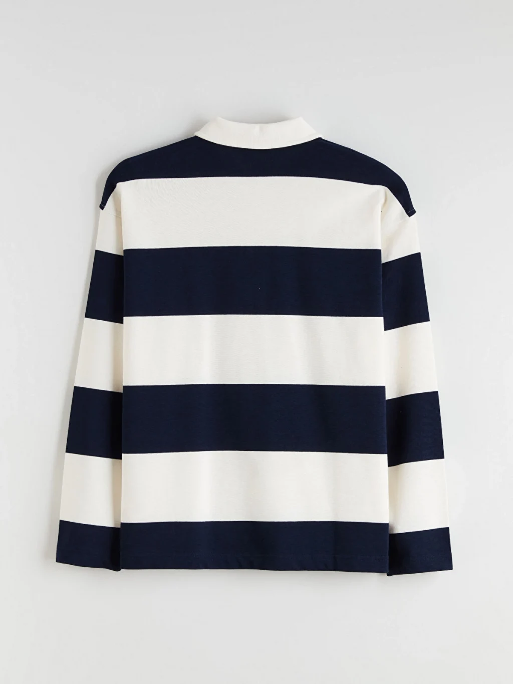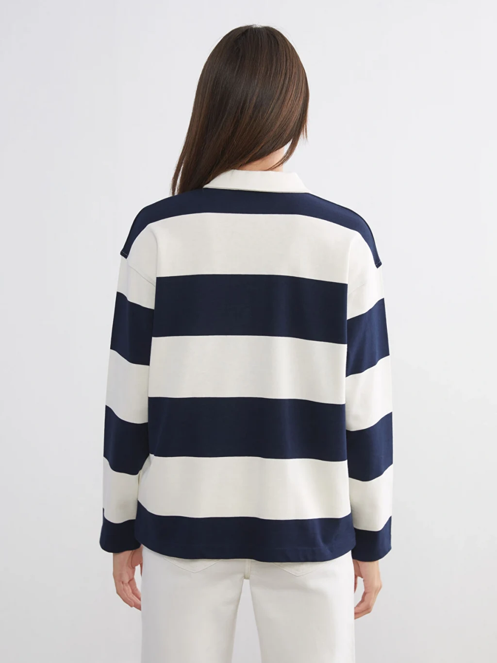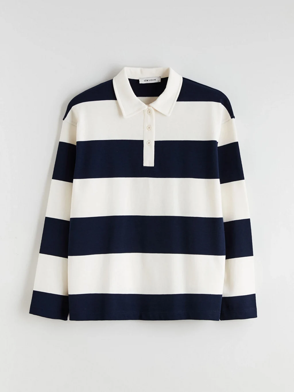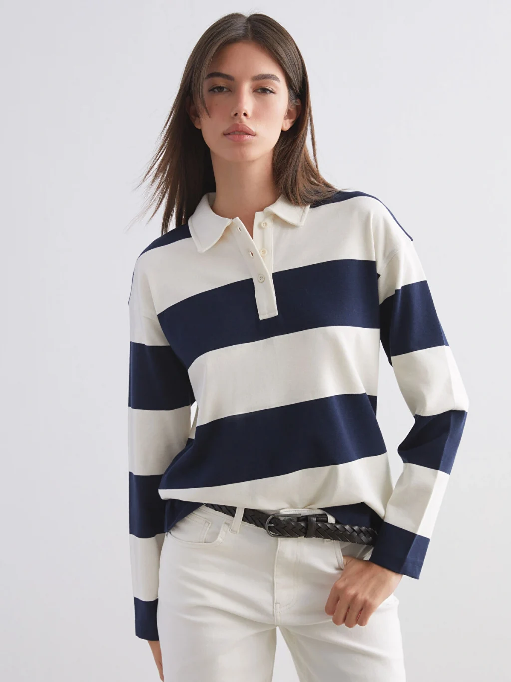 Bol kalıplı, polo yakalı kadın tişört, uzun kollu ve çizgili desene sahiptir. Düğme kapamalıdır ve %100 pamuk interlok kumaştan üretilmiştir.