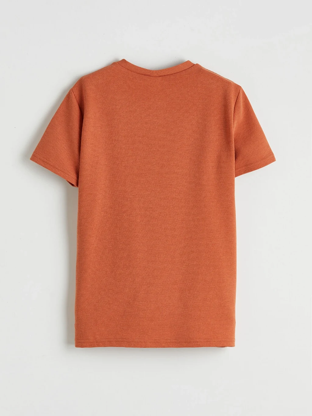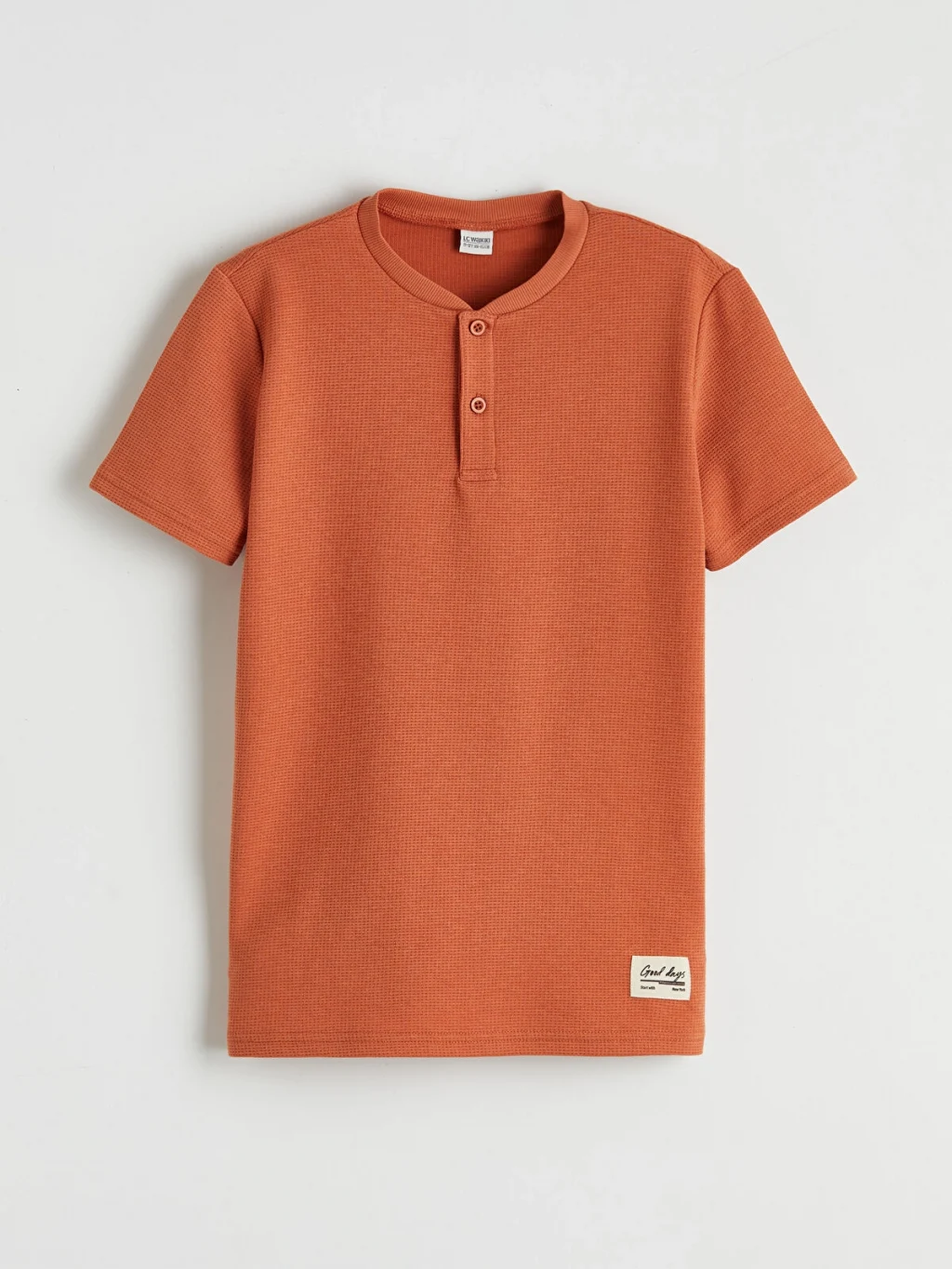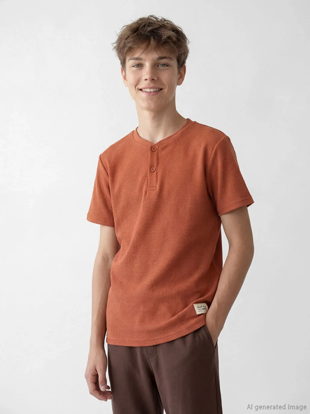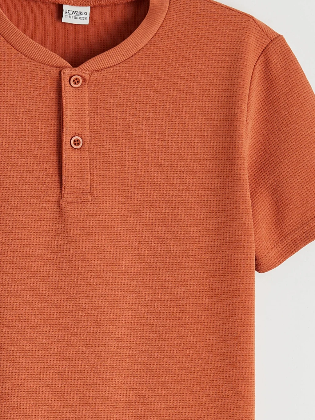 Bisiklet yakalı ve kısa kollu erkek çocuk tişört, dokulu kumaştan üretilmiştir ve ön patı düğme kapamalıdır.