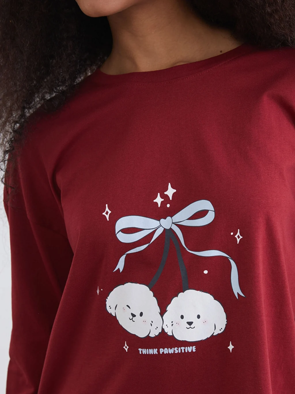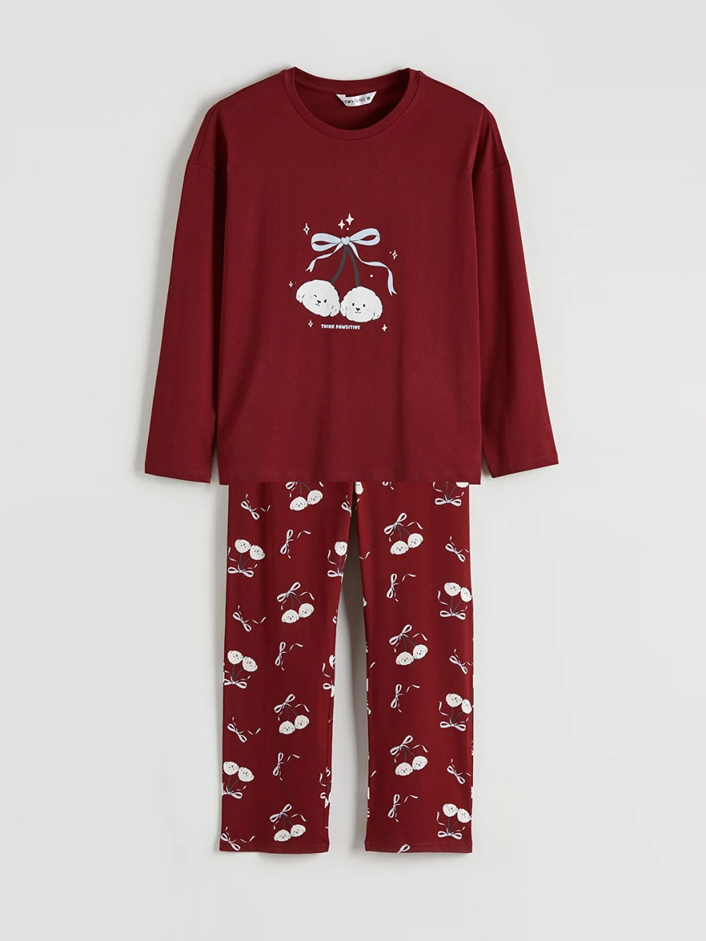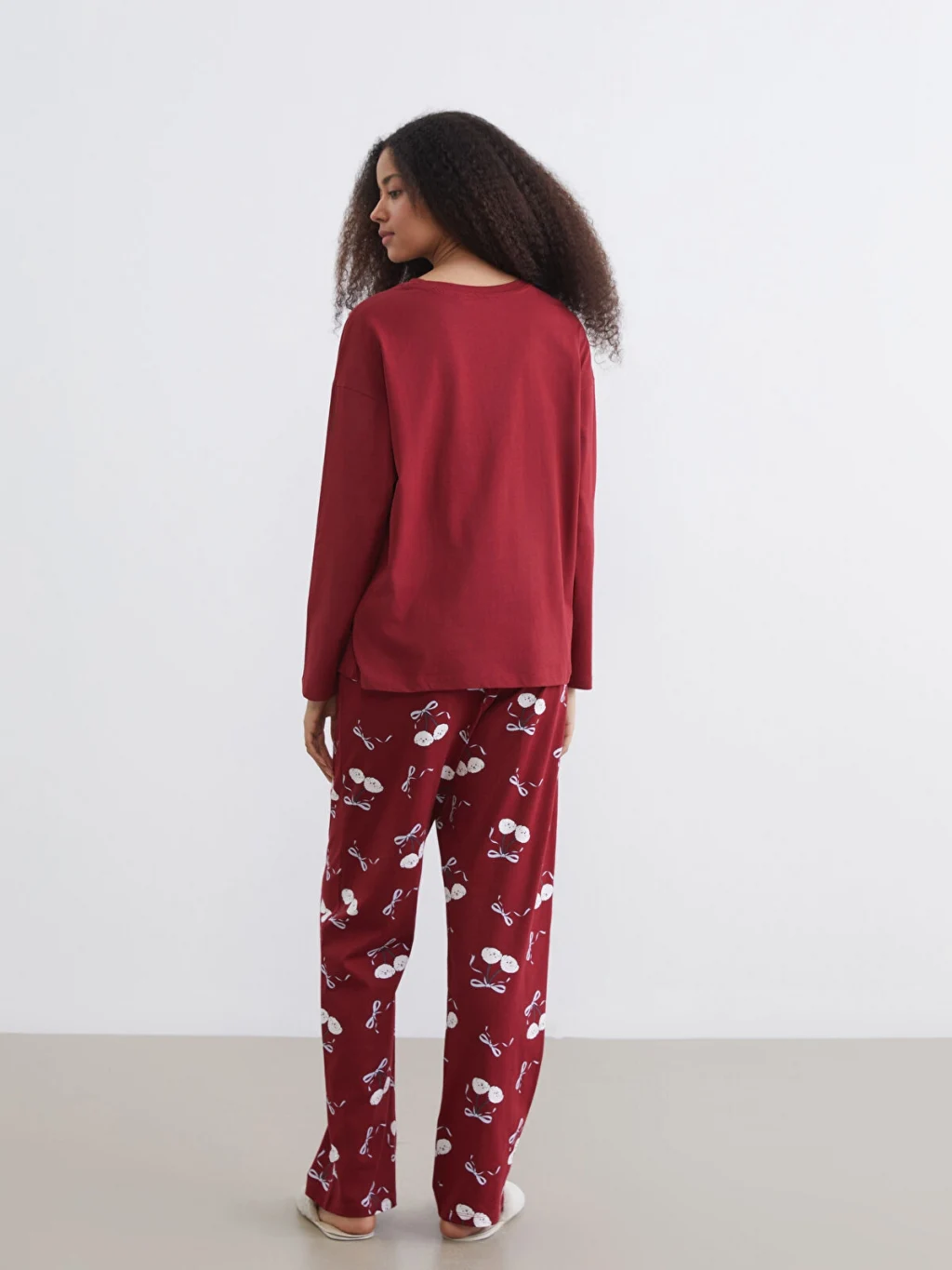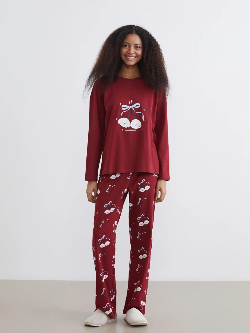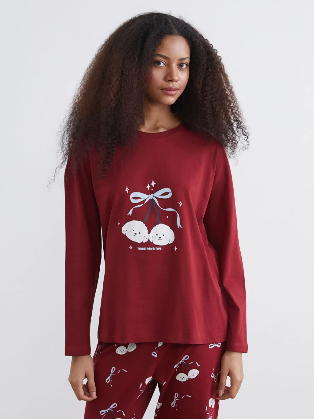 Kadın pijama takımı, %100 pamuk penye kumaştan üretilmiştir. Bisiklet yaka, uzun kollu ve baskılı üst ile desenli alt parçadan oluşur.