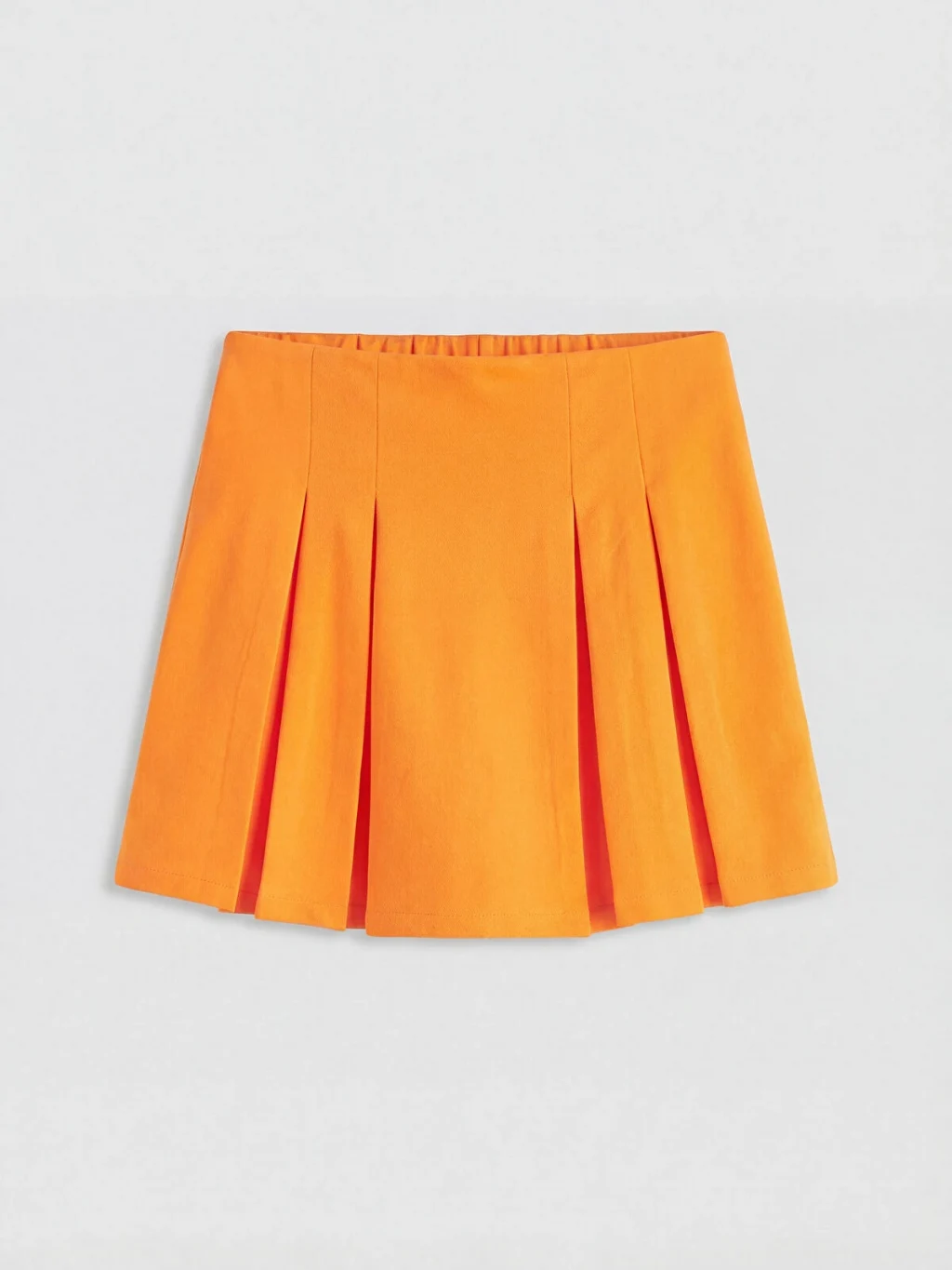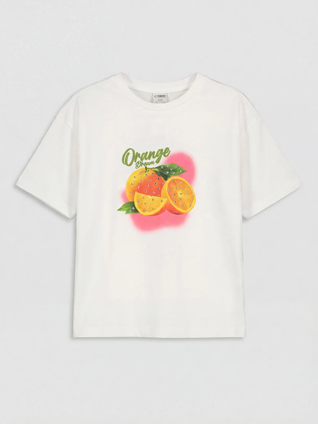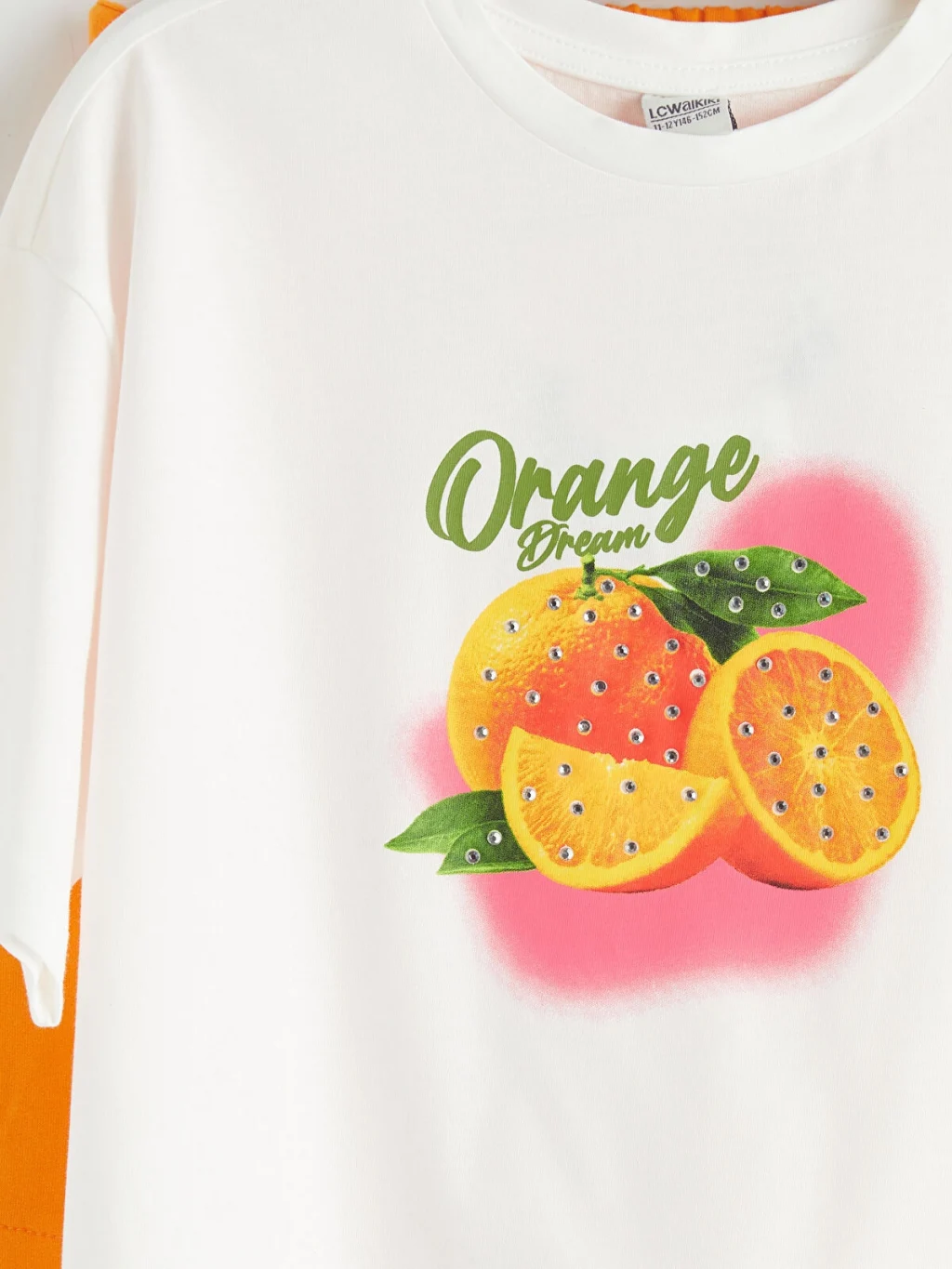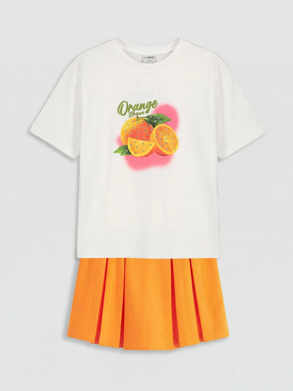 Kısa kollu, bisiklet yaka, baskılı tişört ve beli lastikli, pileli etekten oluşan kız çocuk takım, %100 pamuk kumaştan üretilmiştir.