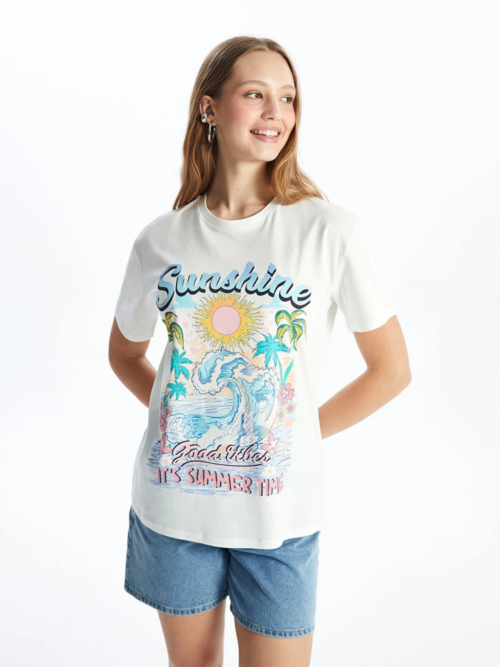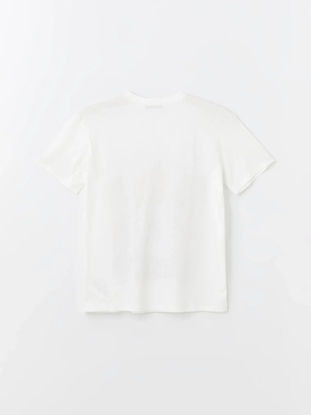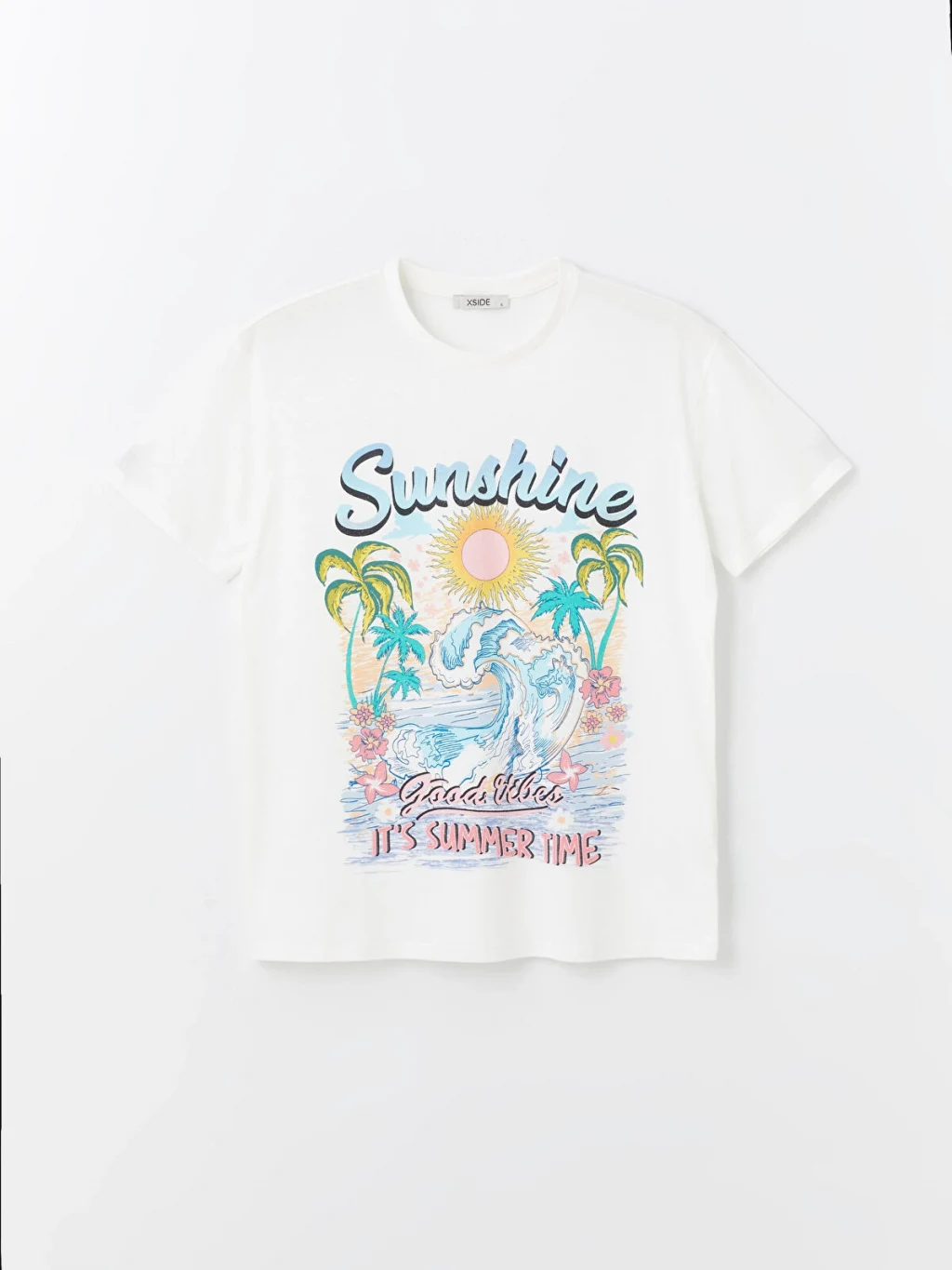 Bisiklet yaka baskılı kısa kollu tişört, süprem kumaştan üretilmiştir. Hafif ve nefes alabilen yapısı ile yaz aylarında serinlik sunar.