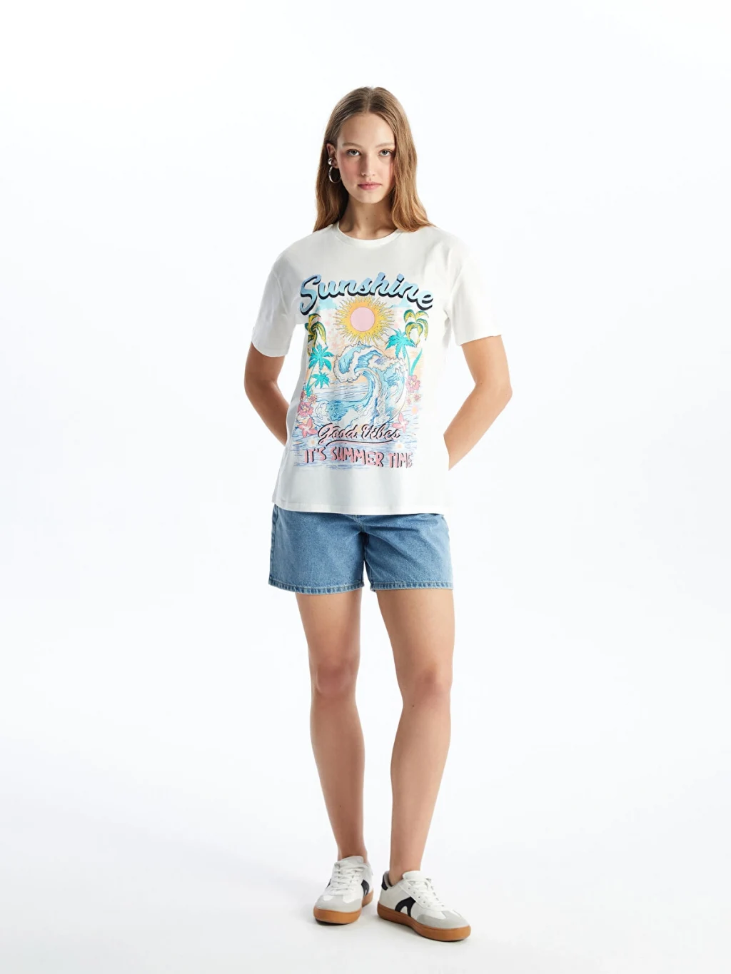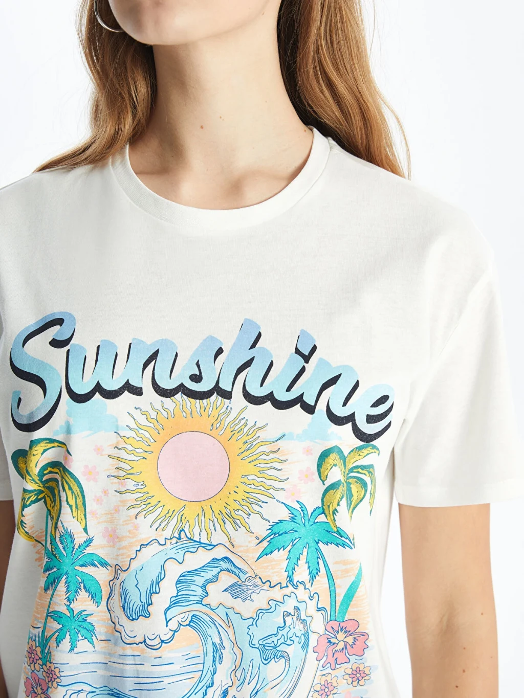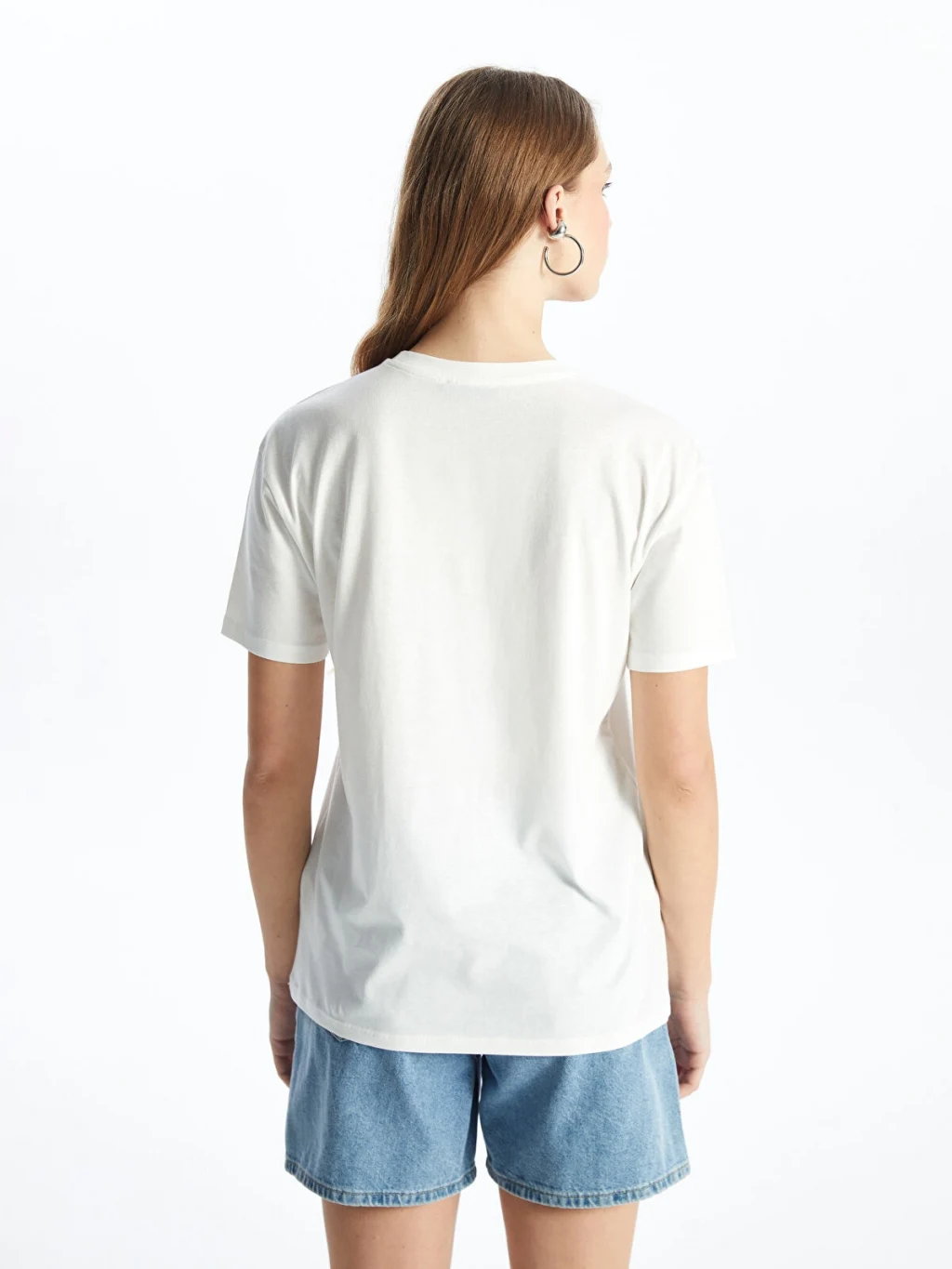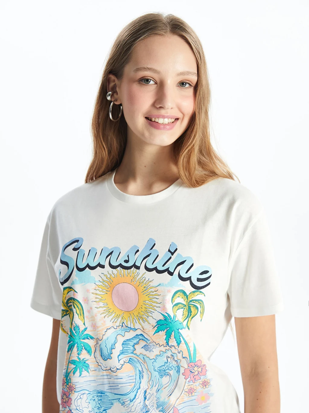 Bisiklet yaka baskılı kısa kollu tişört, süprem kumaştan üretilmiştir. Hafif ve nefes alabilen yapısı ile yaz aylarında serinlik sunar.