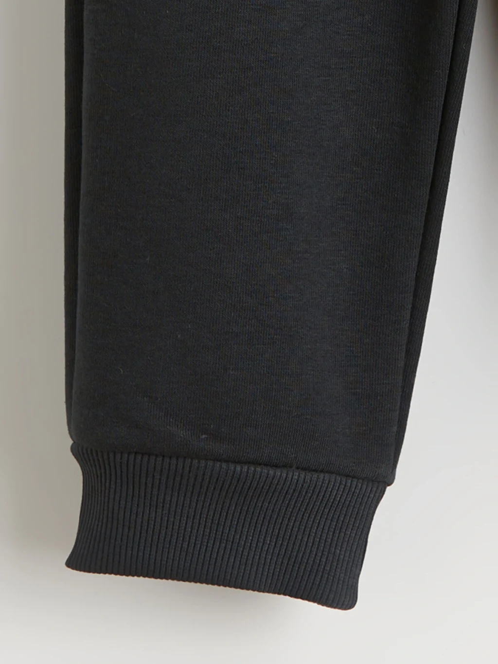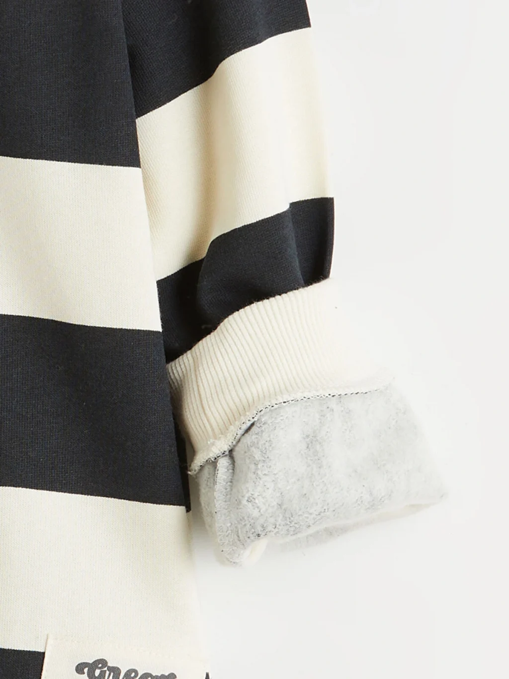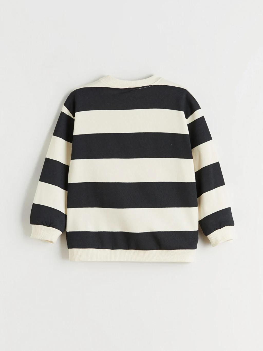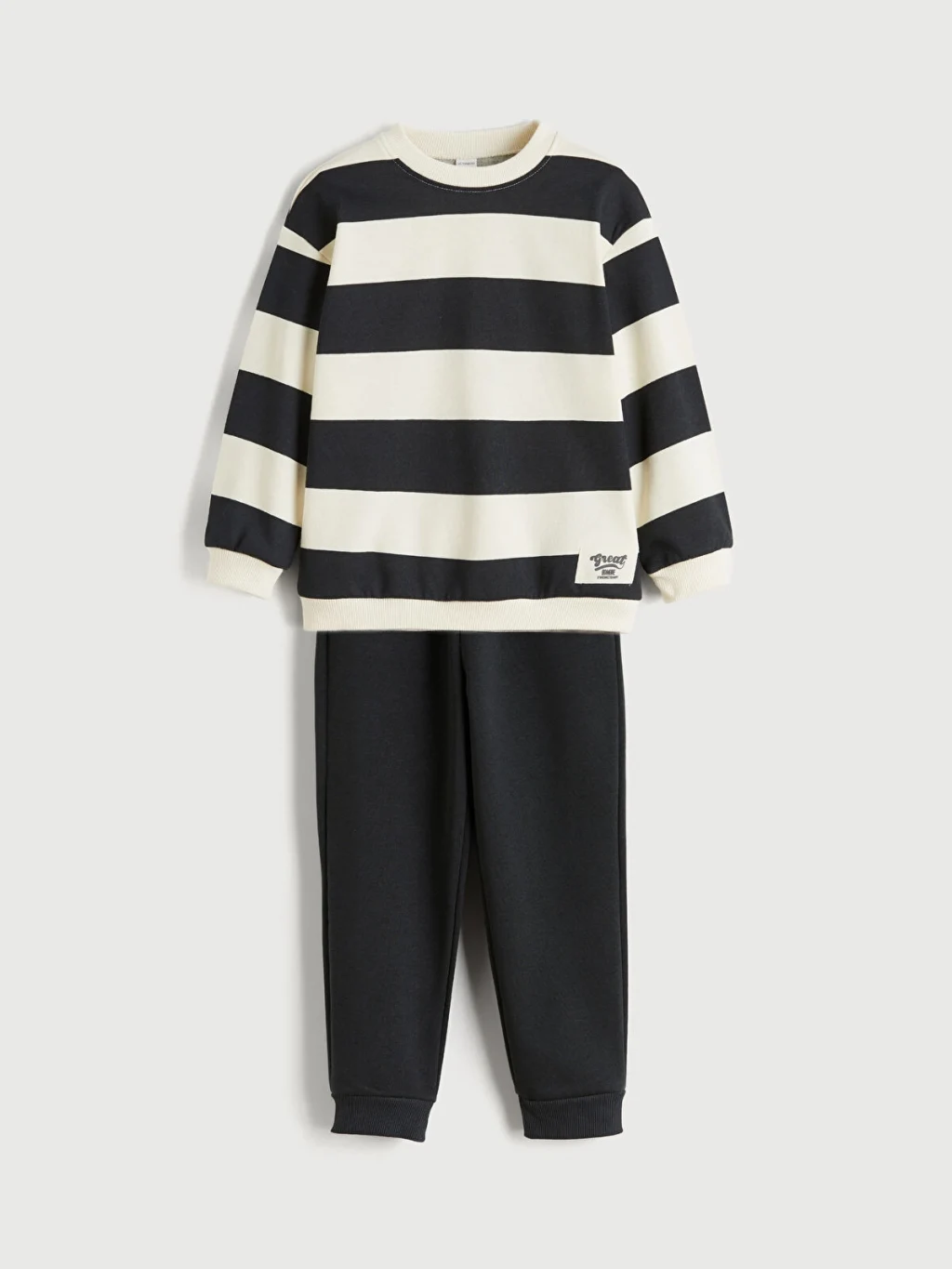 Erkek çocuk takım; bisiklet yaka, uzun kollu, çizgili sweatshirt ve paçaları ribanalı eşofman alttan oluşur. %100 pamuk 3 iplik şardonlu kumaştır.