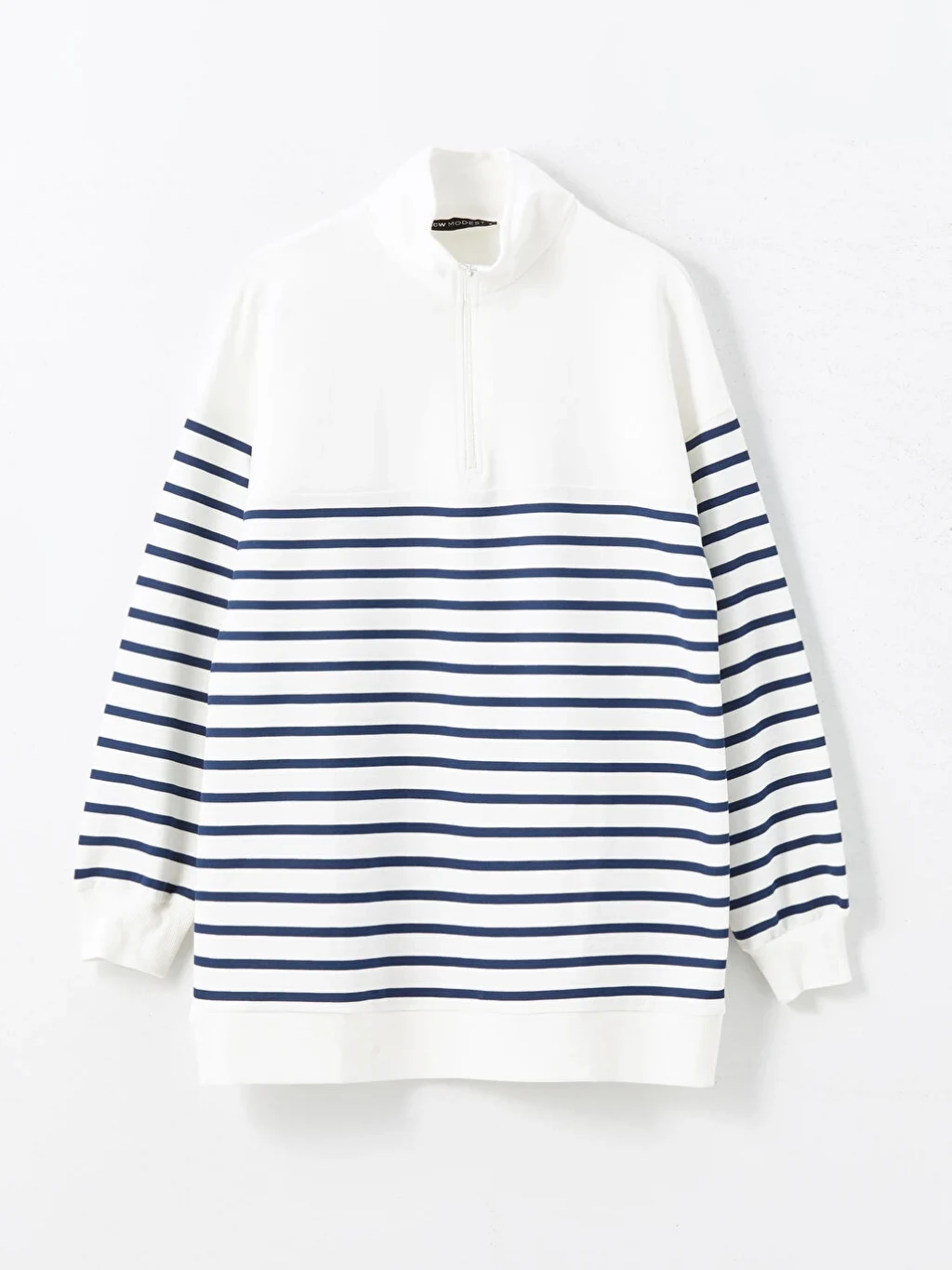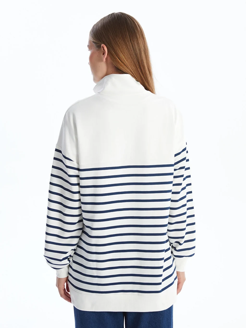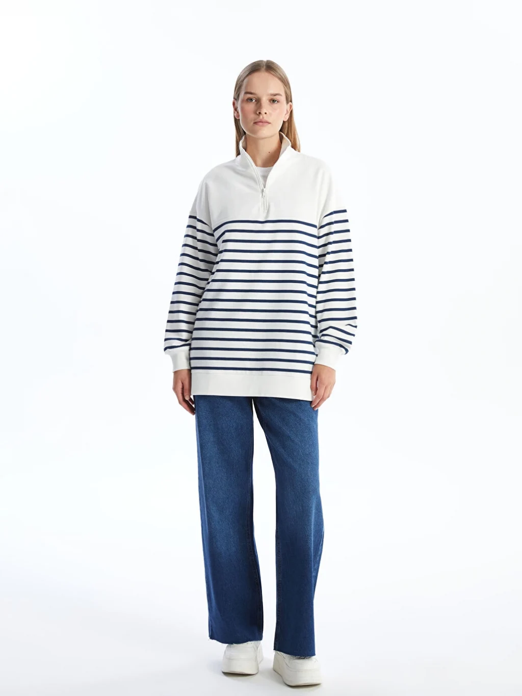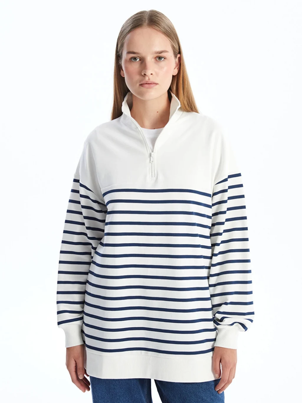 - Dik yaka çizgili uzun kollu sweatshirt tunik, soğuk kış aylarında sizi sıcak tutacak, 2 iplik kumaştan üretilmiştir. Bilekleri ribana detayı ile düzgün bir görünüm sunar. Yakasındaki fermuar detayı sayesinde isteğe göre ayarlanabilir.