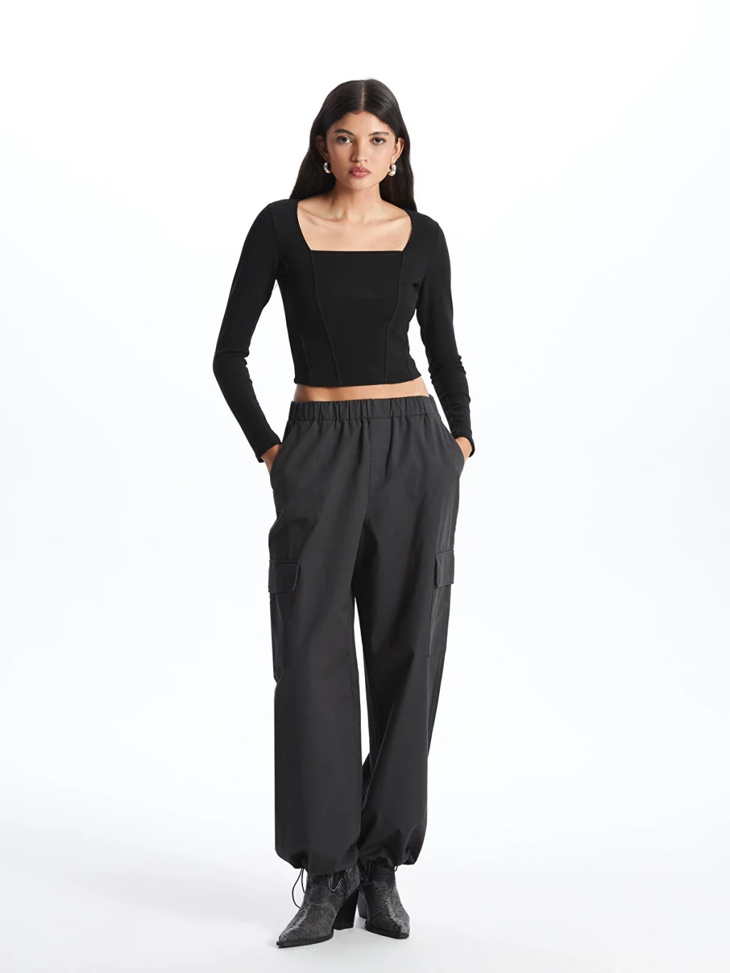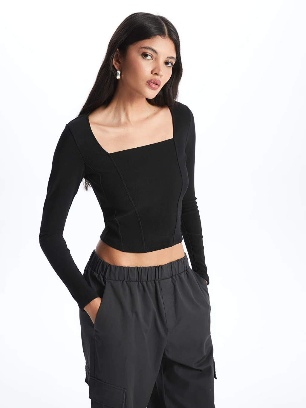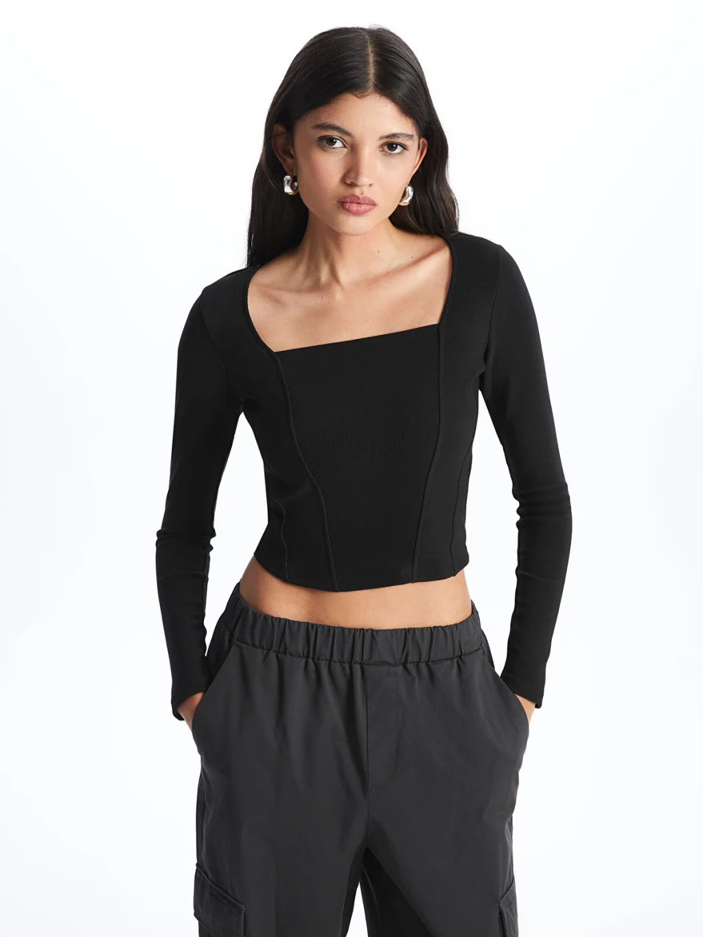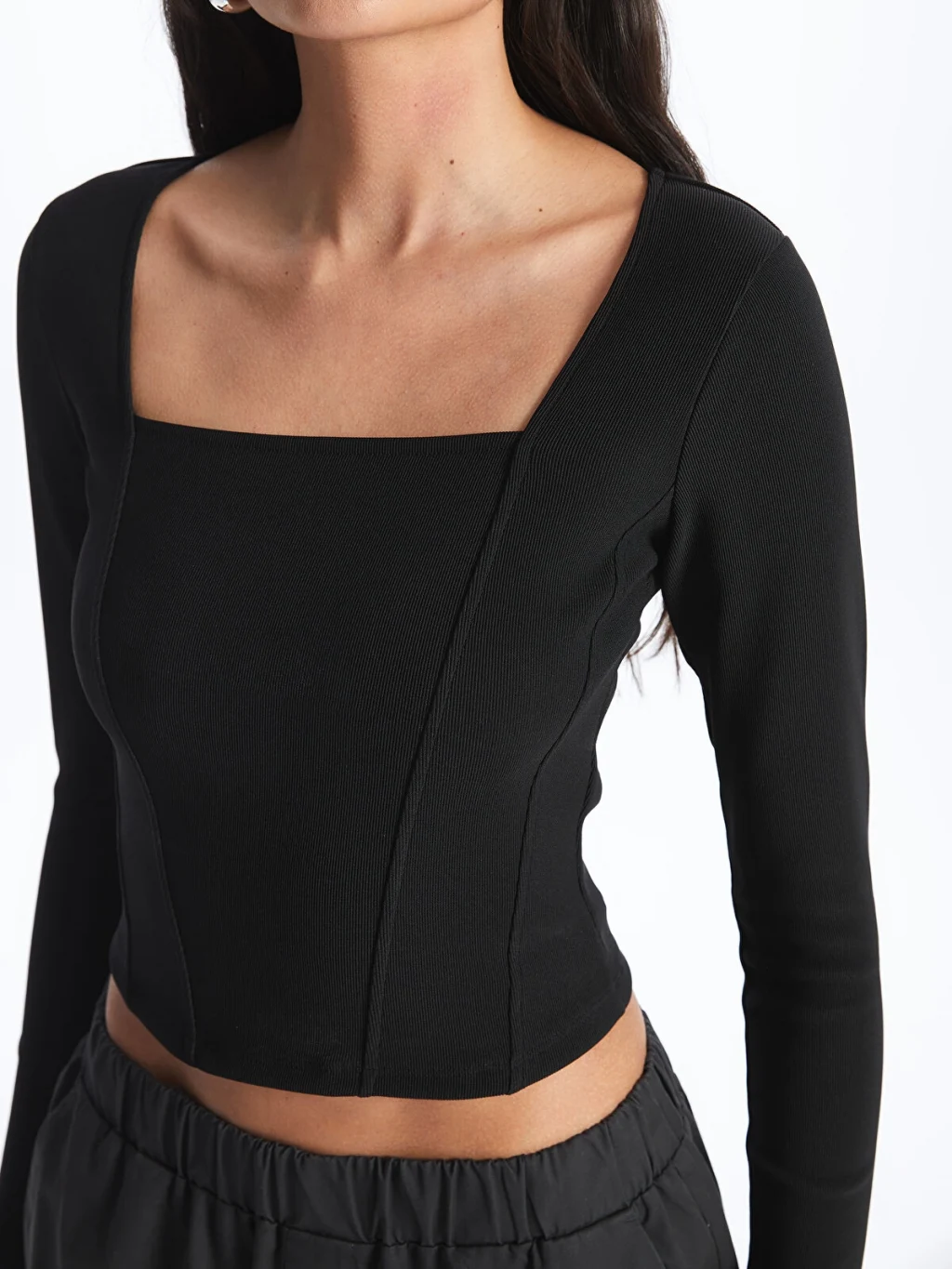 Kare yaka düz uzun kollu bluz, ottoman kumaştan üretilmiştir. Zor kırışan ottoman kumaşın, kendine özgü dokusal yüzeyi ile hem görsel hem de dokunsal bir zenginlik sunar. Kare yaka kesimi, modern ve şık bir görünüm sağlar.