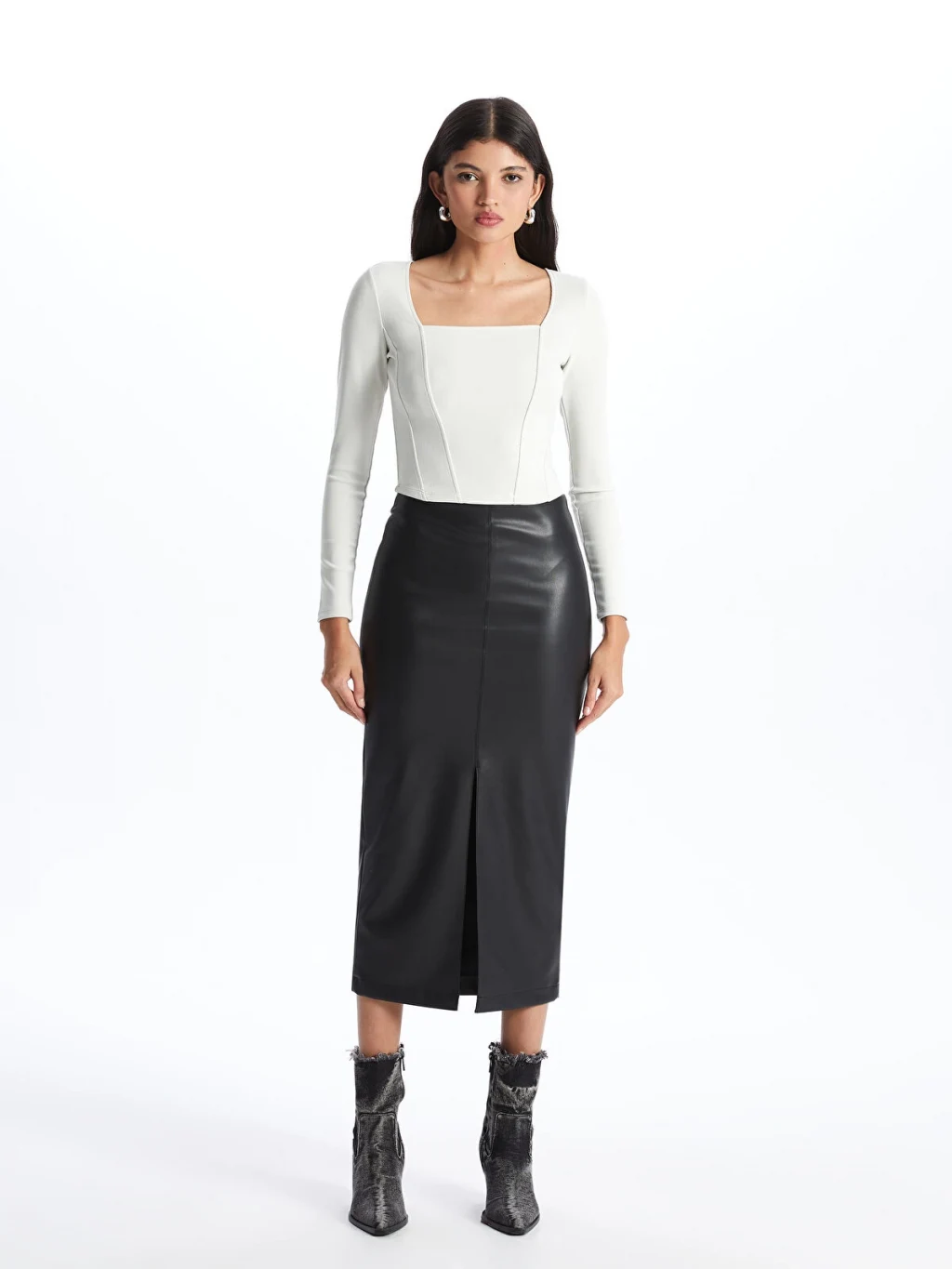 Kare yaka düz uzun kollu bluz, ottoman kumaştan üretilmiştir. Zor kırışan ottoman kumaşın, kendine özgü dokusal yüzeyi ile hem görsel hem de dokunsal bir zenginlik sunar. Kare yaka kesimi, modern ve şık bir görünüm sağlar.