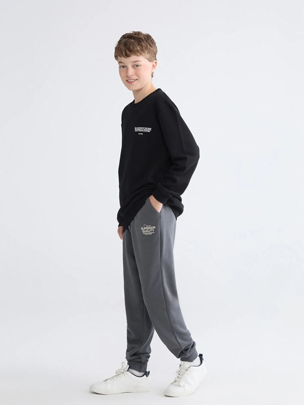 Baskı detaylı erkek çocuk eşofman altı, kalın 3 iplik kumaştan üretilmiştir. Beli lastikli, bağcıklı, yan cepli ve paçaları ribanalıdır.