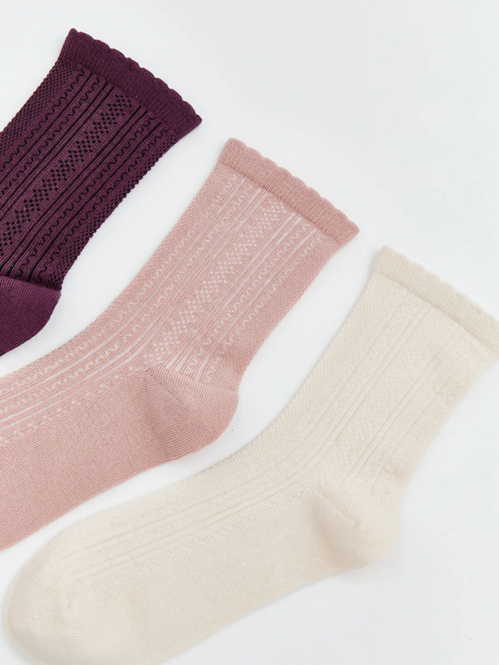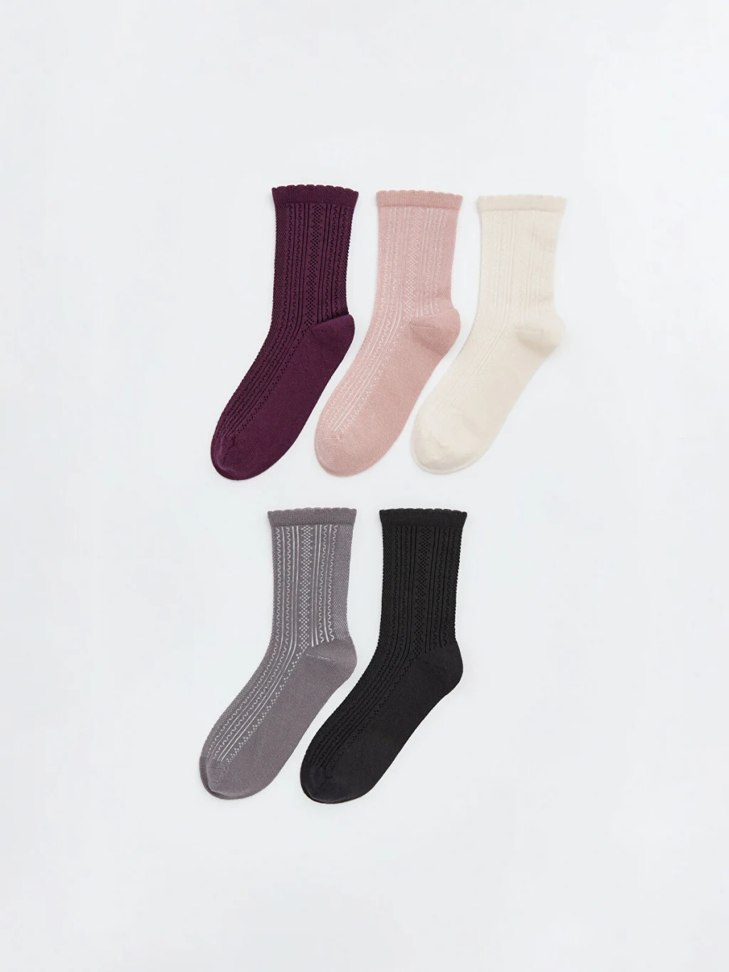 Kadın soket çorap, ajurlu ve kendinden desenli dokuya sahiptir. Bilek kısmı dalgalı kesimlidir.