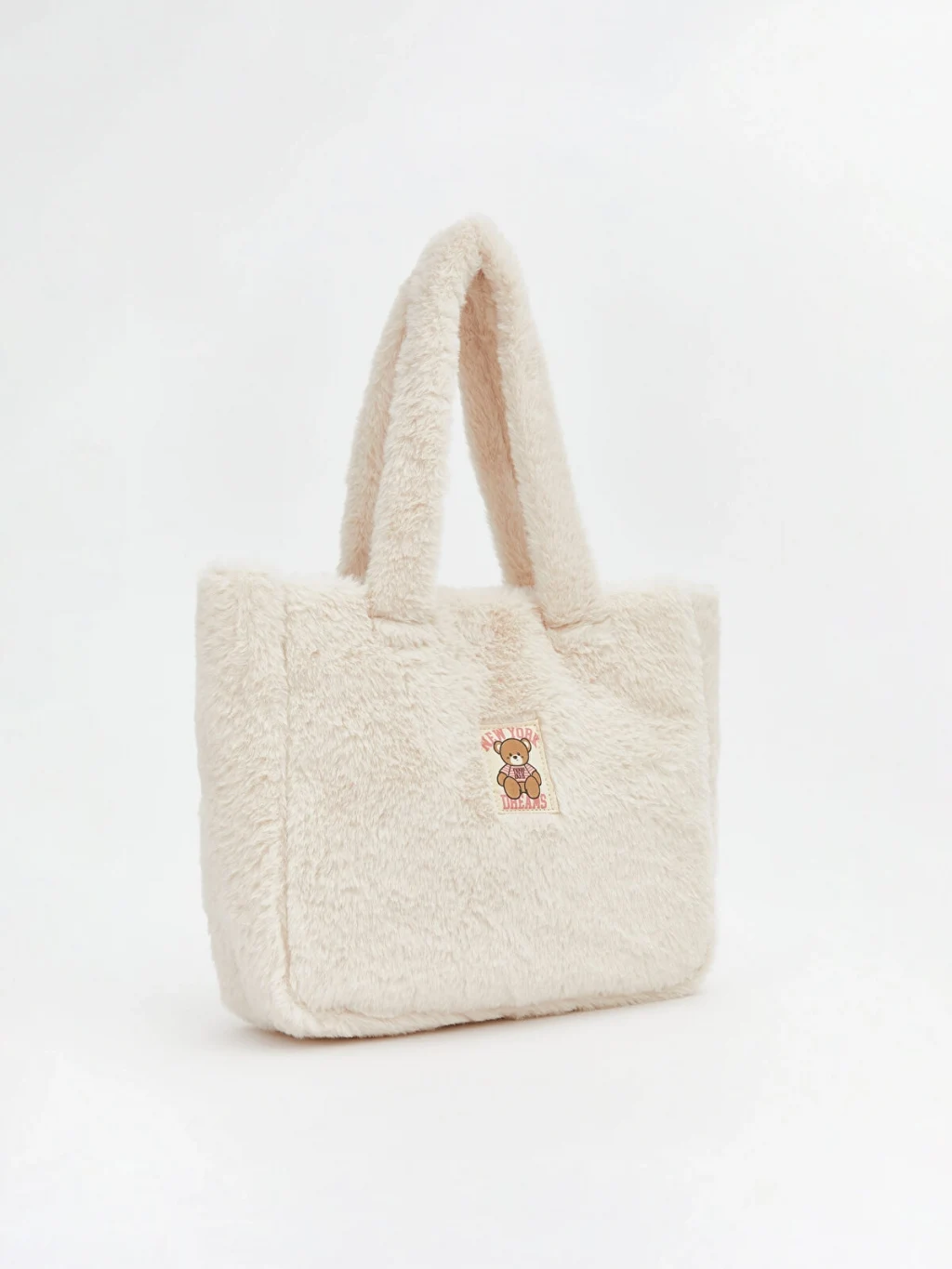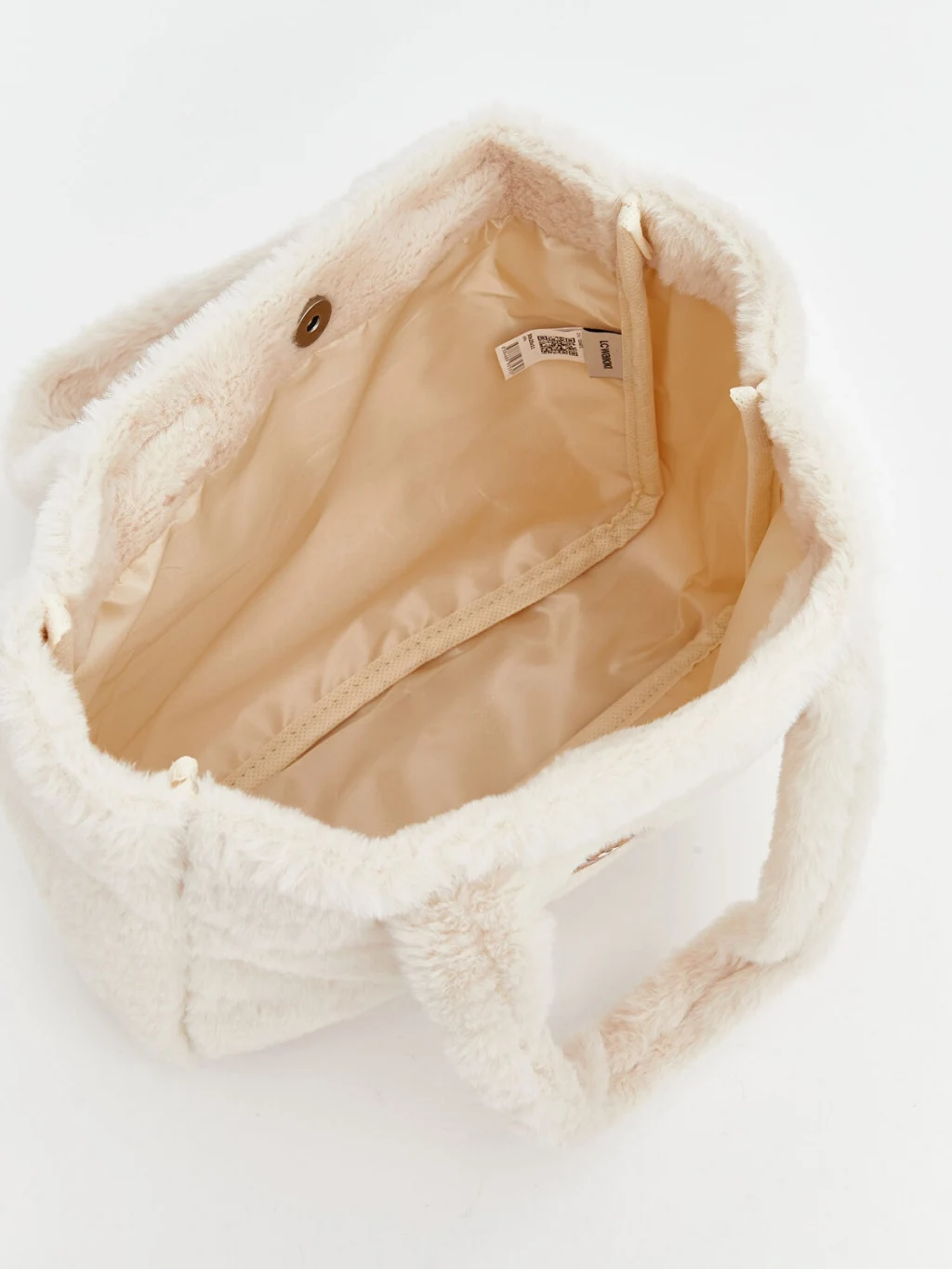 Pelüş kumaştan üretilen kız çocuk kol çantası, çift taşıma saplıdır ve ön yüzünde ayı figürlü arma detayı bulunur.