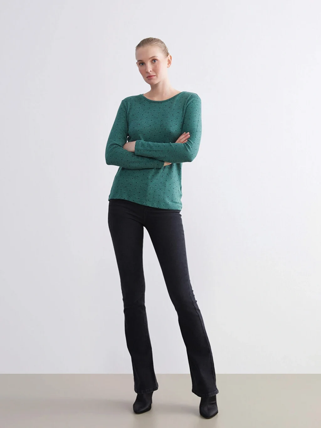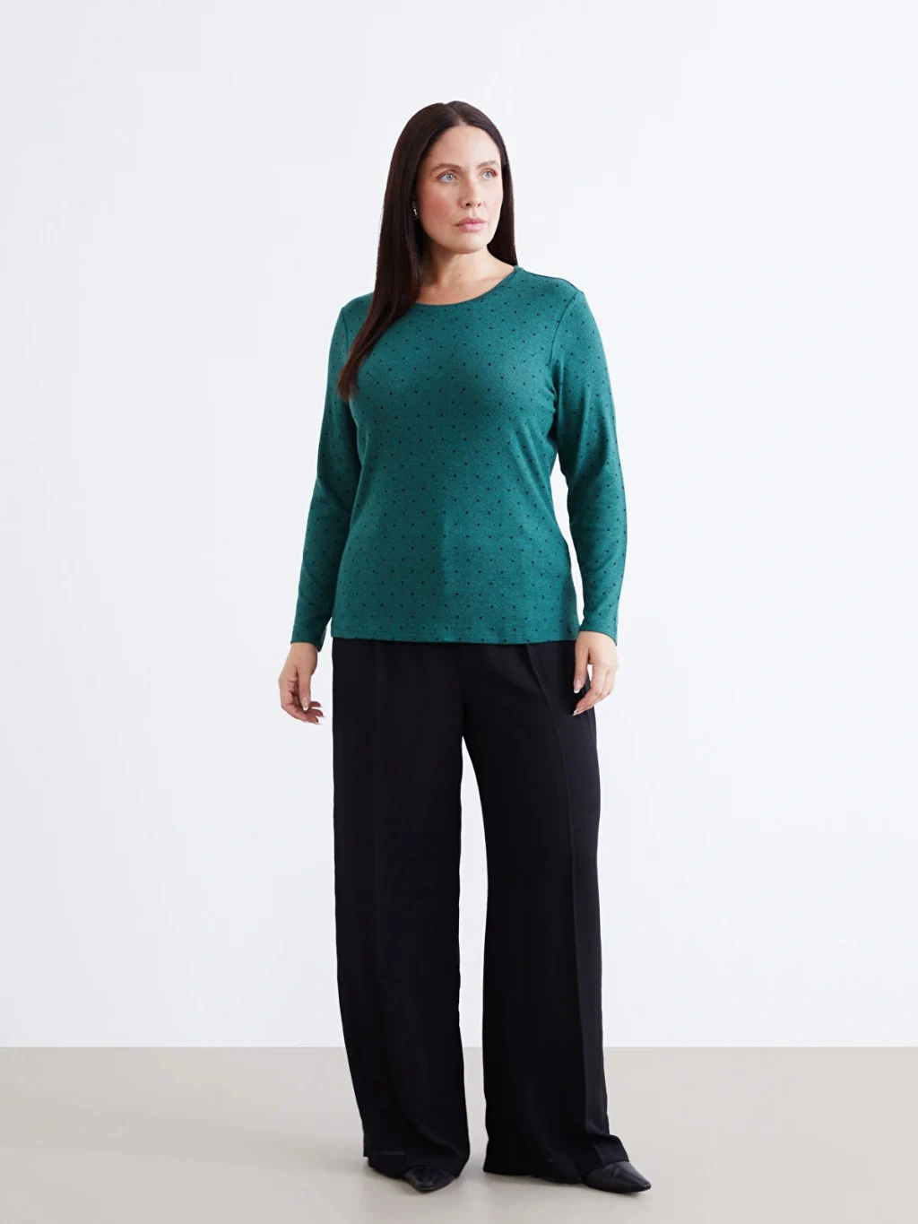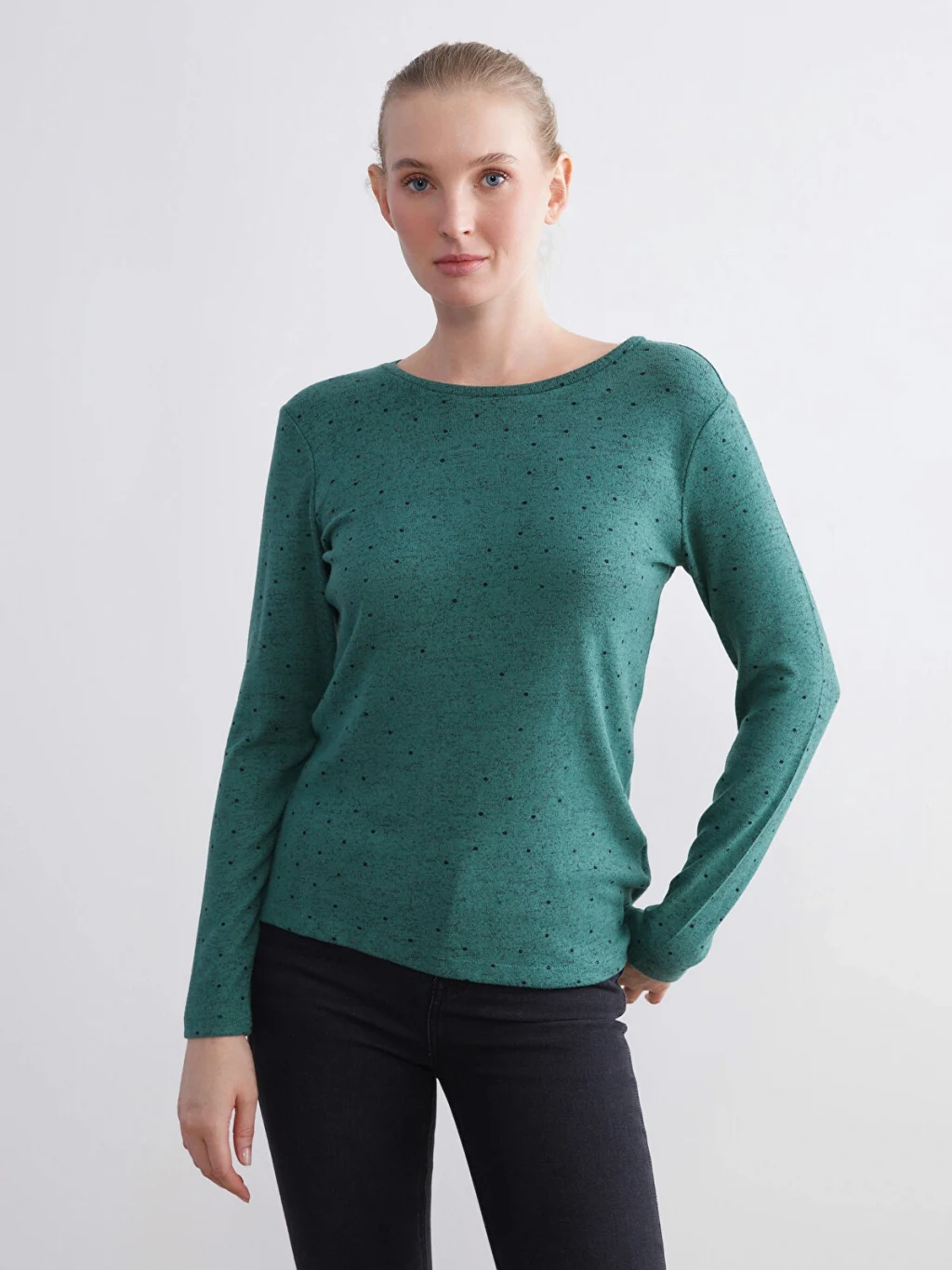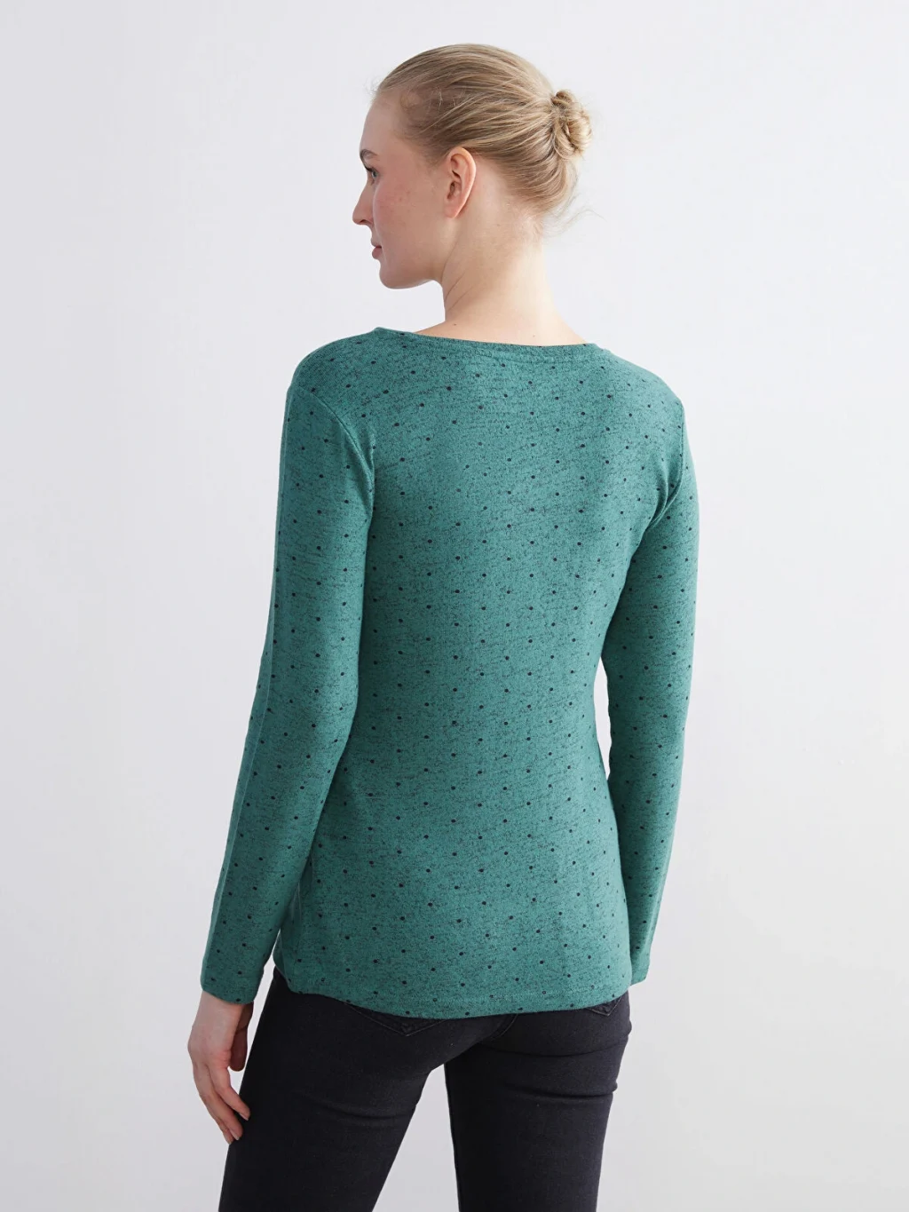 Puantiyeli, bisiklet yaka ve uzun kollu kadın body, dar kalıplıdır ve penye kumaştan üretilmiştir.