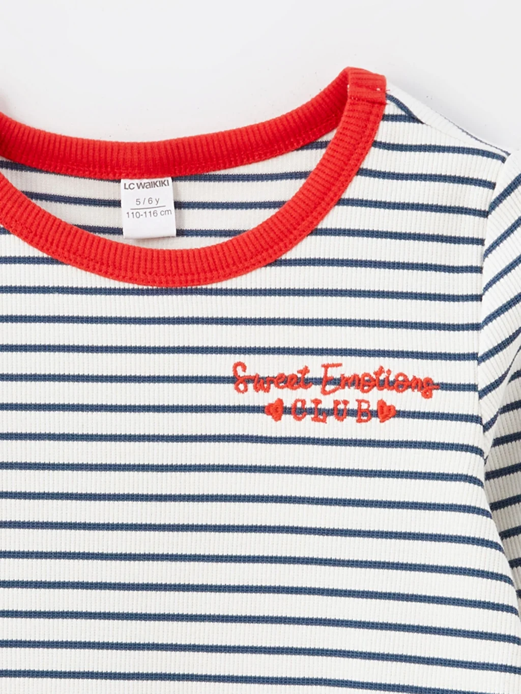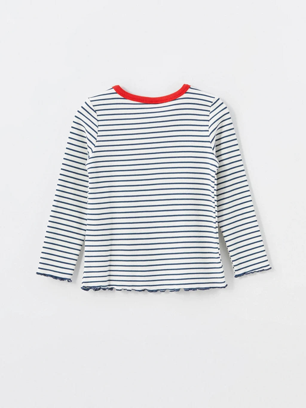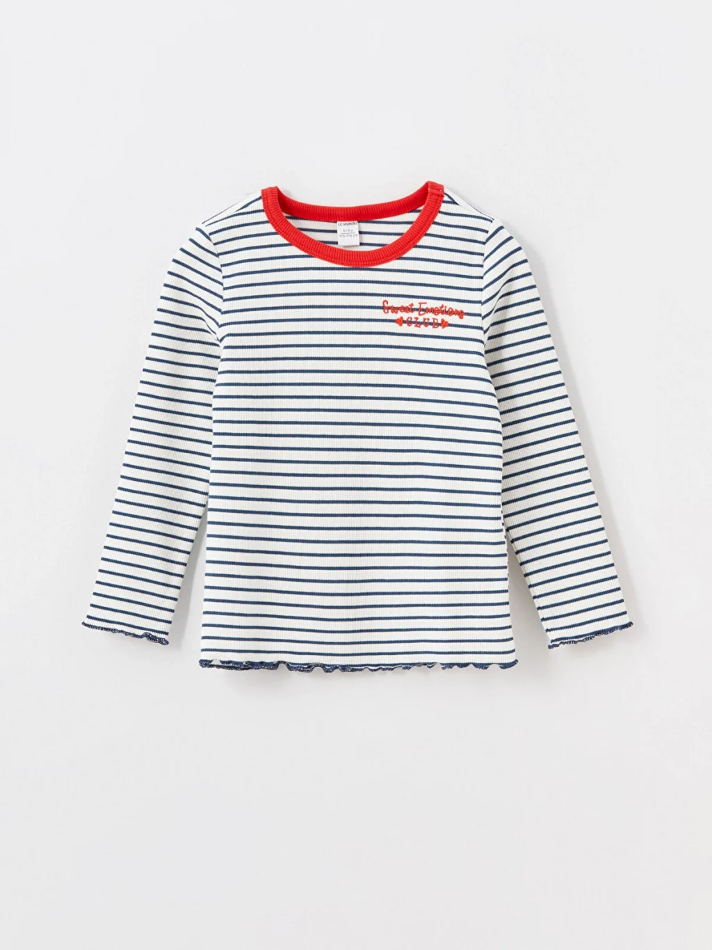 Bisiklet yaka uzun kollu çizgili kız bebek tişört, pamuklu penye kumaştan üretilmiştir. Nefes alabilen ve terletmeyen yapısı ile bebeğinizin rahat etmesini sağlar. Şirin çizgili deseni ile günlük kullanım için idealdir.