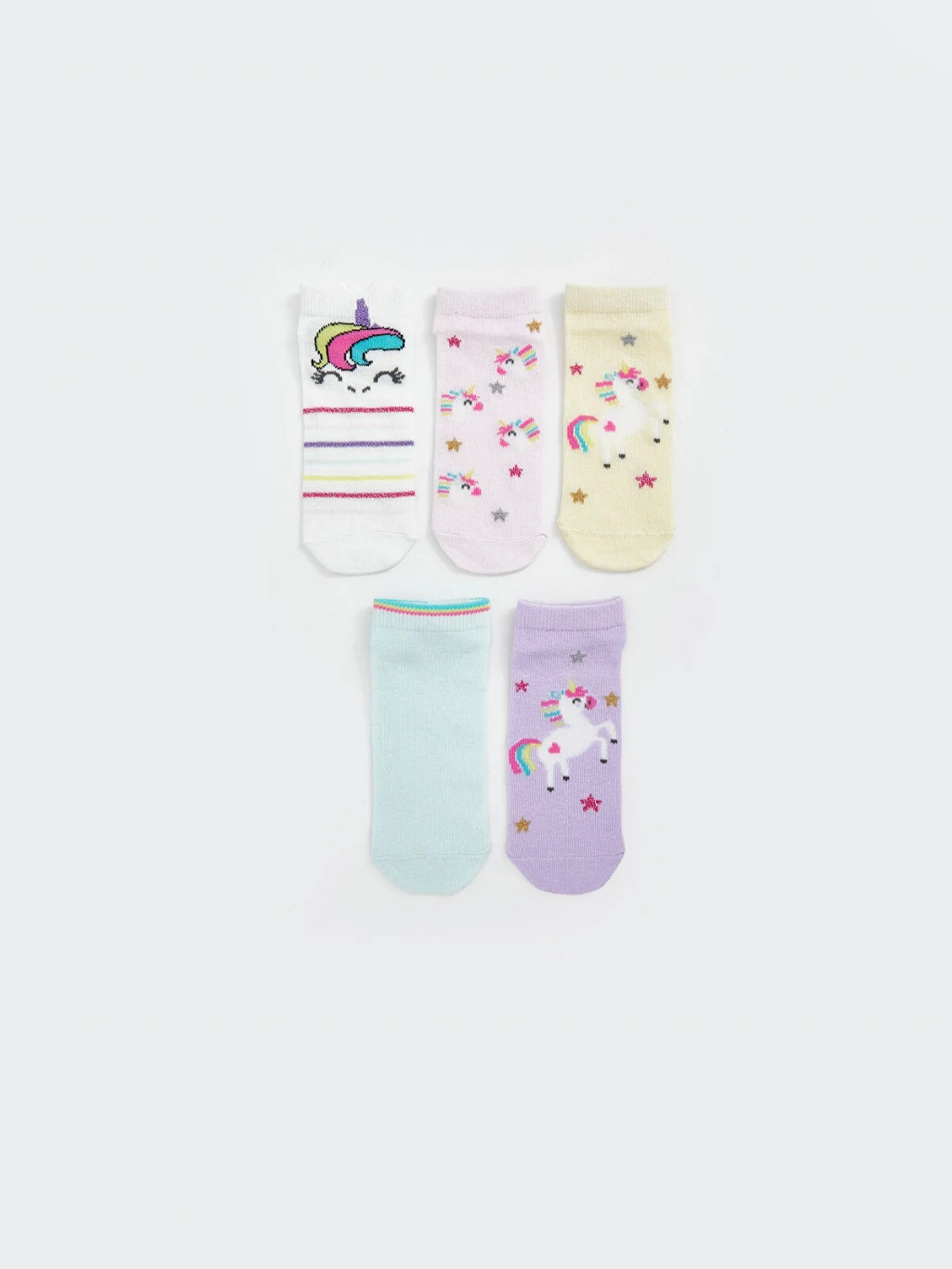 Kız çocuk yıldız ve çizgili gibi farklı desenlere sahip, 5 çift patik çoraptan oluşan bir settir.