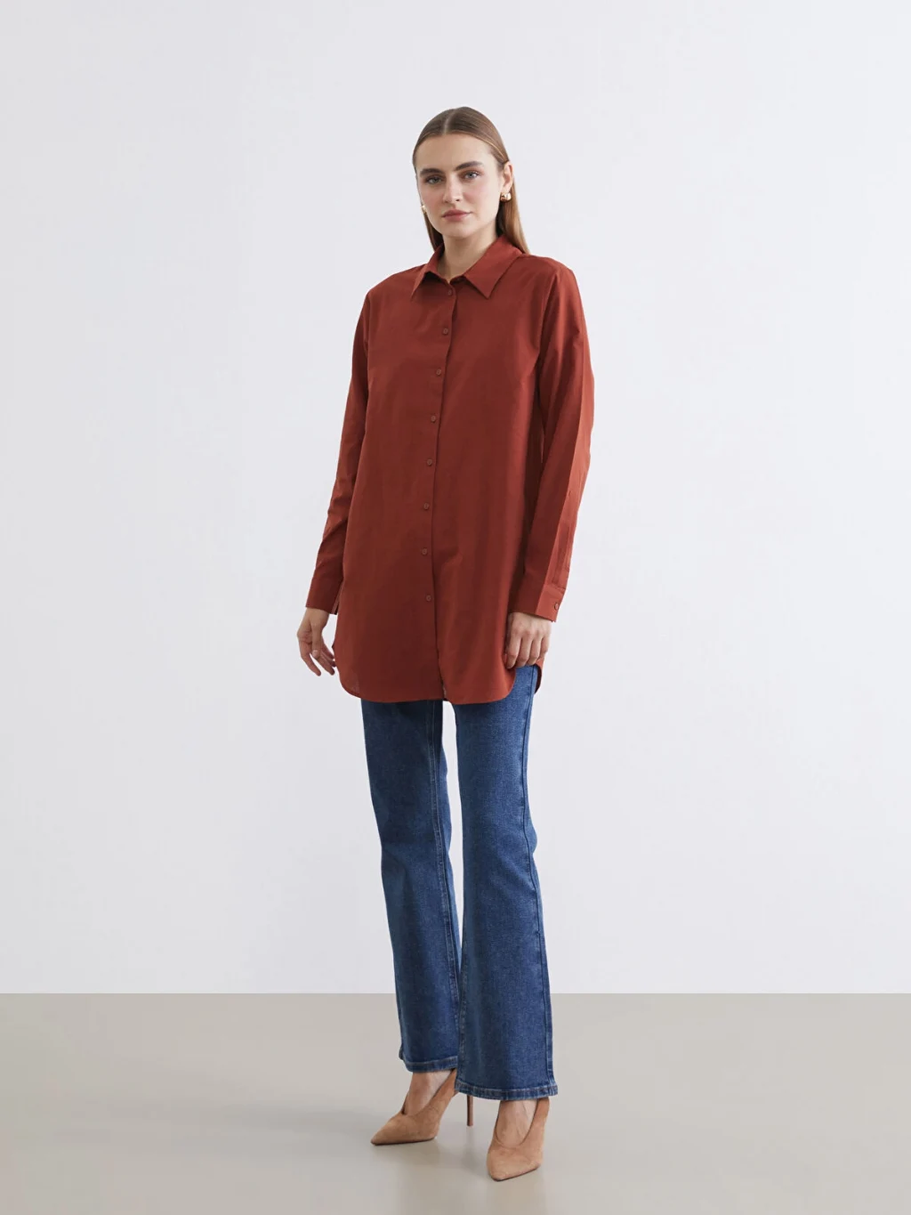 Kadın gömlek tunik, pamuklu kumaştan üretilmiştir. Uzun kollu ve önden düğme kapamalı tasarıma sahiptir.