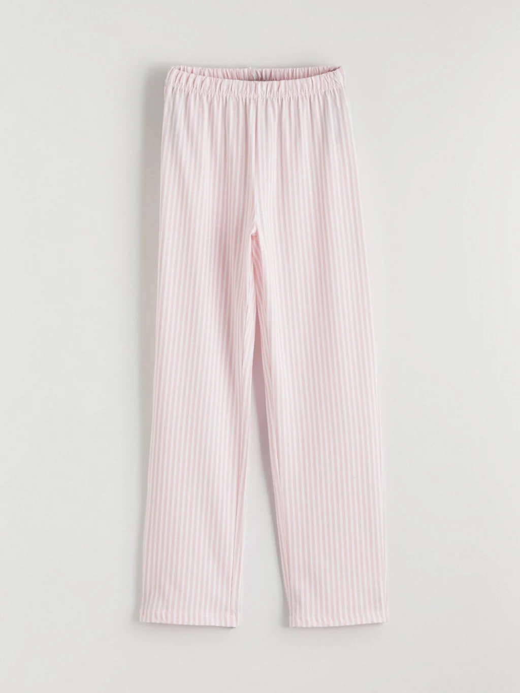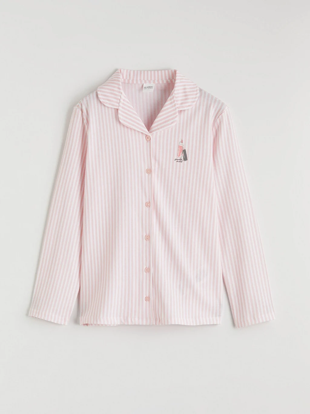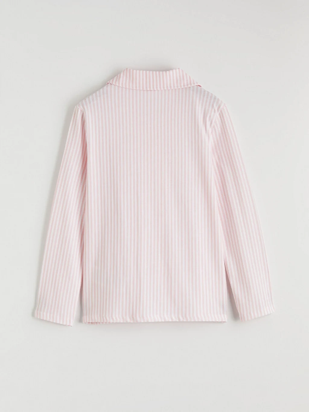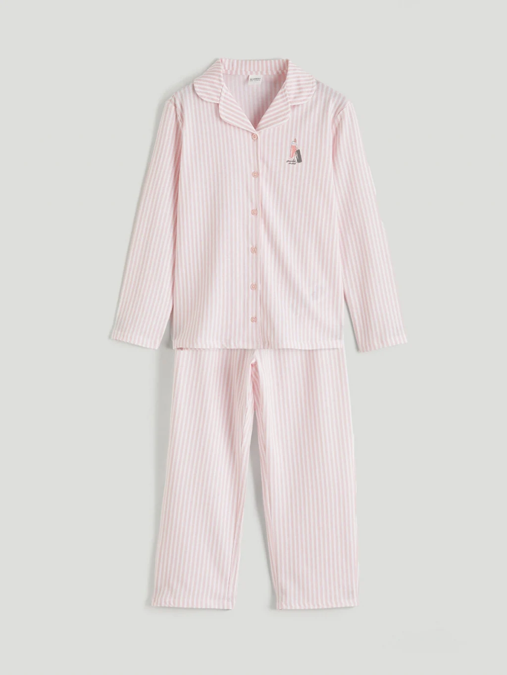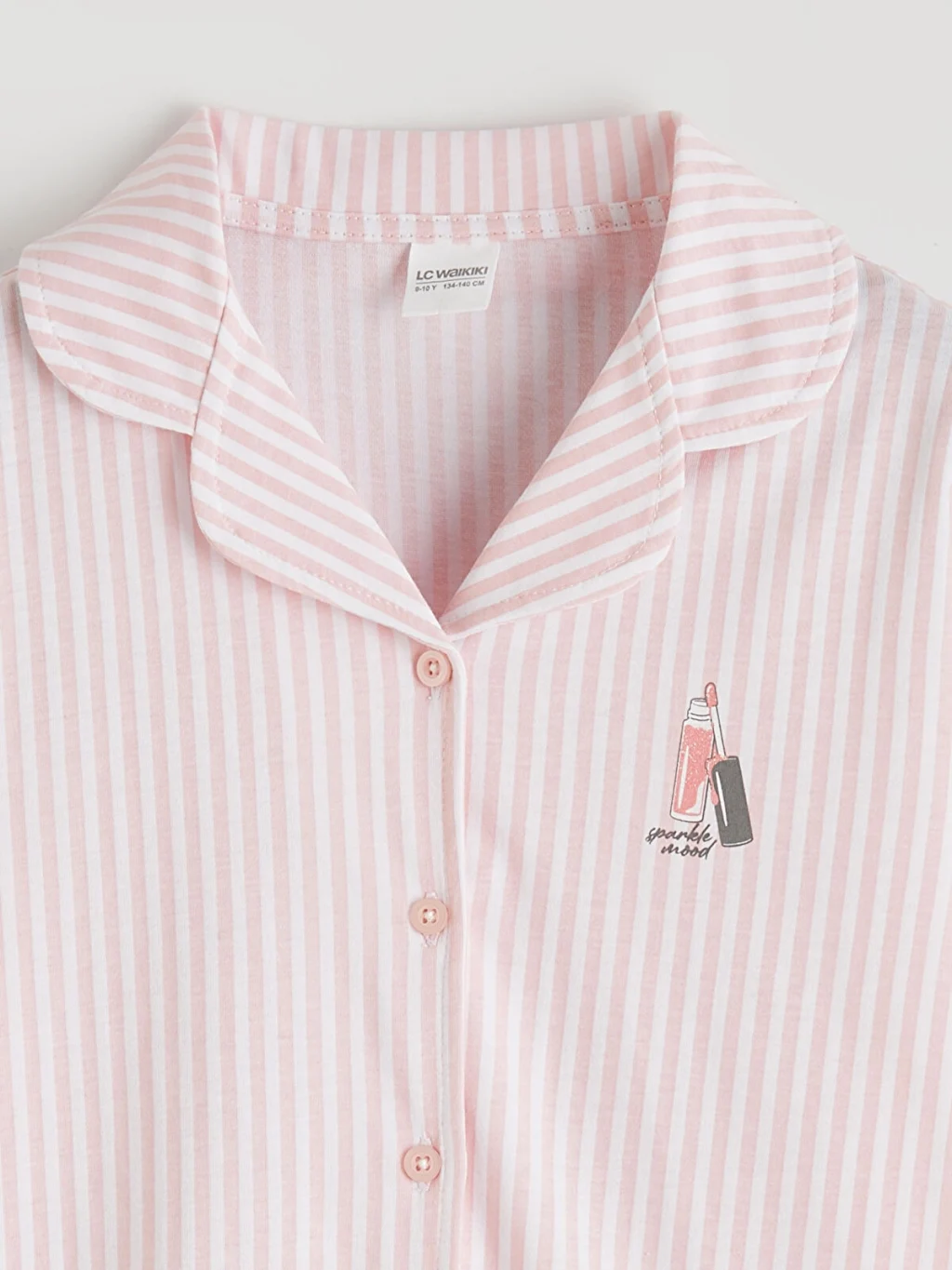 Gömlek yakalı, uzun kollu kız çocuk pijama takımı, önden düğme kapamalı üst ve uzun alttan oluşur. %100 pamuk penye kumaştan üretilmiştir.