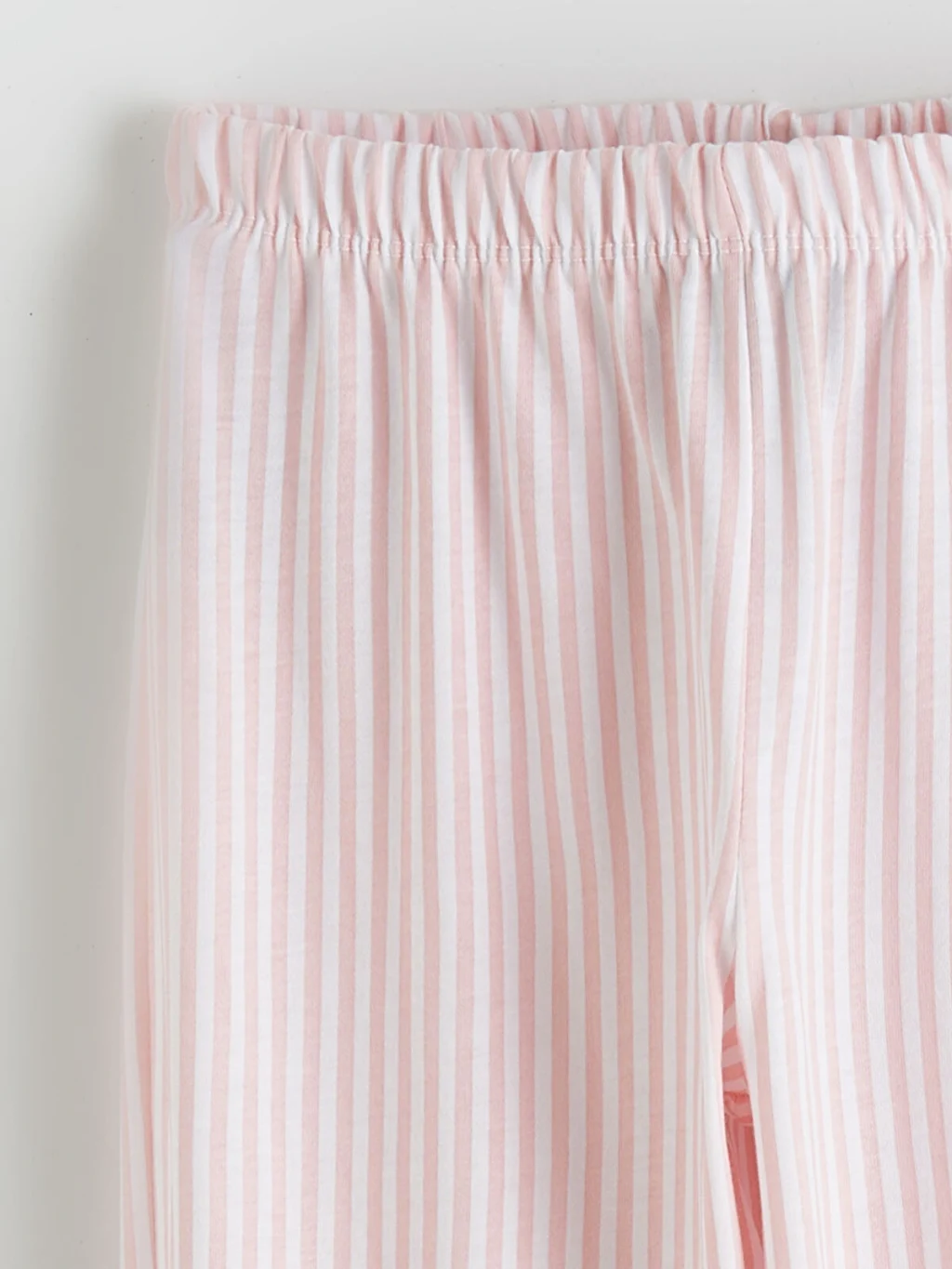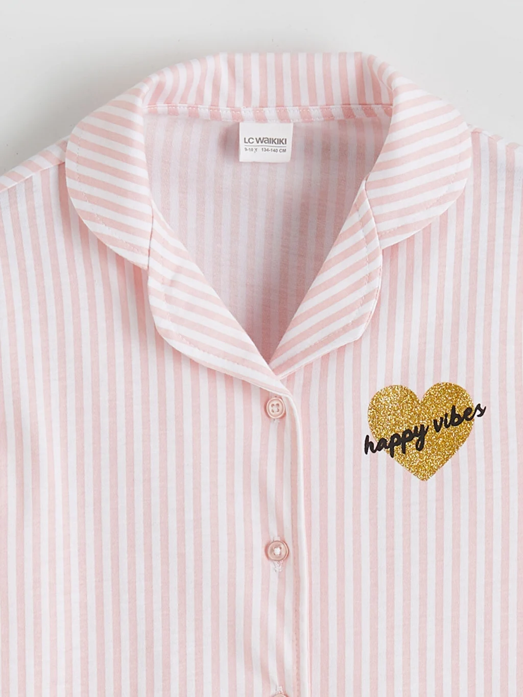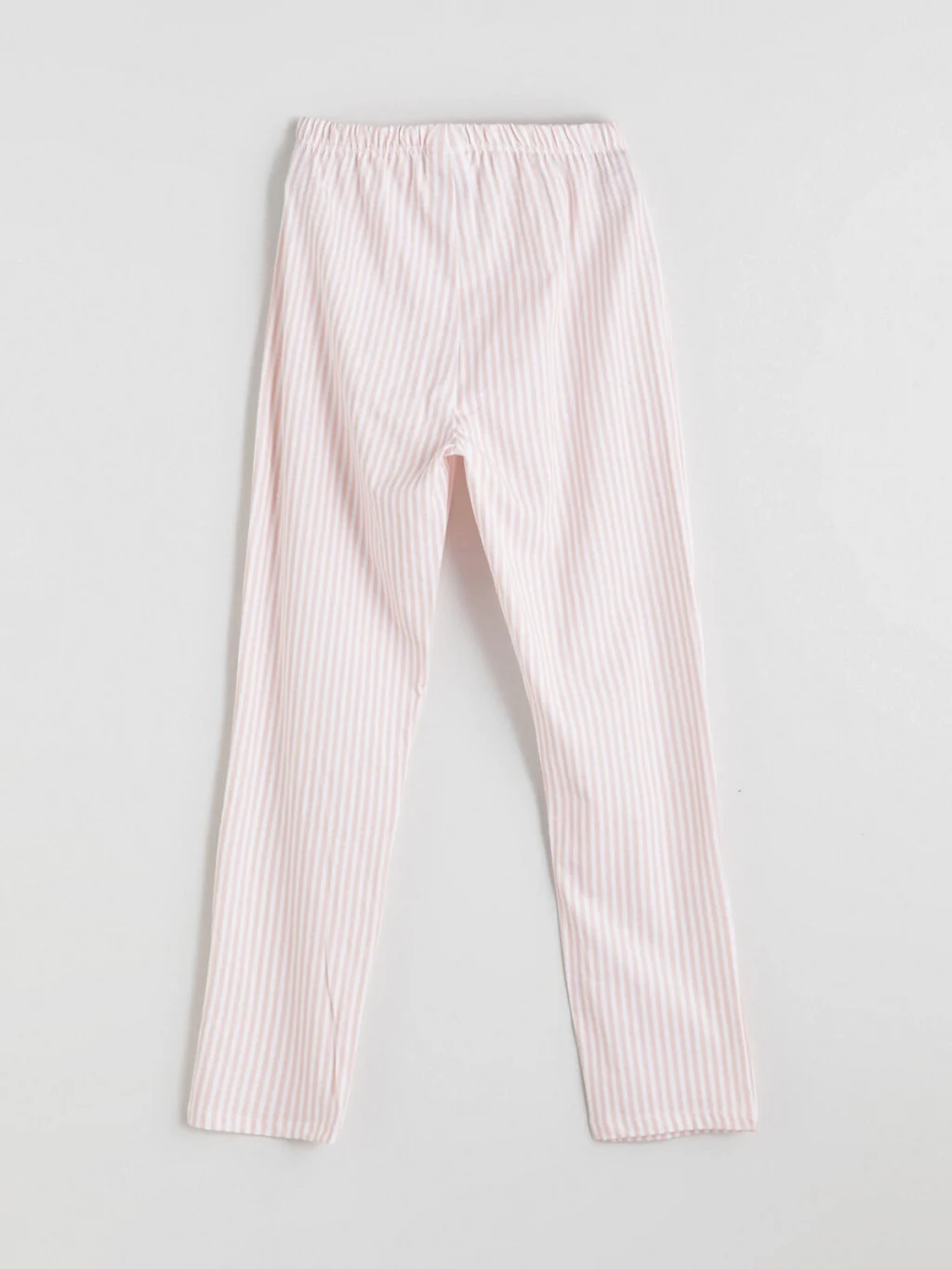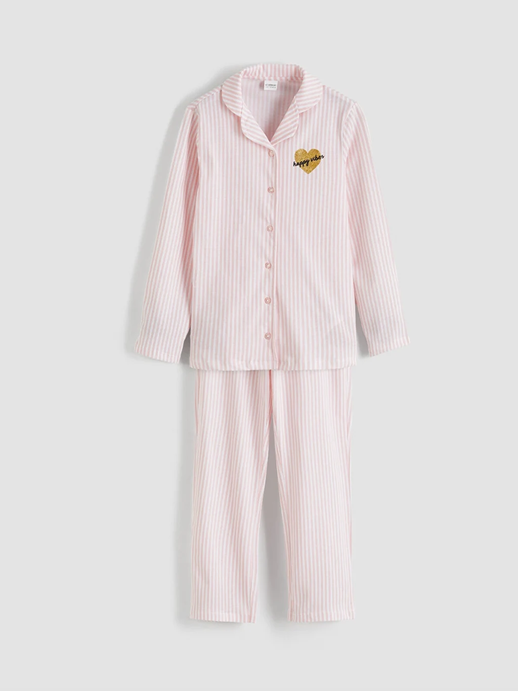 Kız çocuk pijama takımı, uzun kollu düğmeli pijama üst ve beli lastikli pijama altından oluşur. Çizgili tasarıma sahiptir.