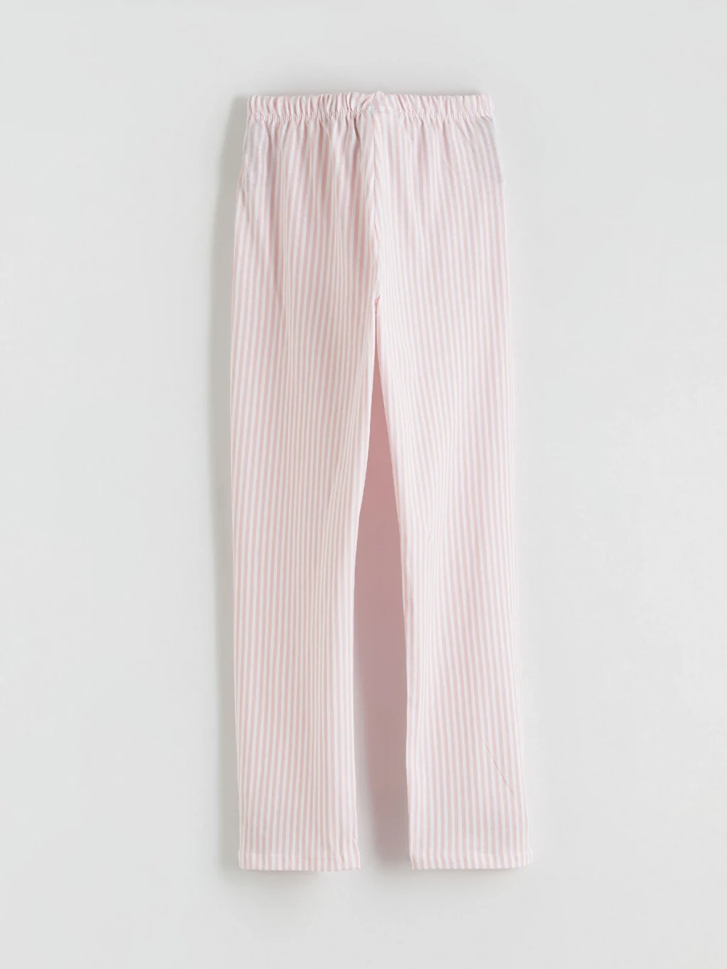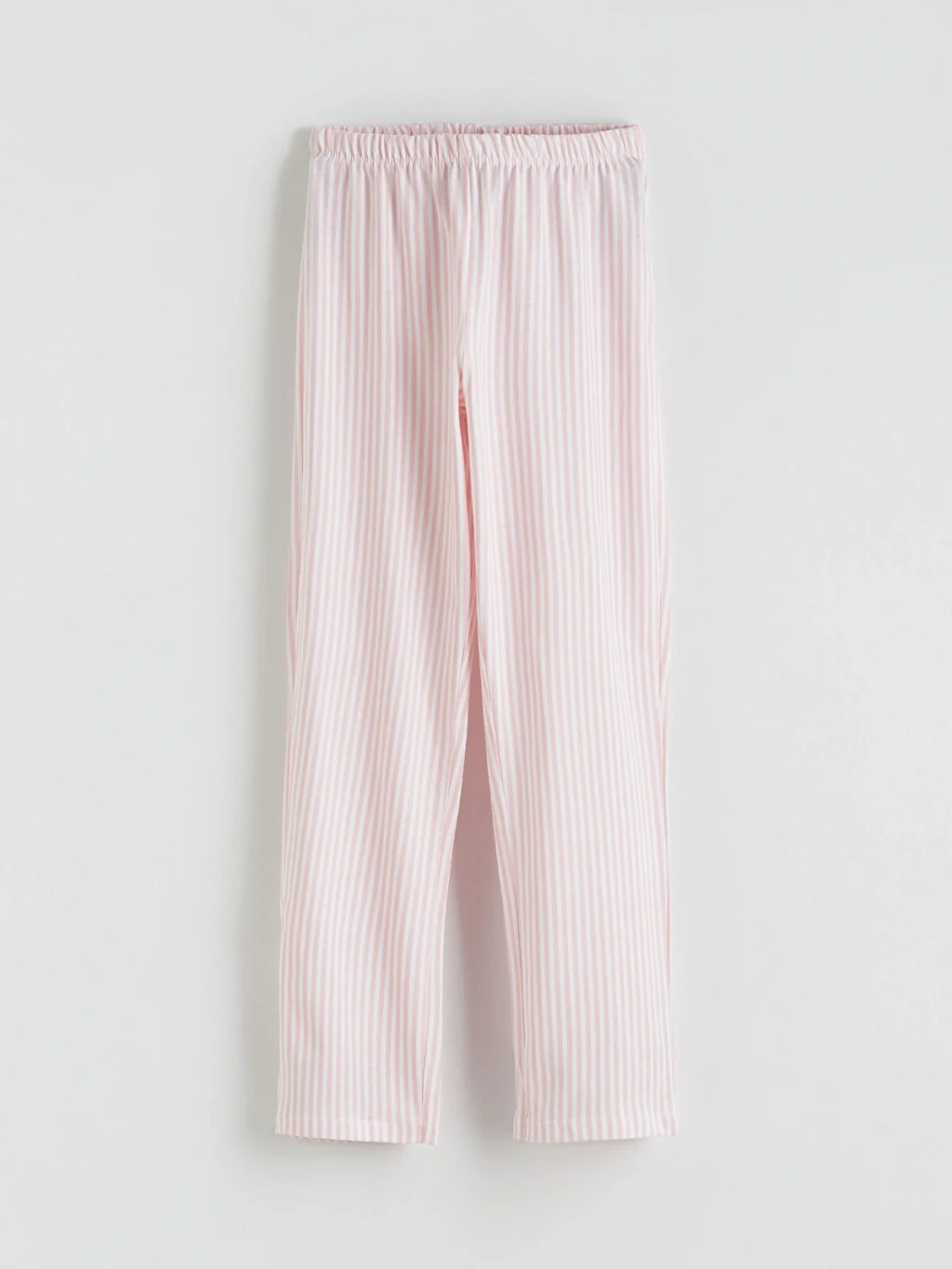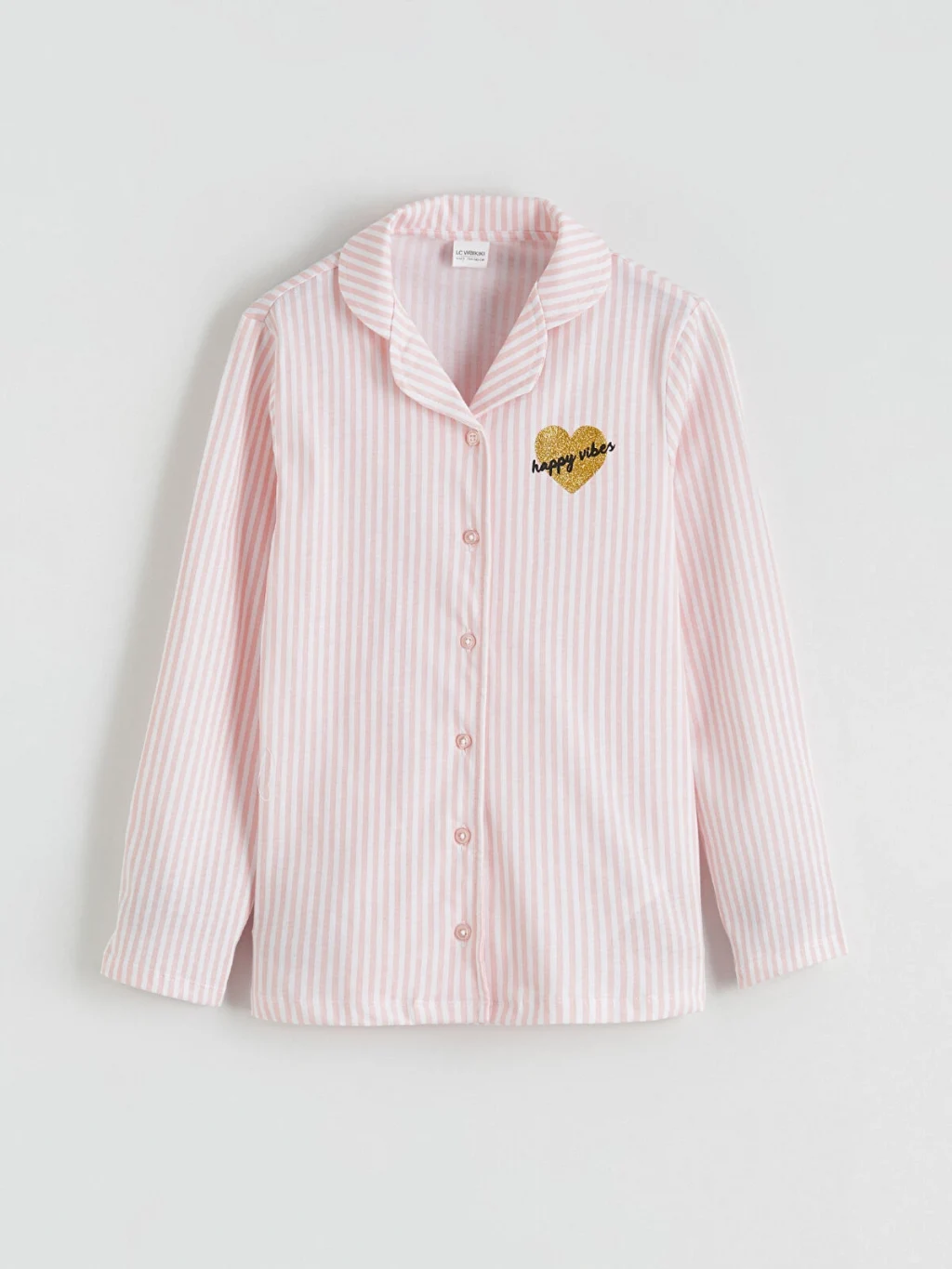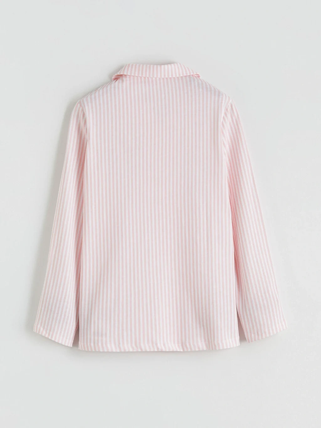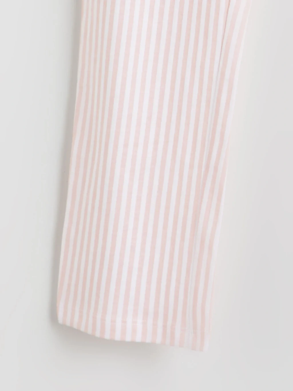 Kız çocuk pijama takımı, uzun kollu düğmeli pijama üst ve beli lastikli pijama altından oluşur. Çizgili tasarıma sahiptir.