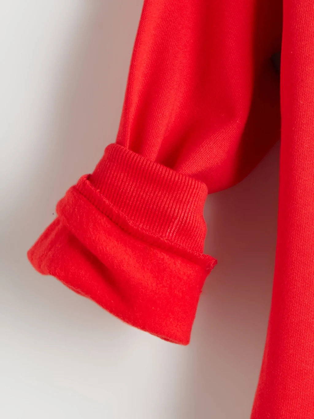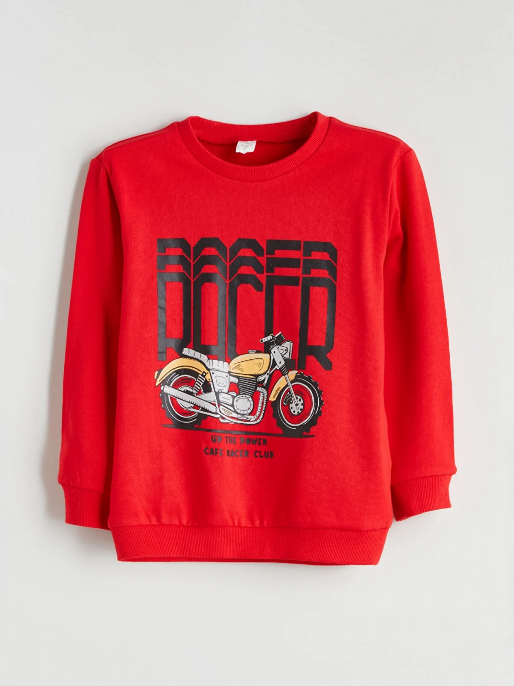 Bisiklet yaka, uzun kollu ve önü baskılı erkek çocuk sweatshirt, 3 iplik şardonlu kalın kumaştan üretilmiştir. Kol ve etek ucu ribanalıdır.