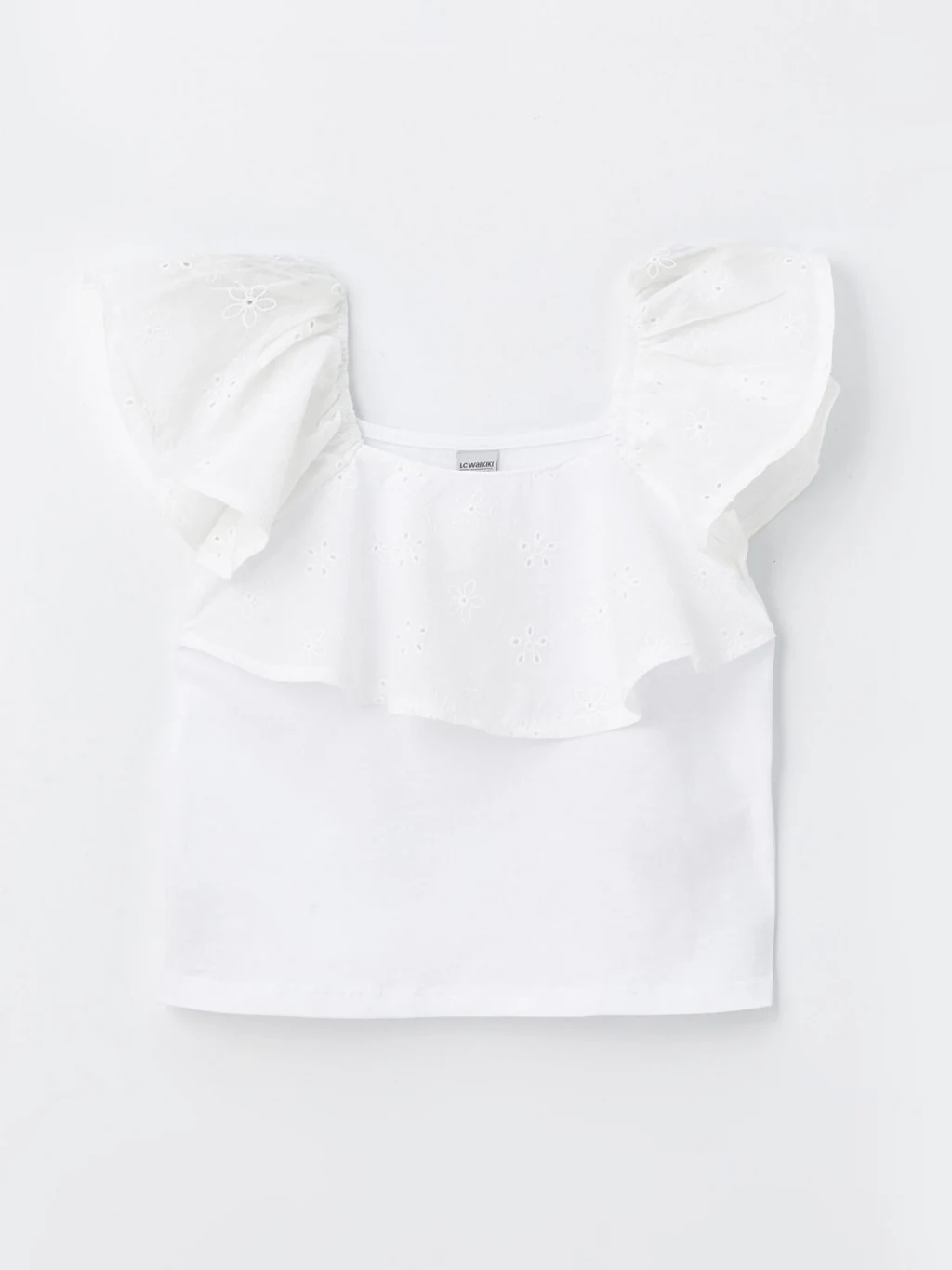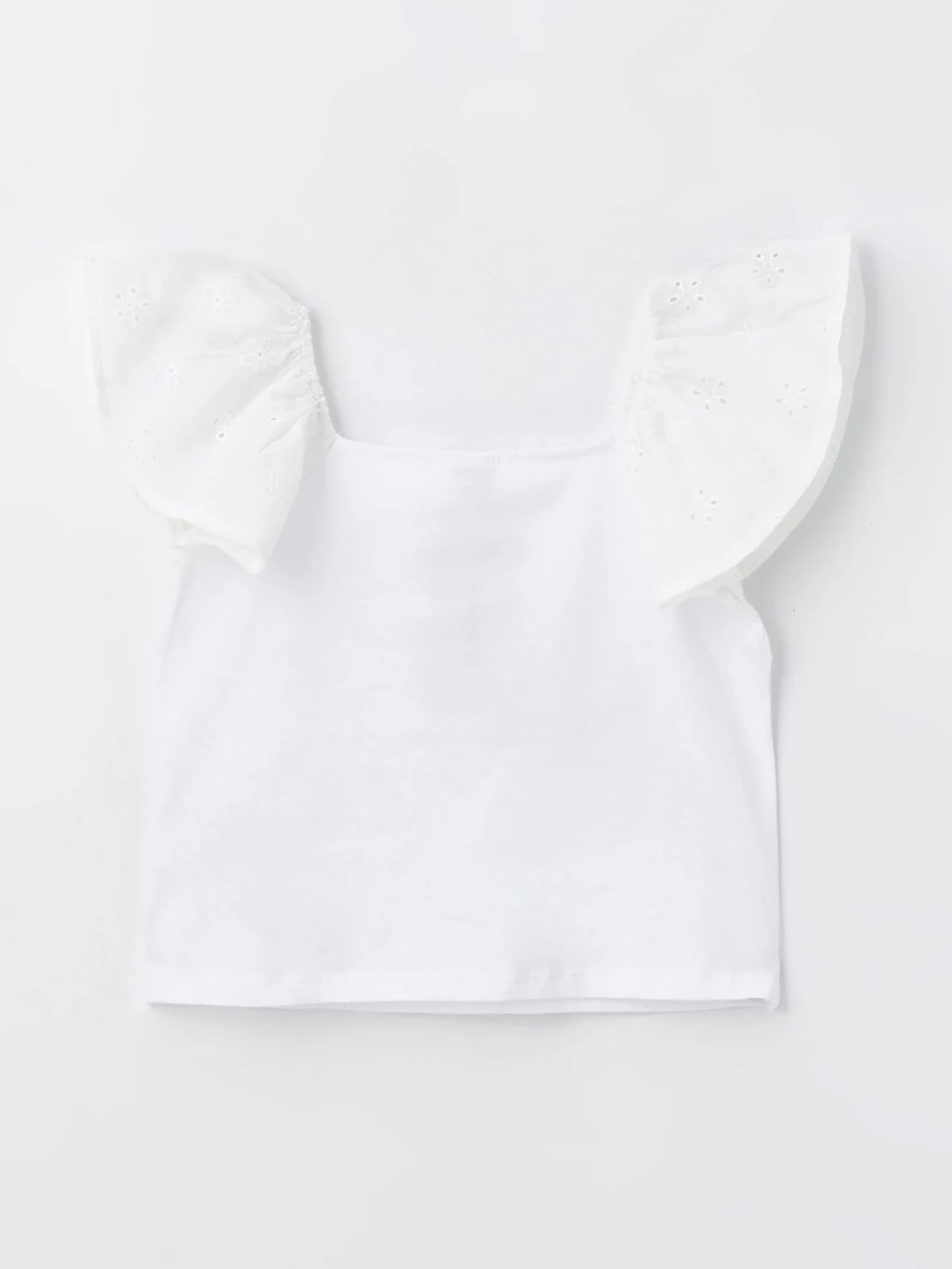 Kare yakalı kız çocuk tişört, penye kumaştan üretilmiştir. Kısa kolları ve göğüs kısmı brode işlemeli volan detaylıdır.