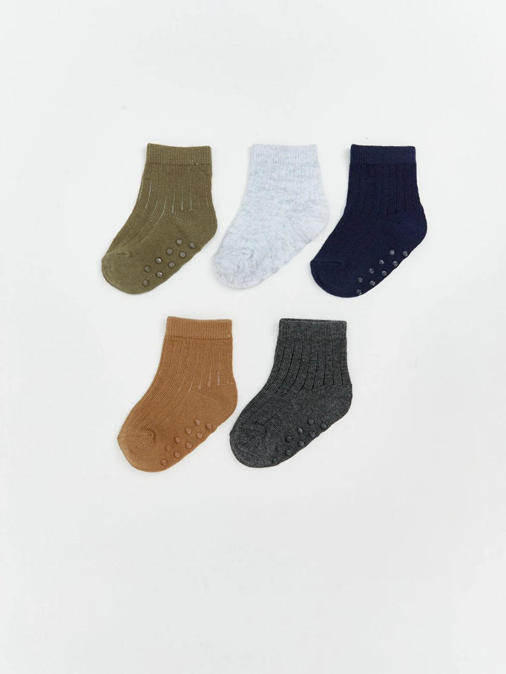 Ribanalı dokuya sahip erkek bebek soket çorap, tabanındaki kaydırmaz noktalar ile tasarlanmıştır. 5'li paket halinde sunulur.
