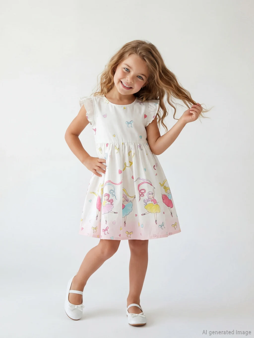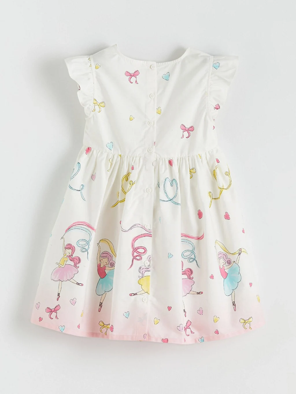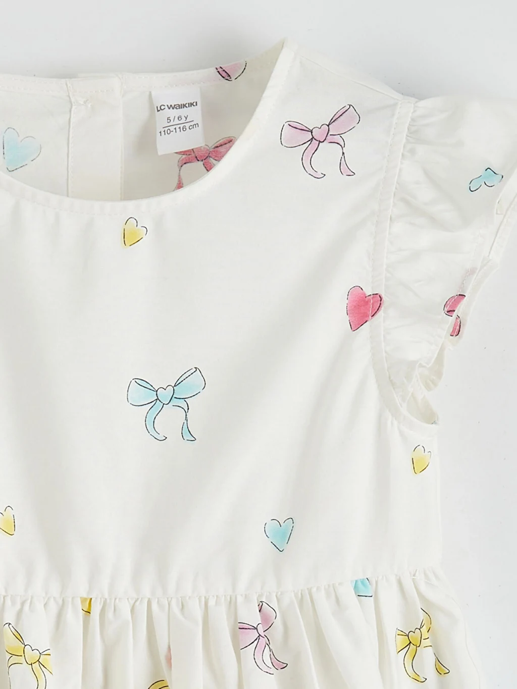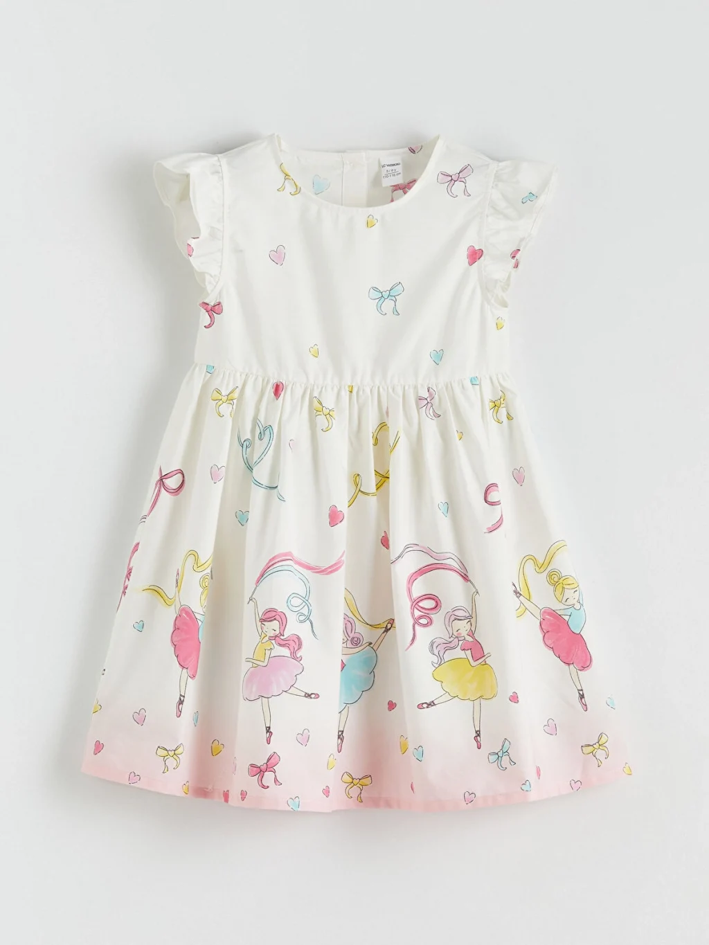 Desenli, bisiklet yaka, kısa ve fırfırlı kollu kız çocuk elbise, %100 pamuk poplin kumaştan üretilmiştir. Beli büzgülüdür, arkadan düğme kapamalıdır.