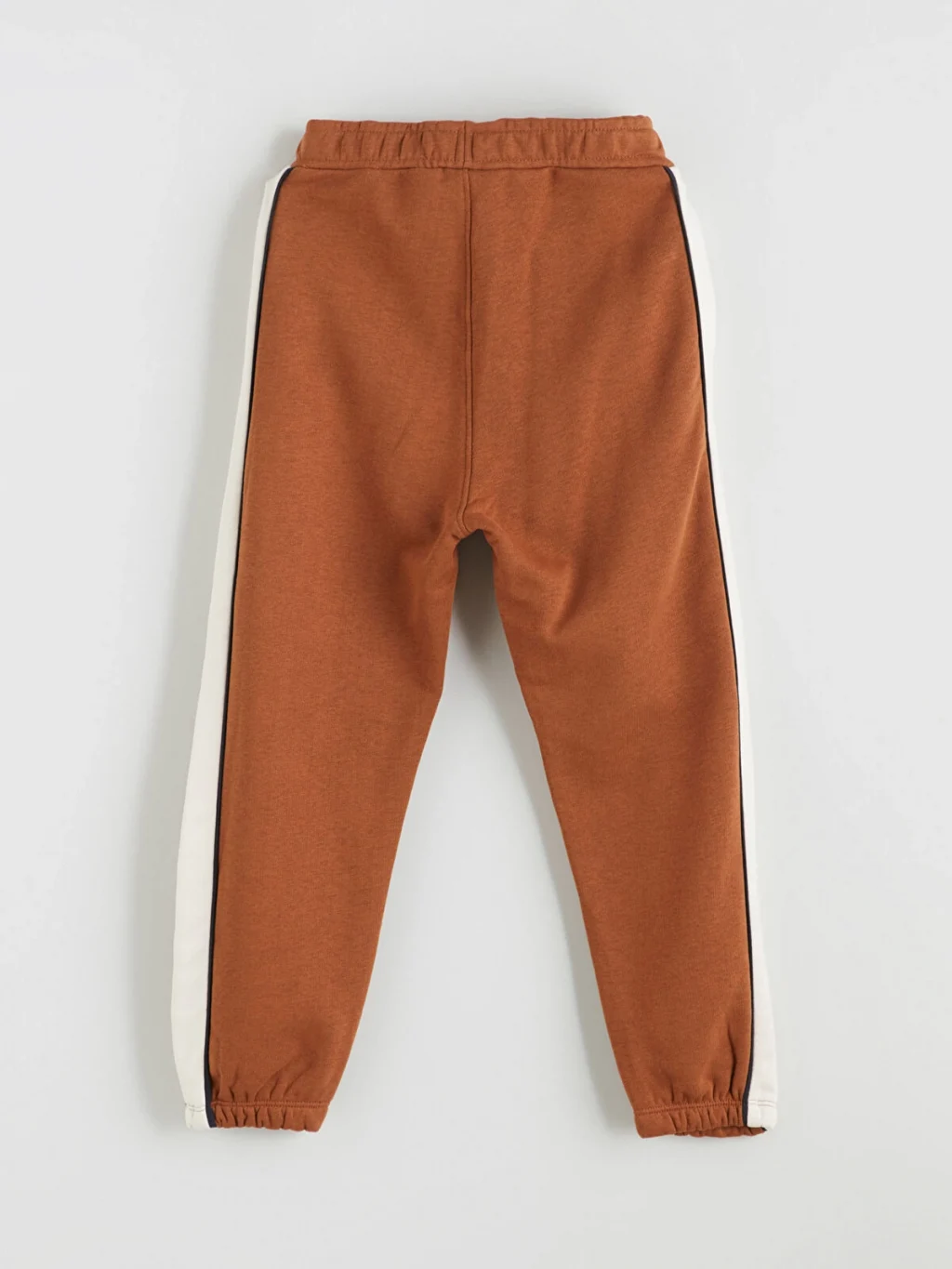 Beli lastikli ve ayarlanabilir ipli, yan cepli ve paçaları ribanalı erkek çocuk jogger eşofman altı, pamuk karışımlı 3 iplik kumaştan üretilmiştir. Beli lastikli ve ayarlanabilir bağcıklı erkek çocuk jogger eşofman altı, 3 iplik kumaştan üretilmiştir. Paçaları ribanalı, yanları şeritli ve önü baskılıdır.