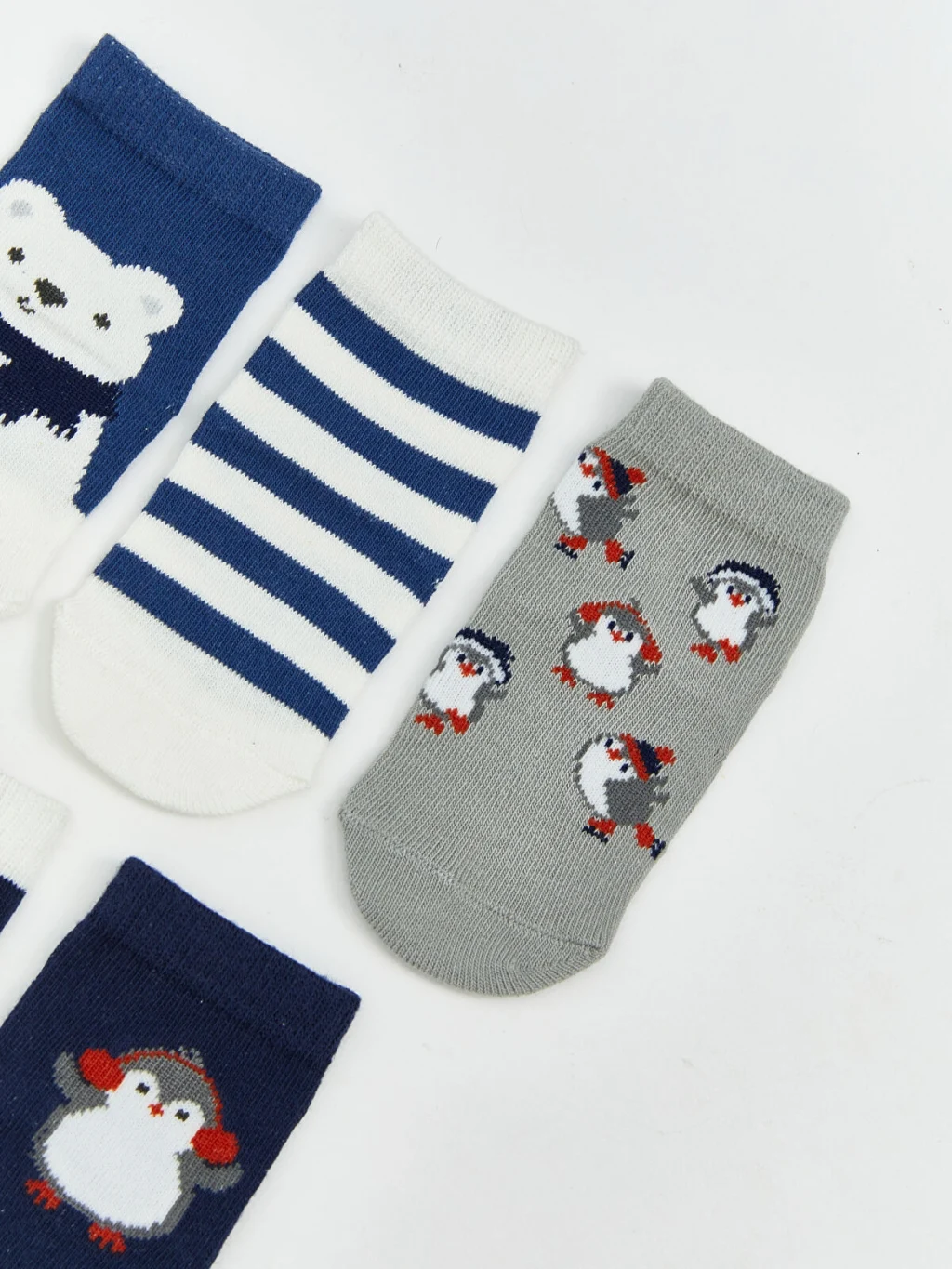 Farklı desenlere sahip erkek bebek soket çorap; çoraplar hayvan figürlü ve çizgili desenlidir.