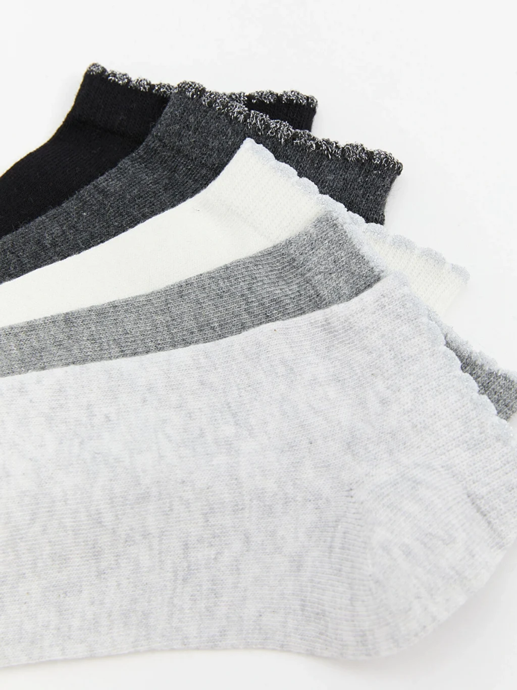 Pamuk karışımlı elyaftan üretilen patik çoraplar, yumuşak ve konforlu bir dokuya sahiptir. Düz, sade tasarımıyla doğal bir görünüm sunar ve 5 çift patik çoraptan oluşmaktadır.