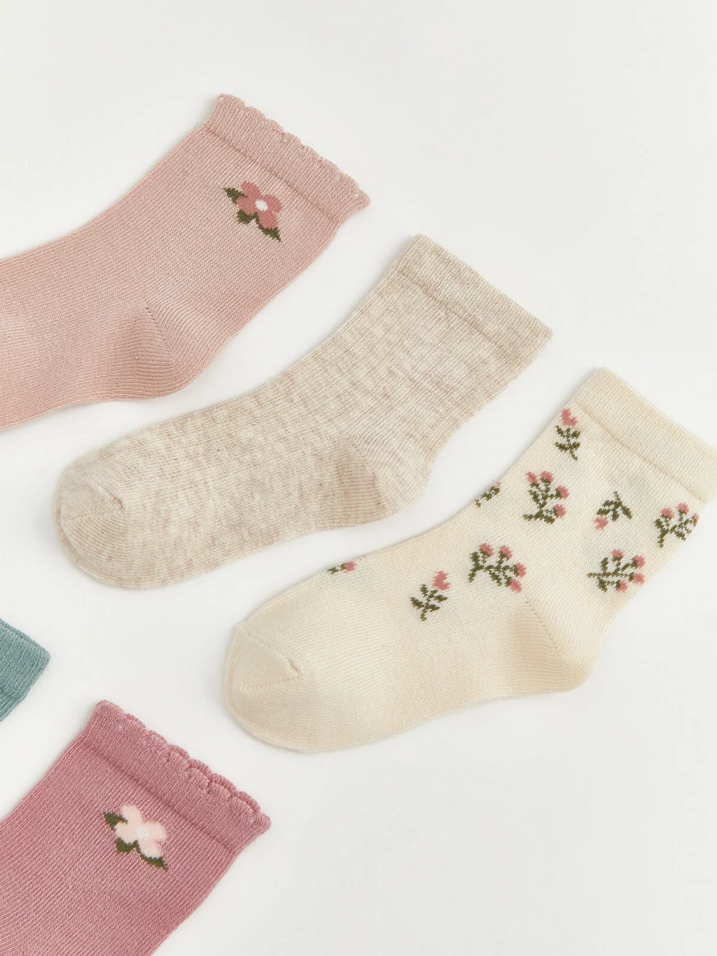 Kız bebek için beşli soket çorap seti, çiçek desenli, fitilli ve düz dokulu farklı tasarımlardan oluşur; bilekleri fırfır detaylıdır.