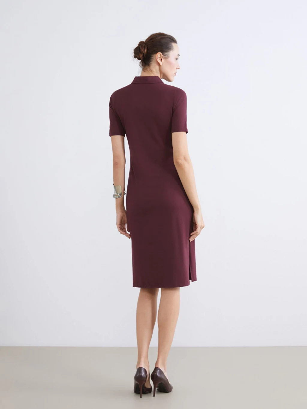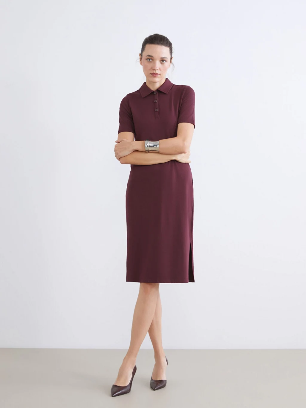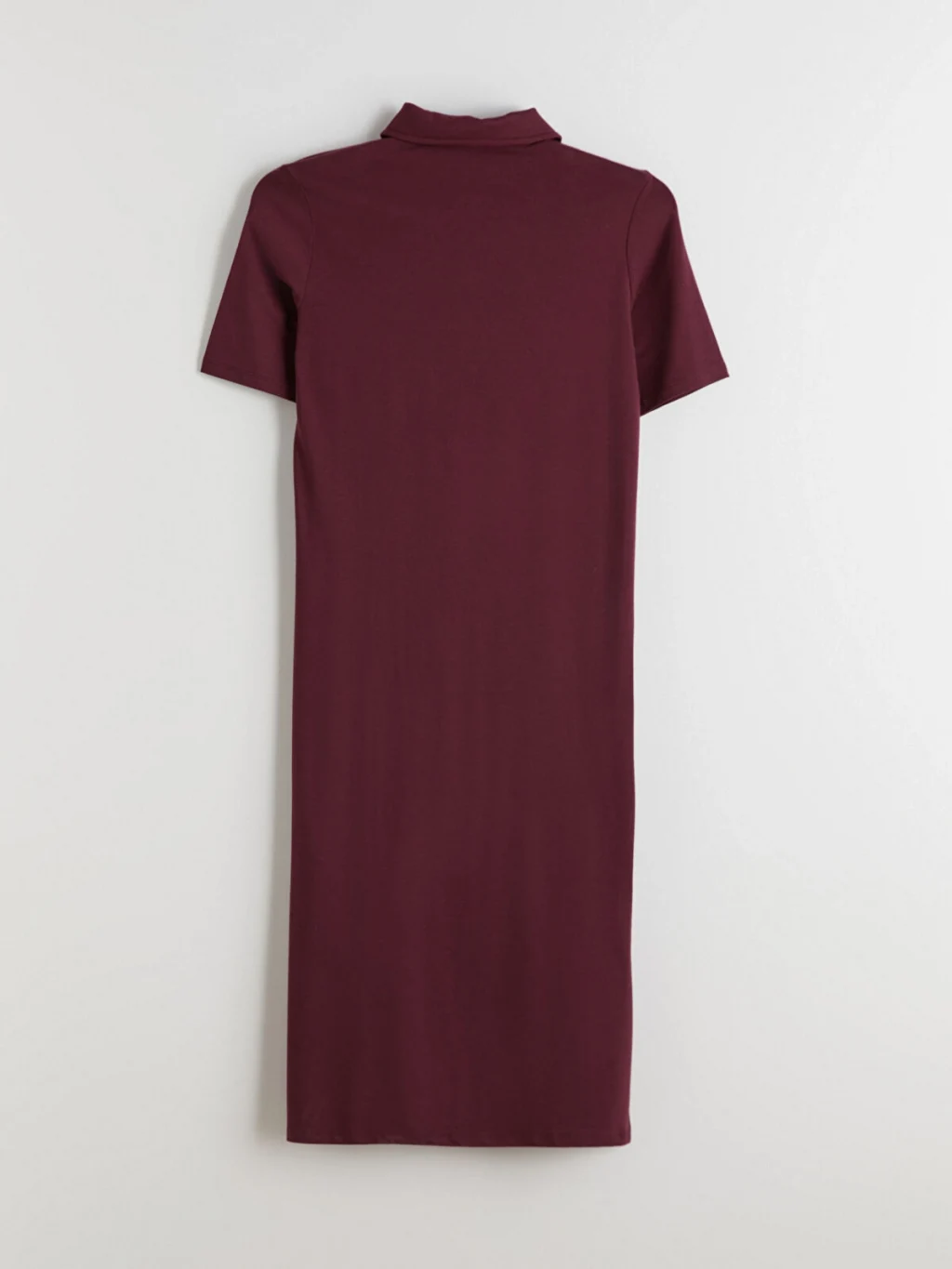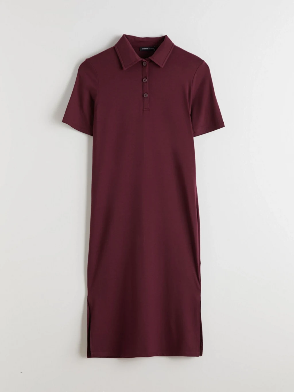 Polo yakalı, kısa kollu kadın elbise, interlok kumaştan üretilmiştir. Önden düğme kapamalıdır ve etek ucunda yırtmaç detayı bulunur.