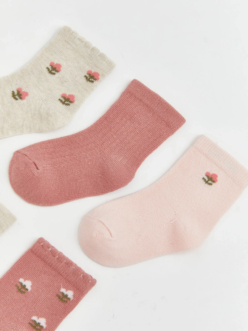 Kız bebek için, bazıları çiçek desenli, bazıları ise desensiz tasarımlardan oluşan beşli soket çorap seti.