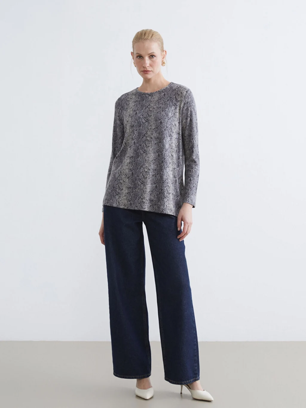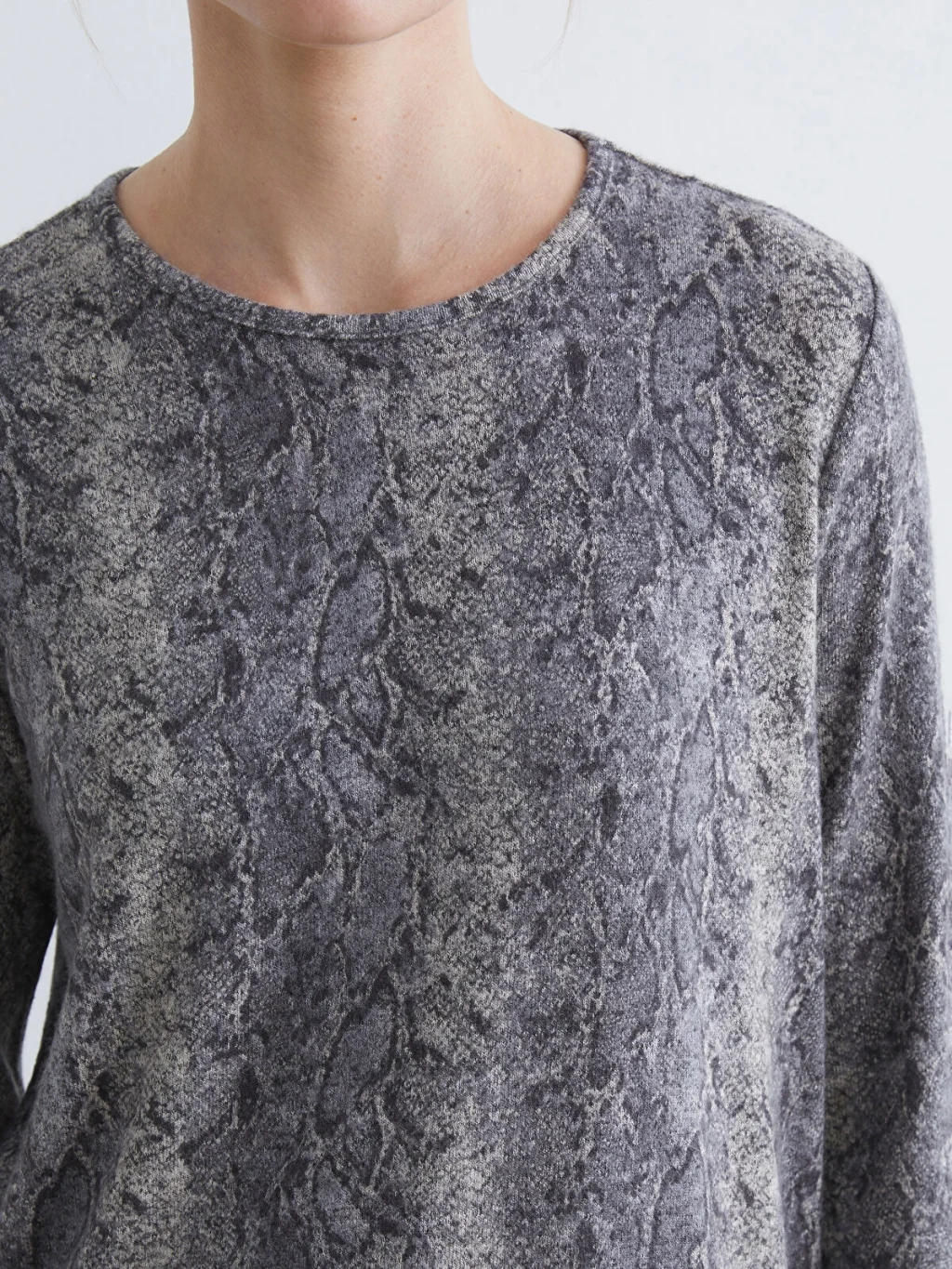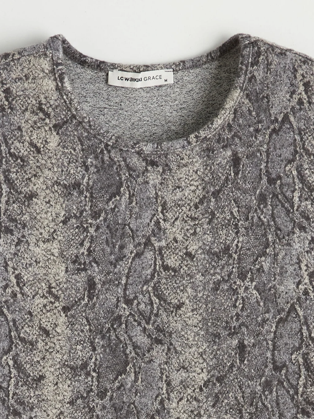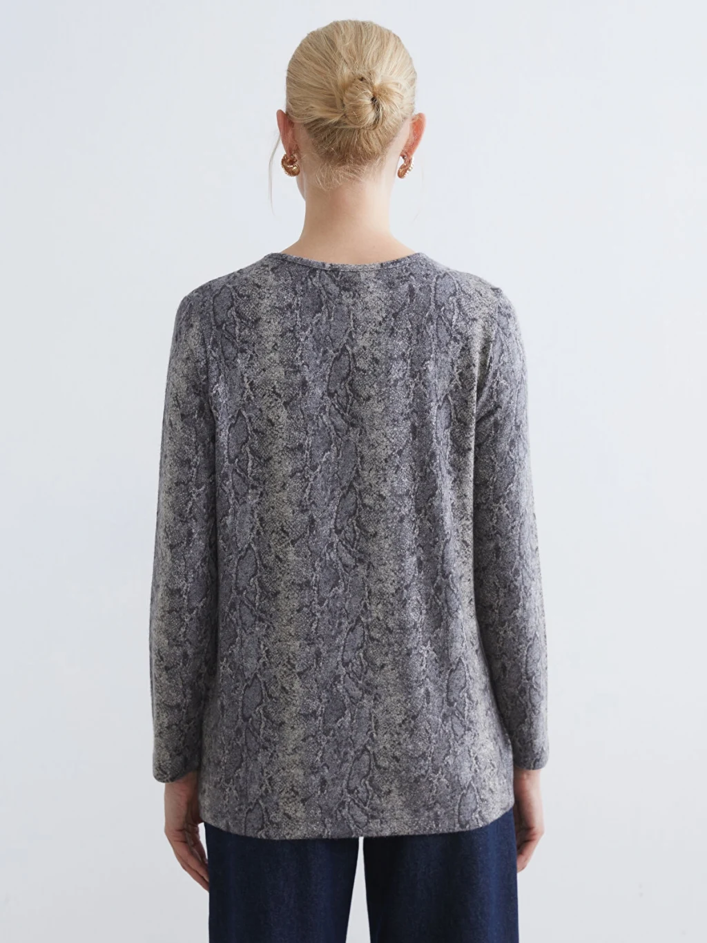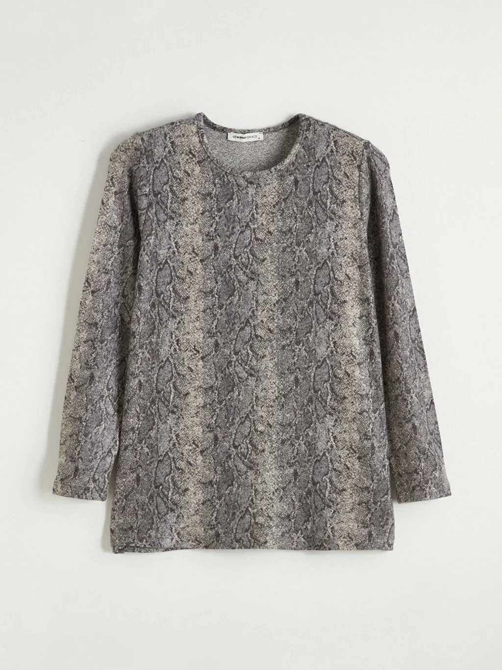 Standart kalıplı, bisiklet yakalı ve uzun kollu kadın tişört, yılan derisi desenli kumaştan üretilmiştir.