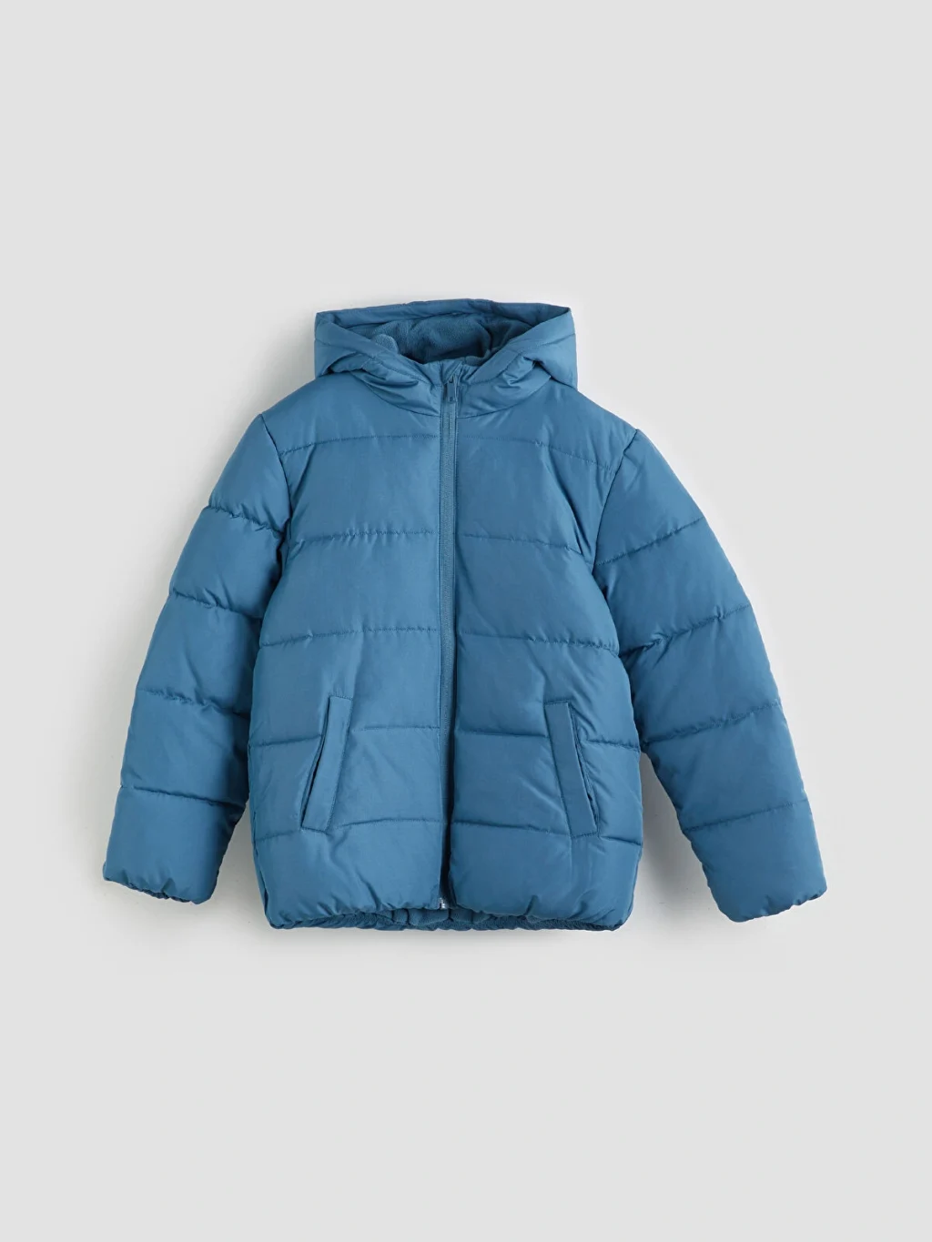 Sabit kapüşonlu, uzun kollu ve fermuar kapamalı erkek çocuk şişme mont. Kapitone dikişli tasarıma ve yan ceplere sahiptir.