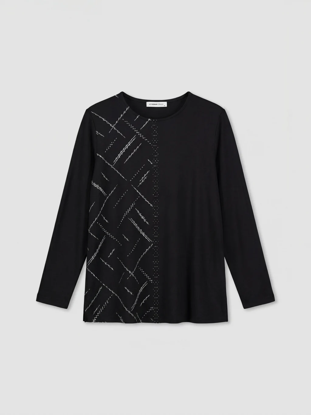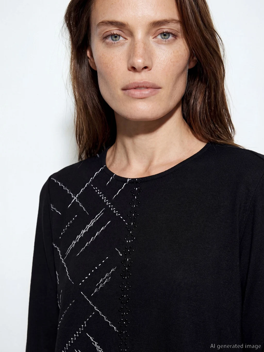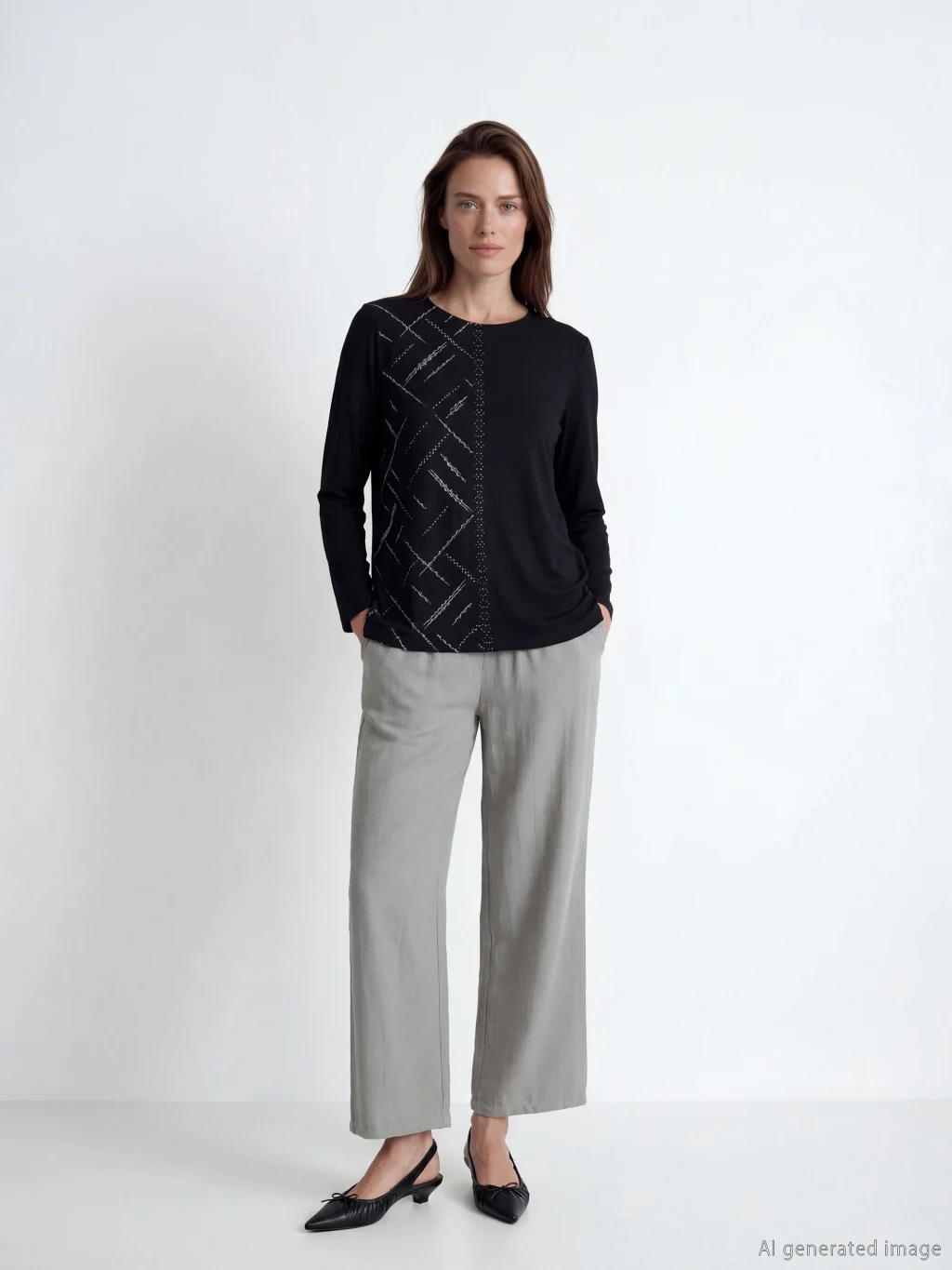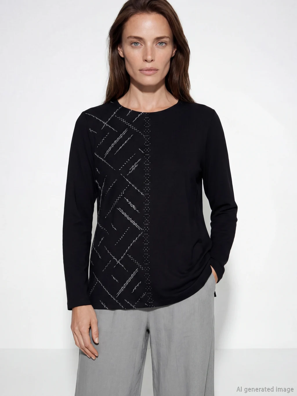 Bisiklet yaka ve uzun kollu kadın bluz, standart kalıptadır. Ön kısmında baskı ve taş detayları bulunur.